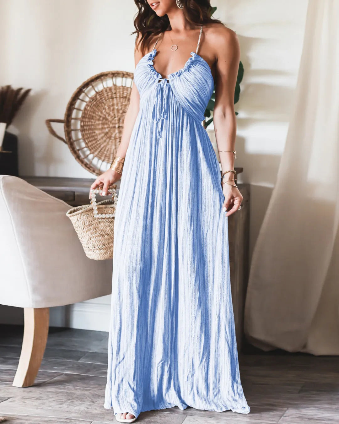 Introducing Sleeveless Print Tie Pleated Dress. now available in a new color! This playful and comfortable maxi dress is the perfect addition to your wardrobe. Express your unique style with our favorite dress.