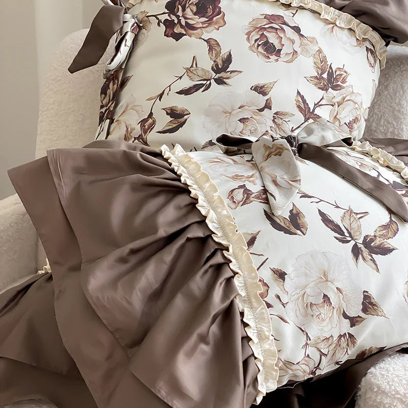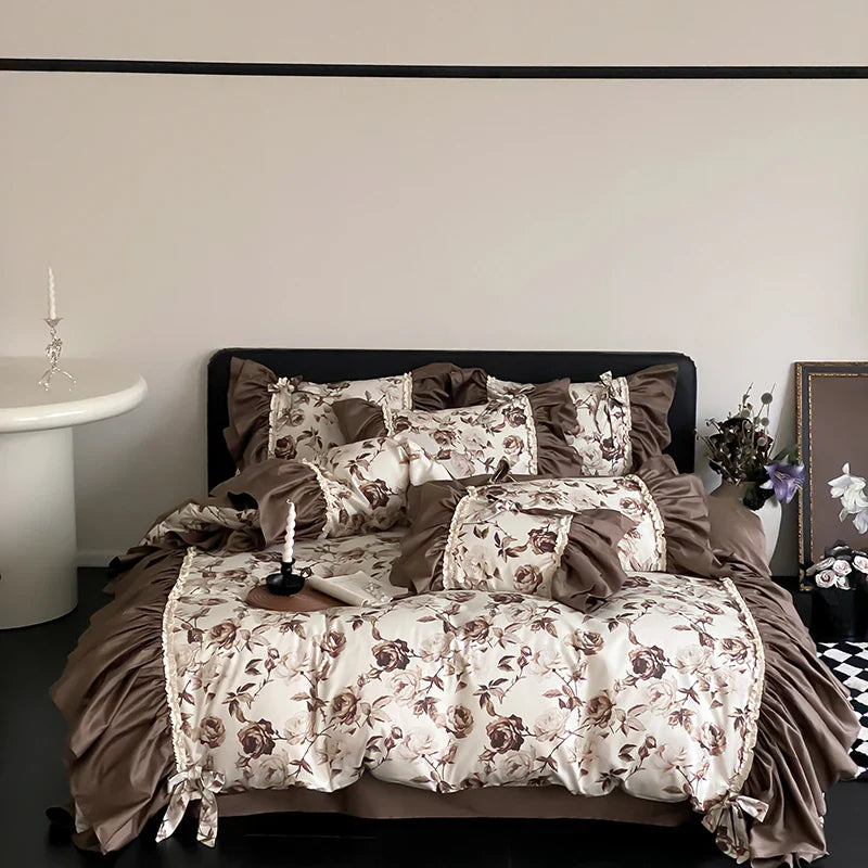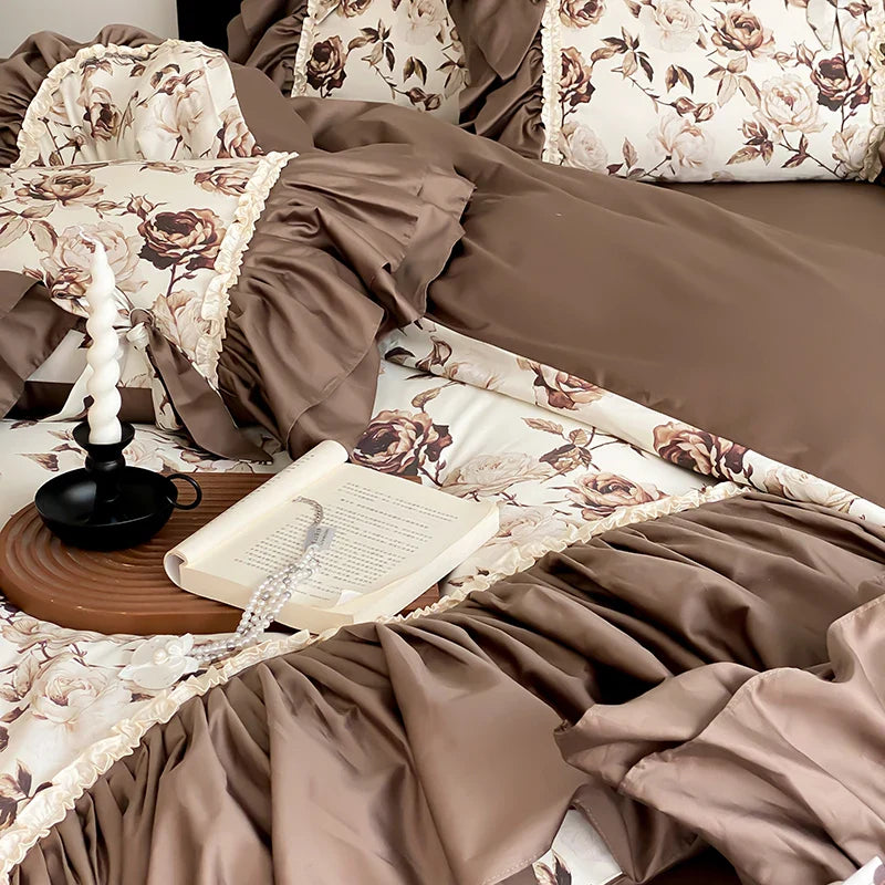 1000TC Egyptian Cotton Brown French Vintage Flowers Printing Bedding Set Duvet Cover Set Flat/Fitted Bed Sheet Pillowcases 4Pcs