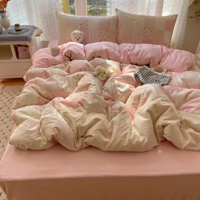 2025 new small floral cloud wrinkle double yarn bed four-piece set princess lace quilt cover three-piece bed sheet set