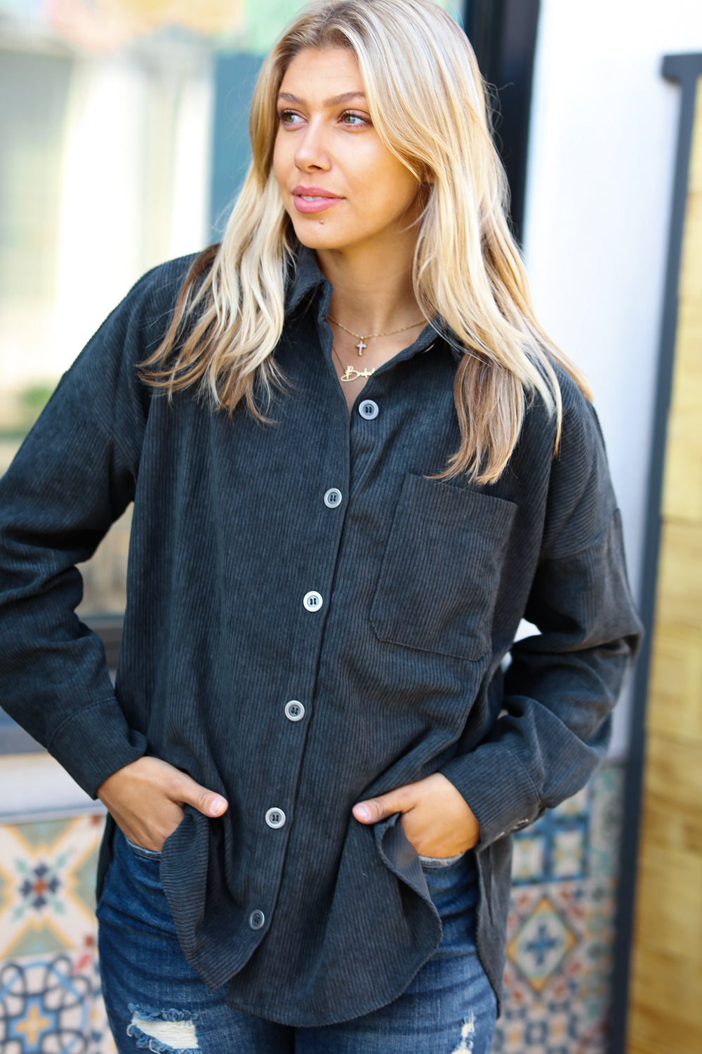 Update your basics with this collared oversized corduroy shacket with side slits. front chest pockets and a button-up closure. Designed  with a hi-lo hem and long button-cuff sleeves. step into fall with style with this mid-weight shacket!