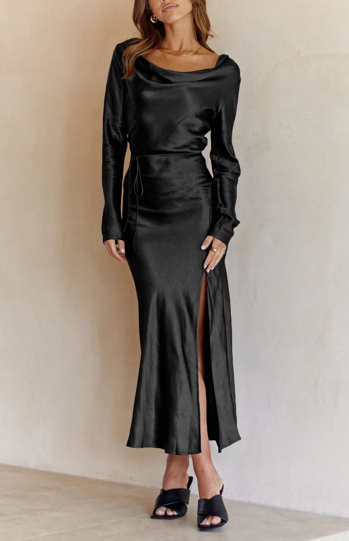 Black Drape Neck Tie Waist Long Sleeve Slit Dress