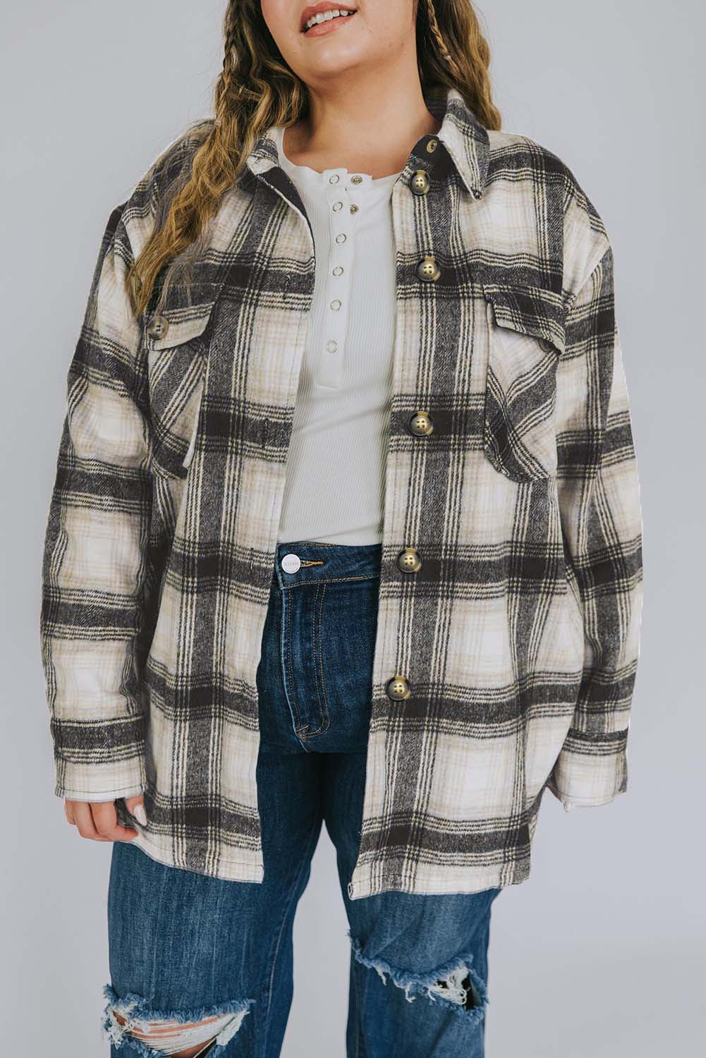 Black Plus Size Brushed Plaid Flap Pocket Shacket