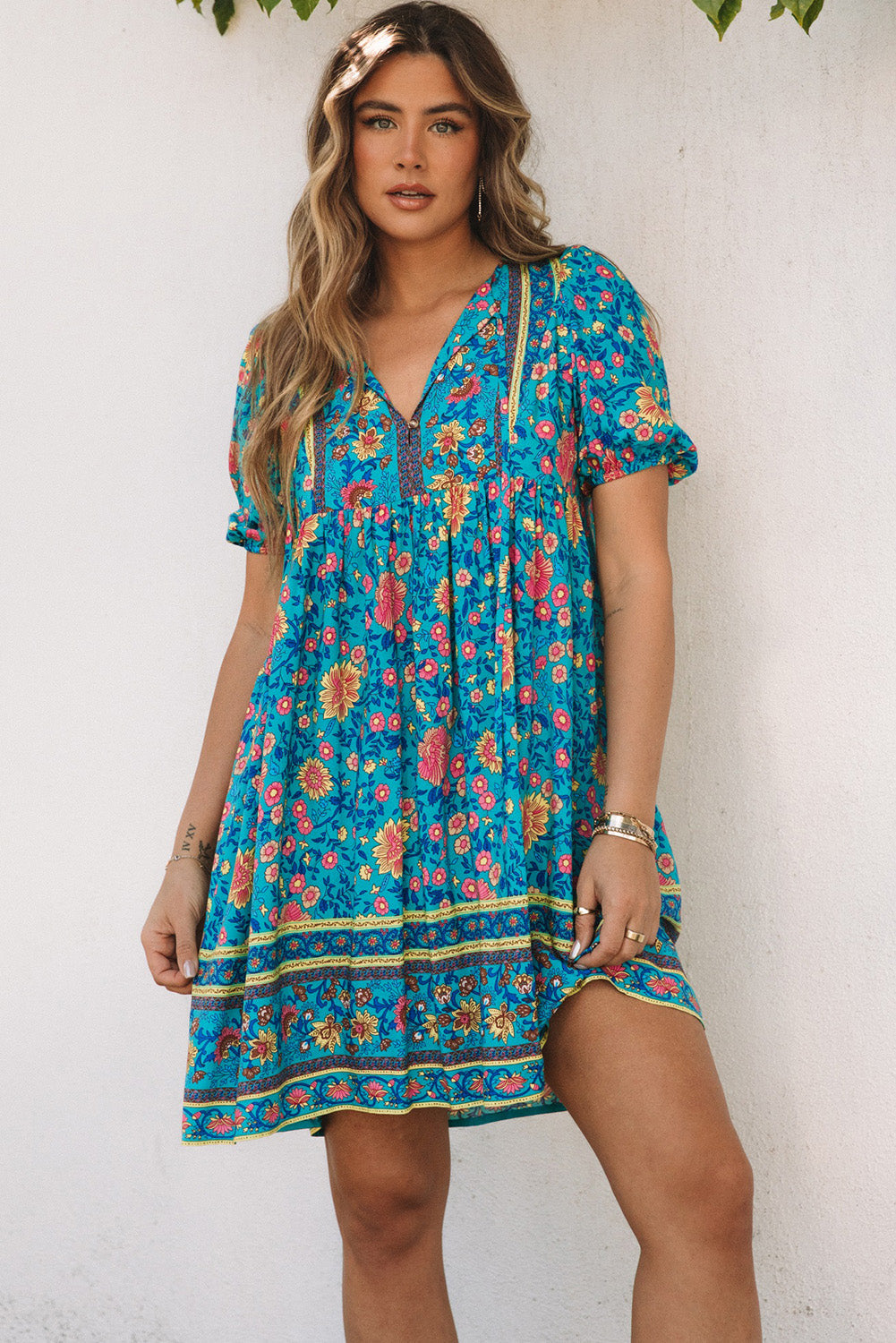 • This is a bohemian style dress. that features a split neckline with button and tie