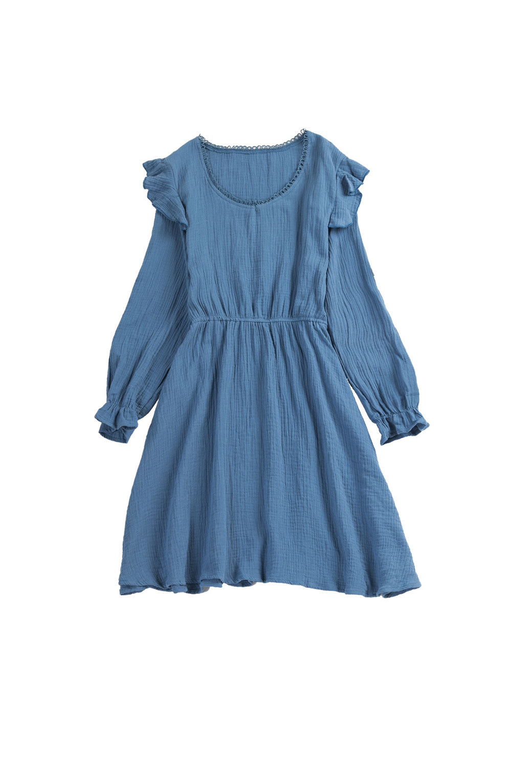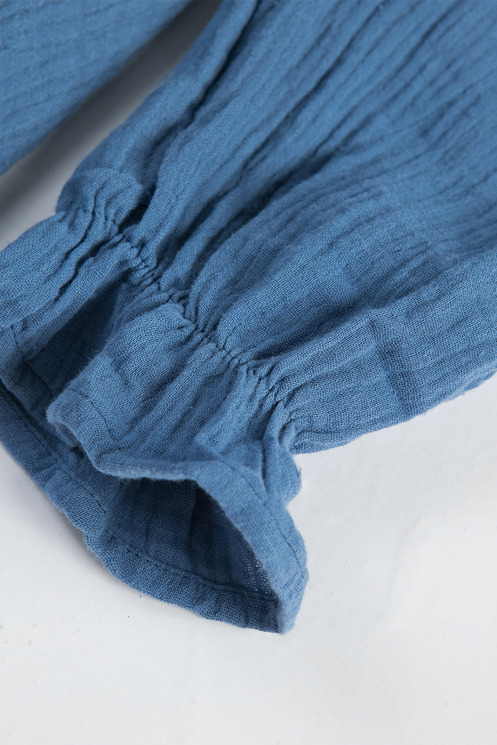 Blue V Neck Puff Sleeves Crinkled Tunic Mini Dress