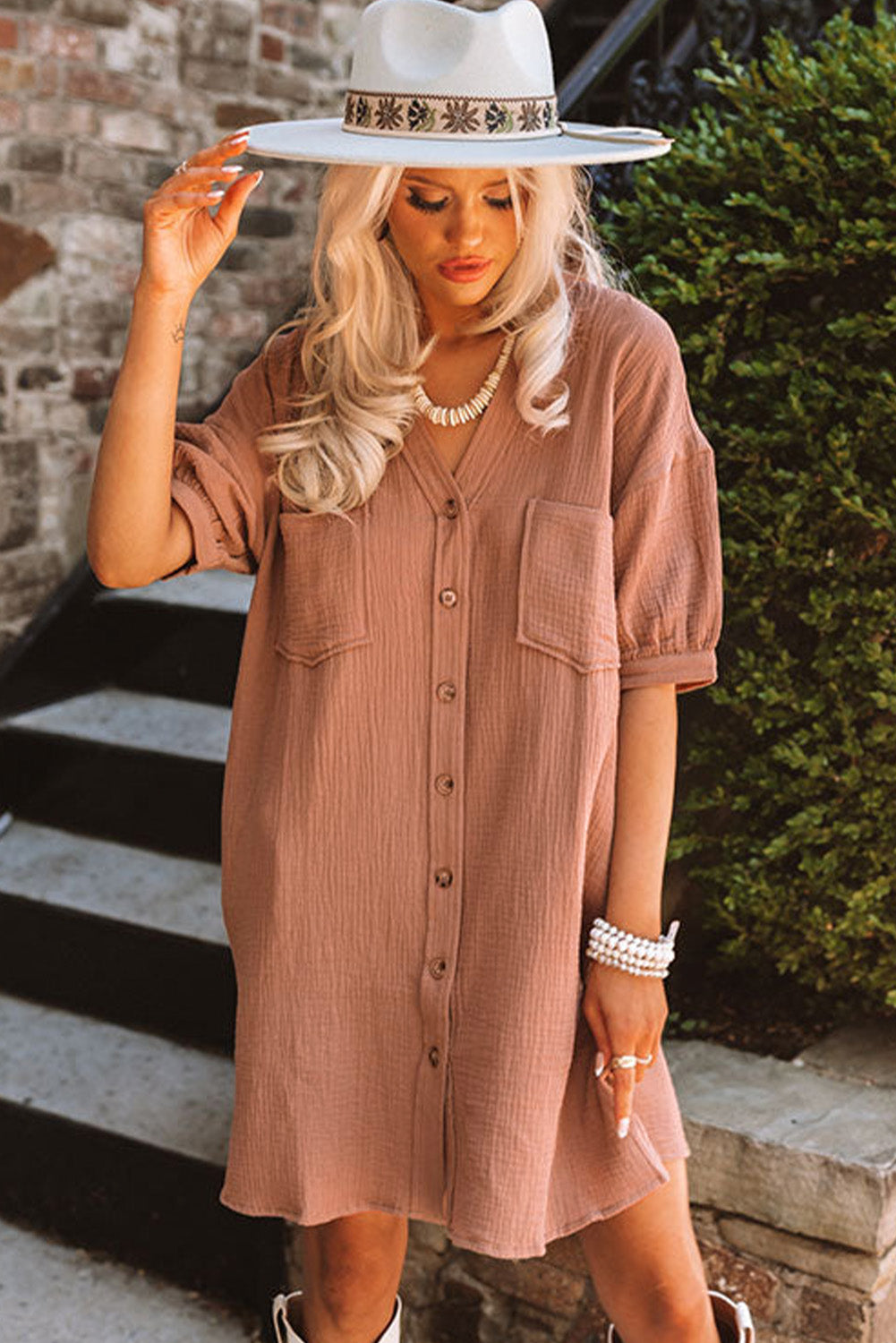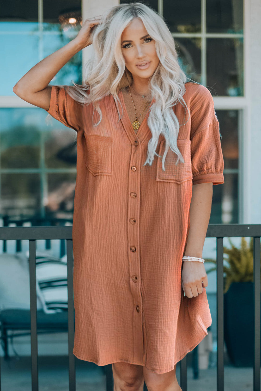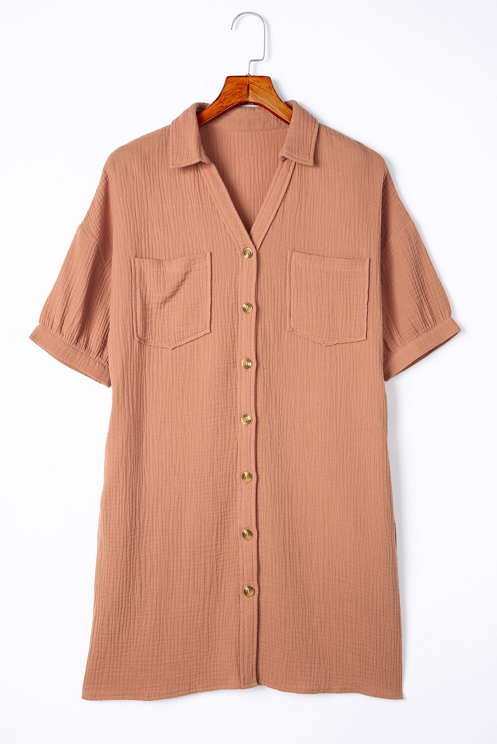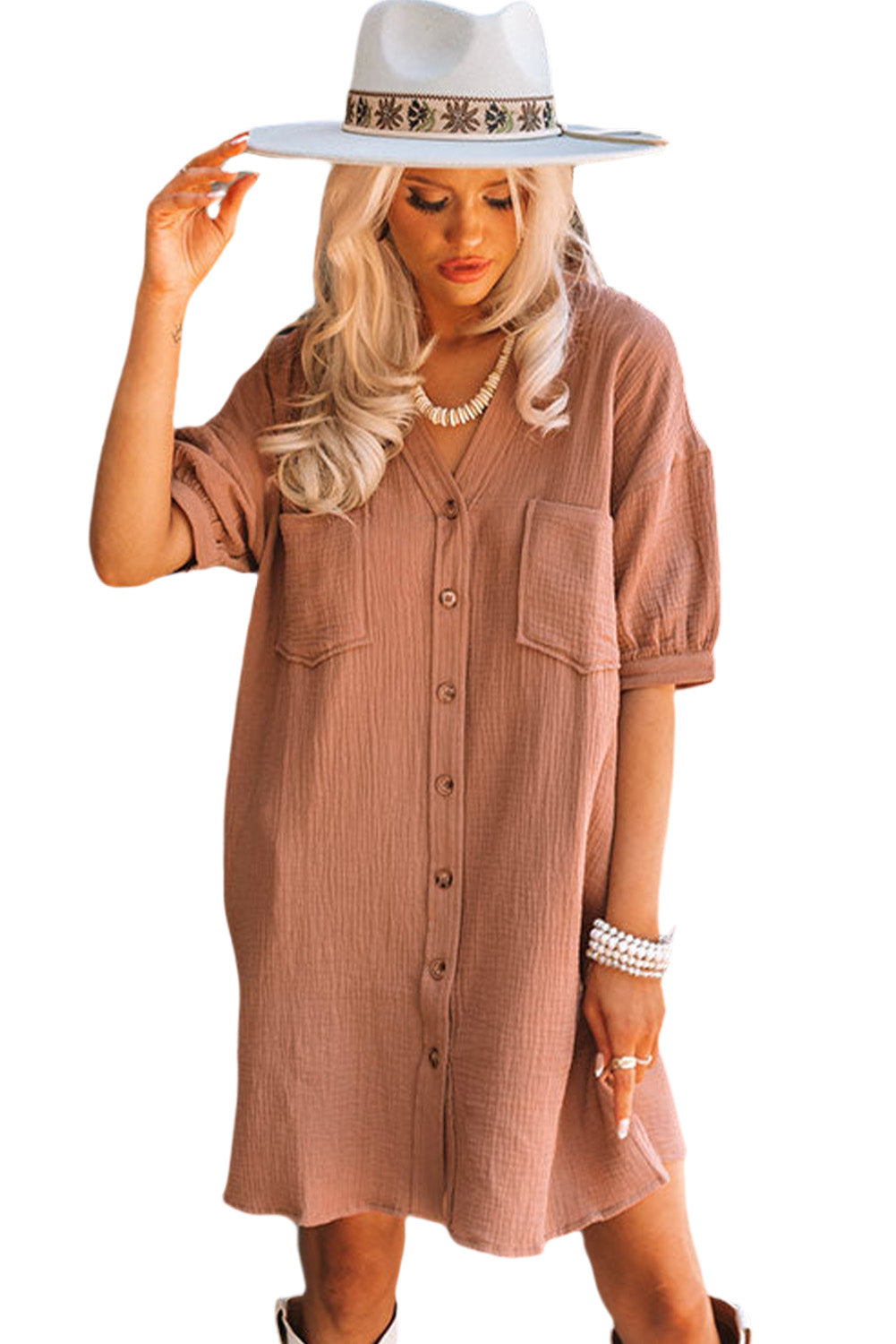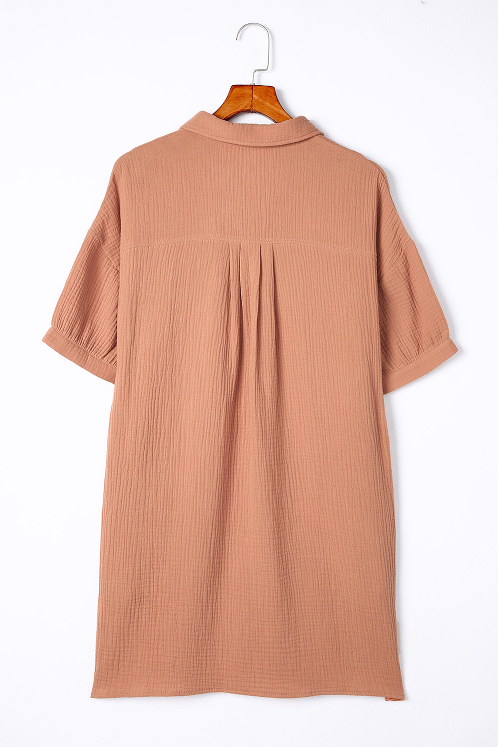 Brown Crinkle Textured Joint Bubble Sleeve Shirt Dress