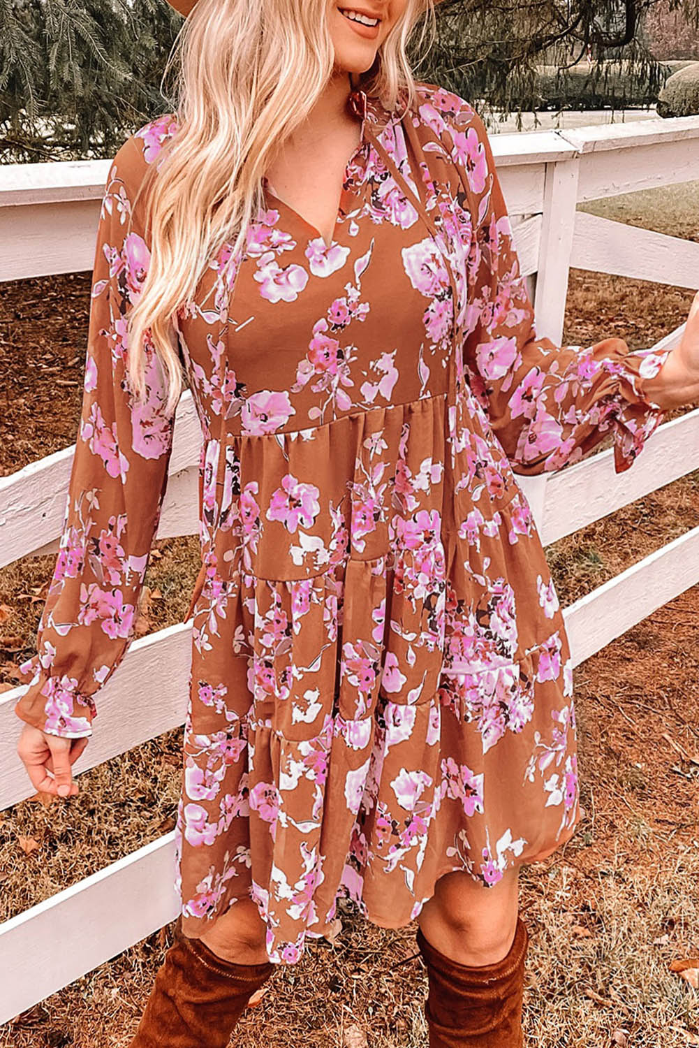 Brown Floral Print Drawstring V Neck Ruffled Babydoll Mini Dress