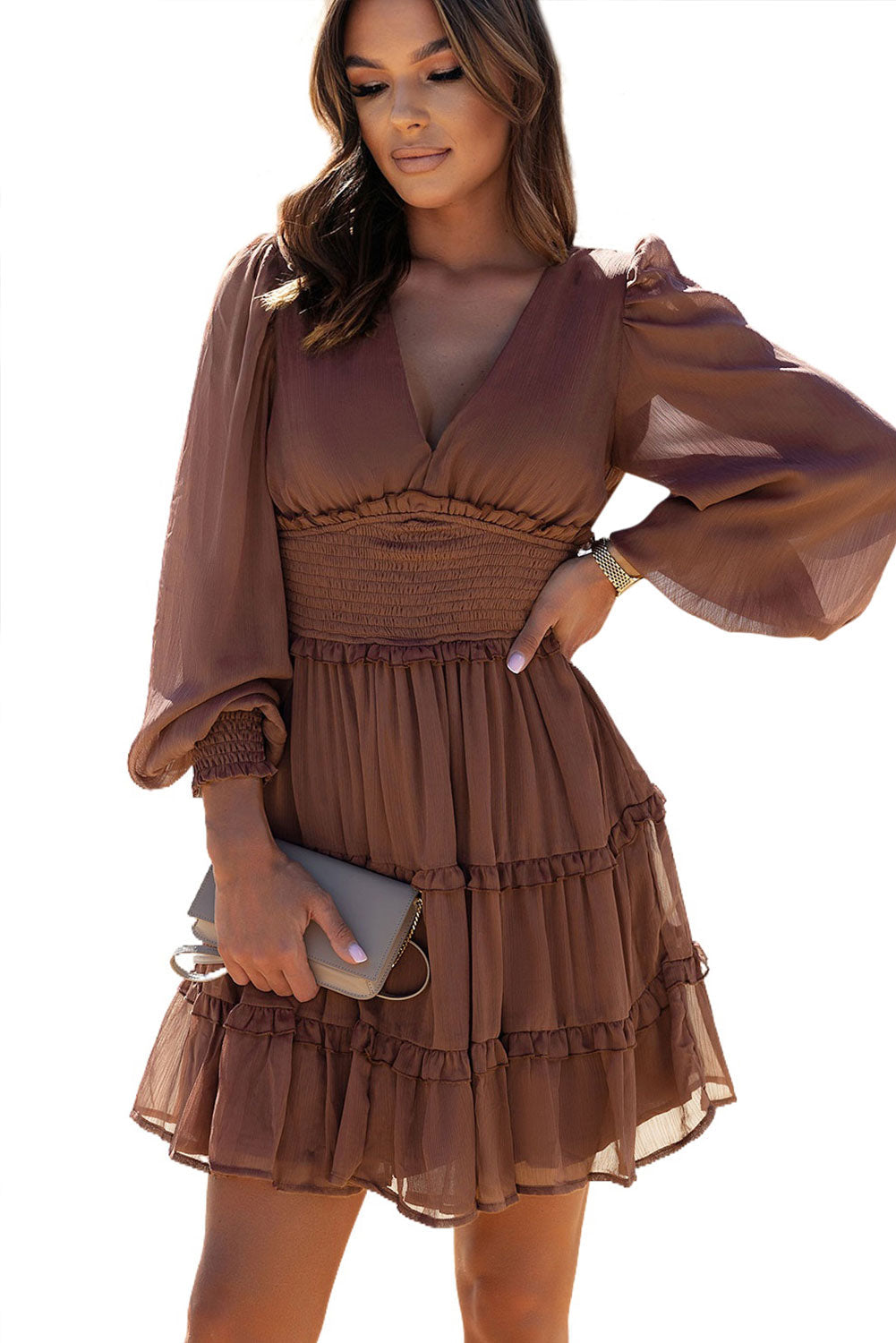 Brown Frill Smocked Detail Sheer Long Sleeve Dress