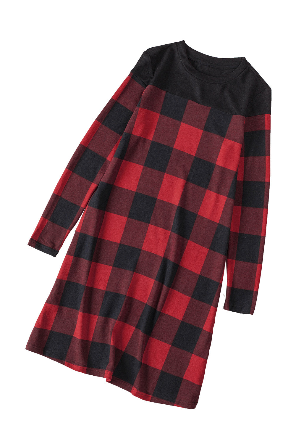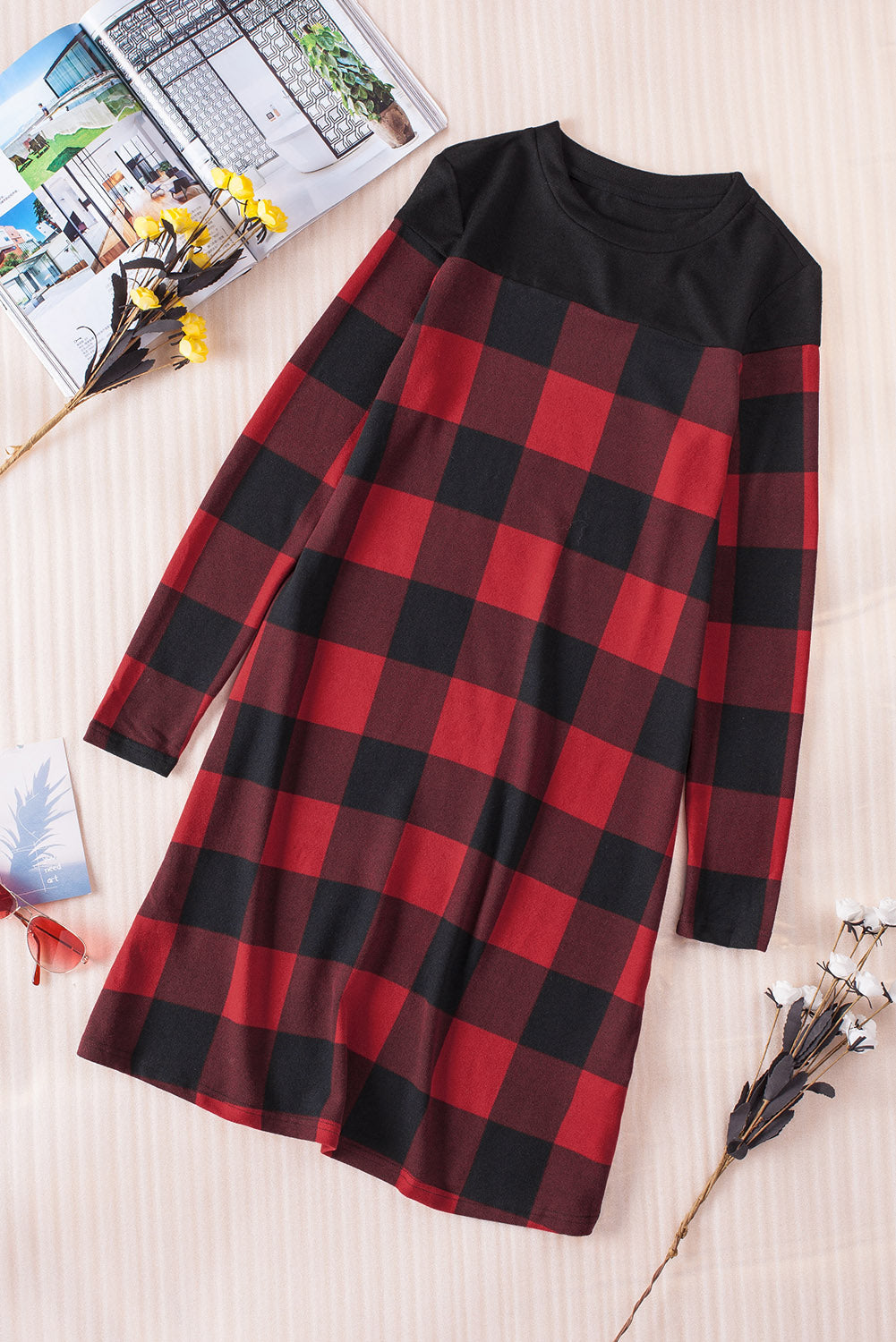 Buffalo Plaid Splicing Long Sleeve Mini Dress