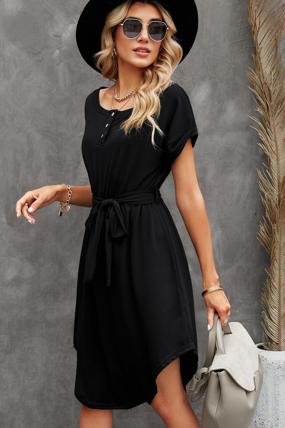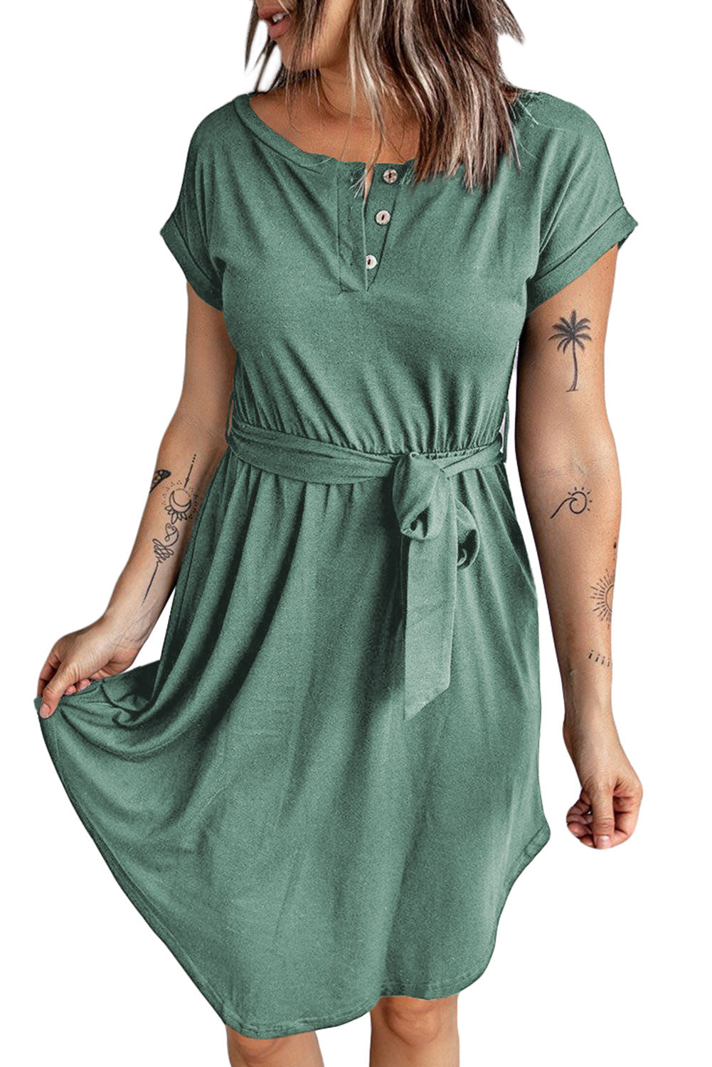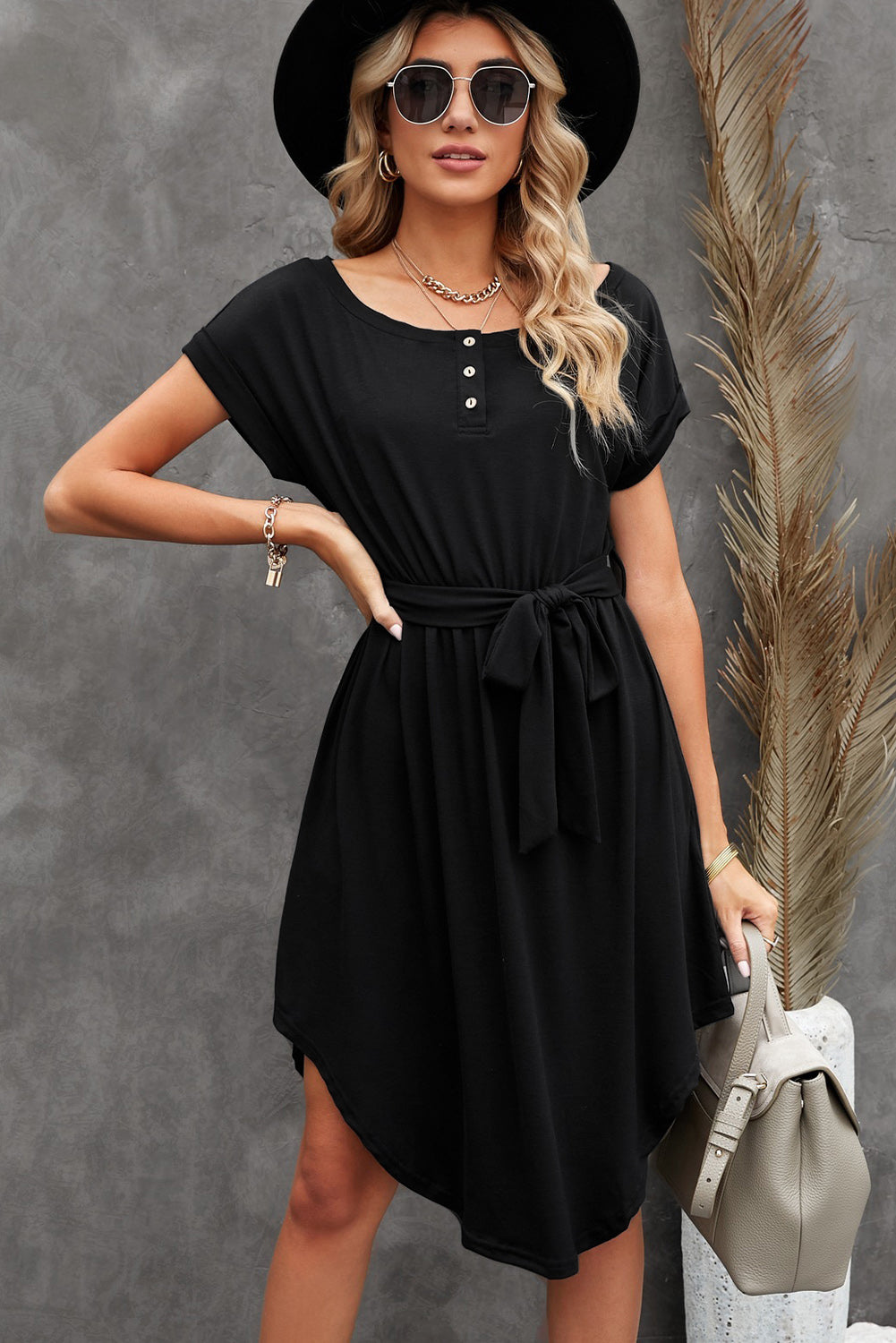 Buttons Crewneck Lace-up High Waist Mini Dress