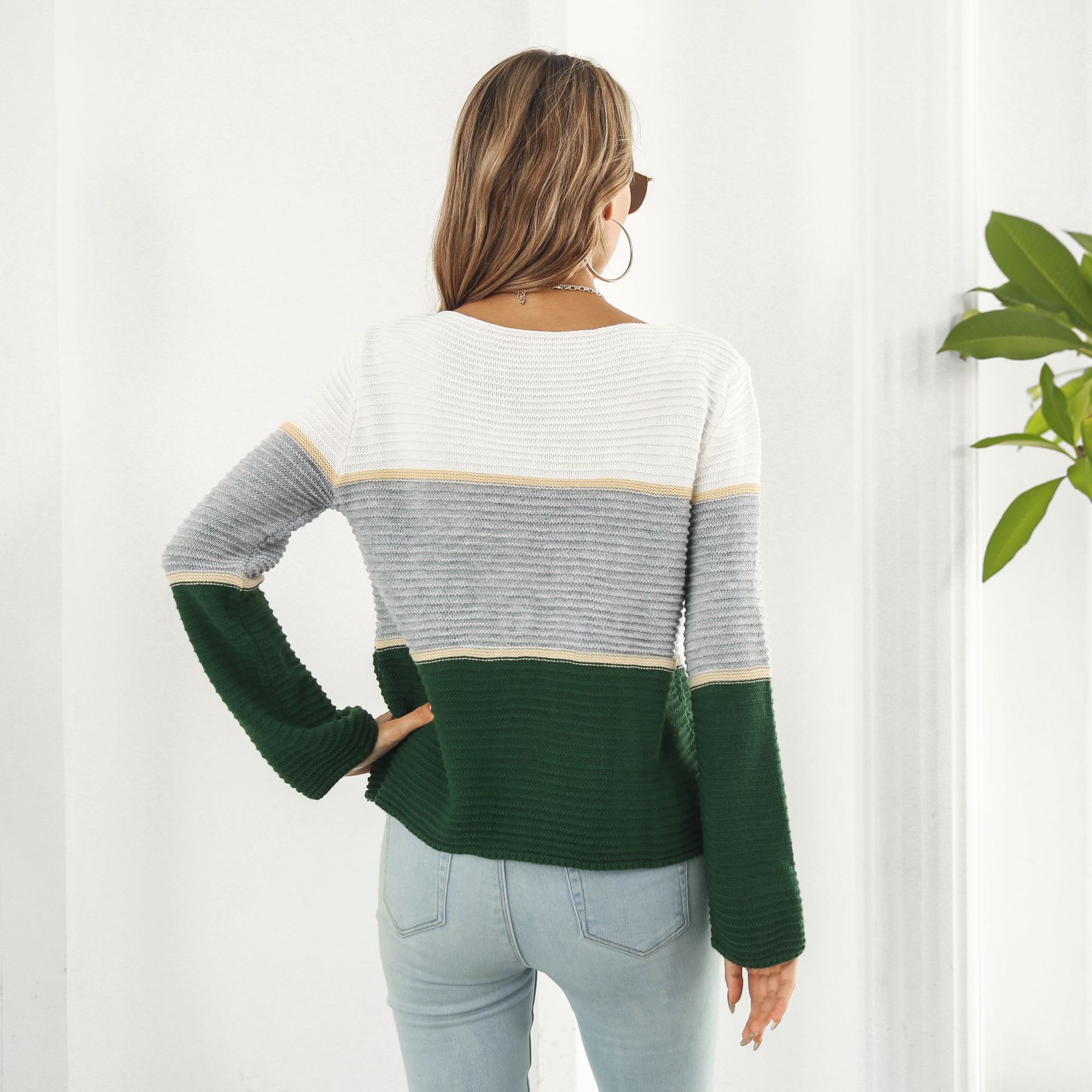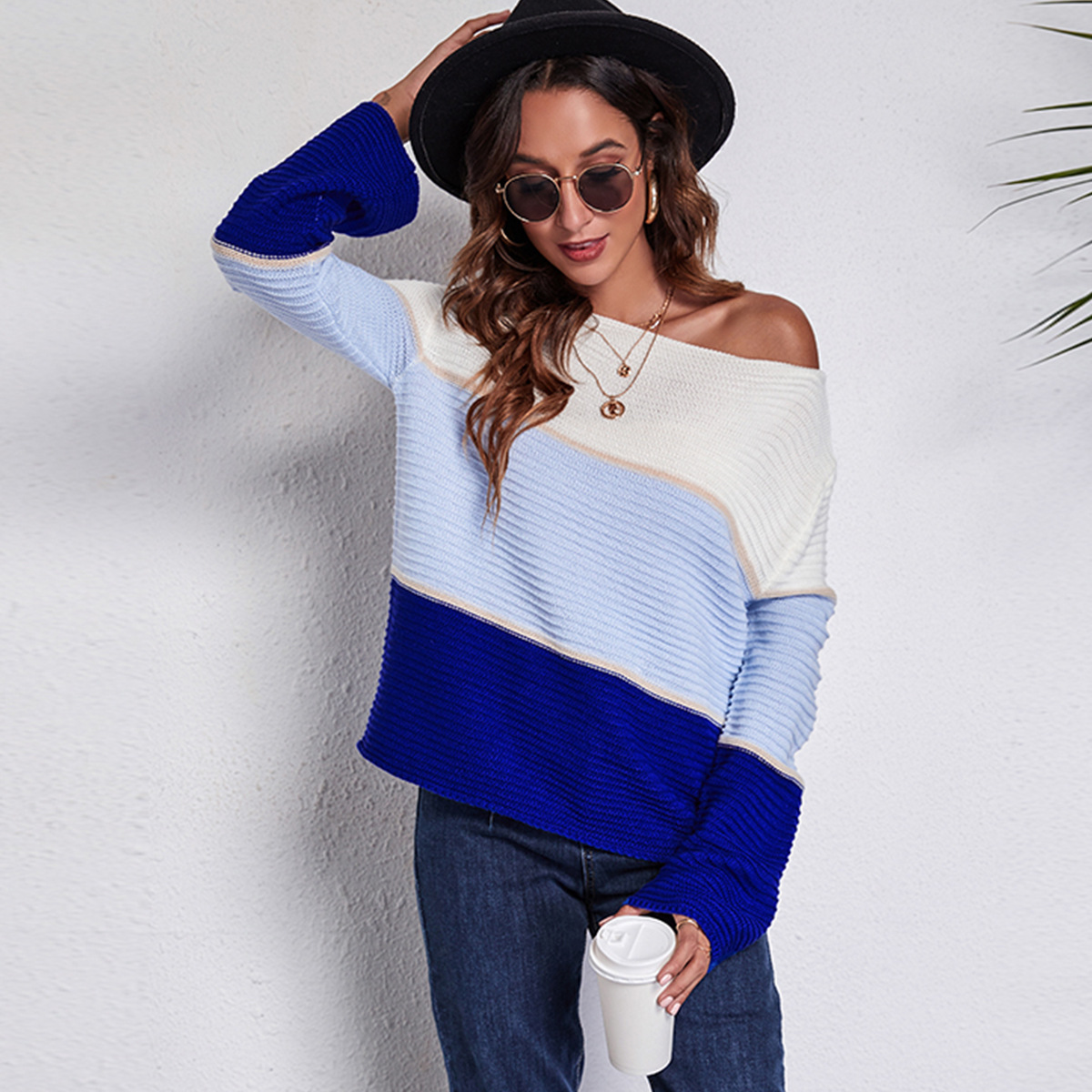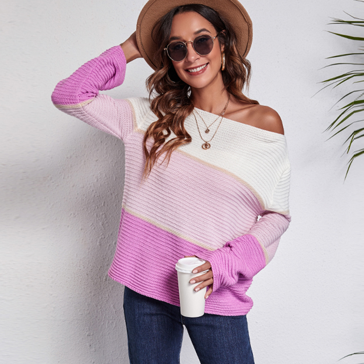 Increase quantity for Contrast Color Gradient Color Striped off Neck Sweater Women Color Matching Knitwear Sweater