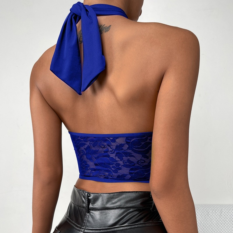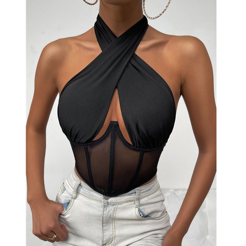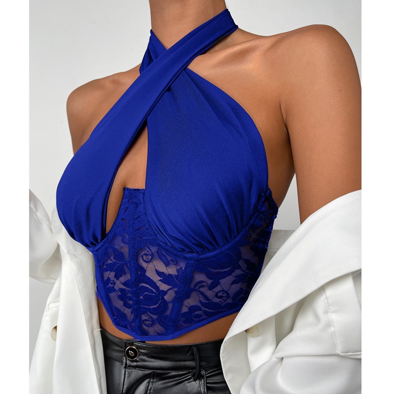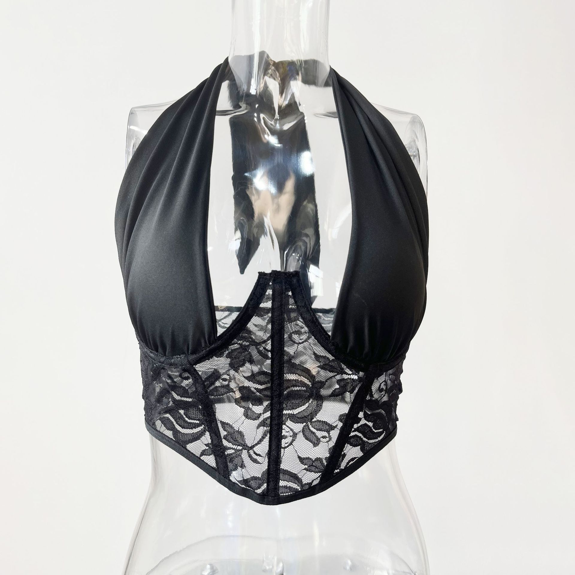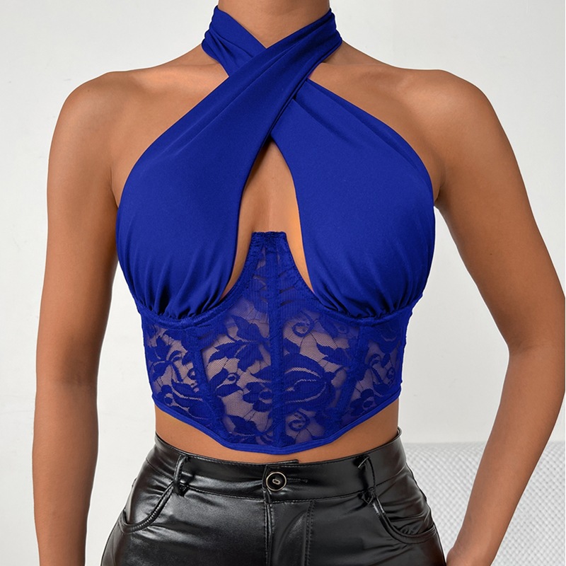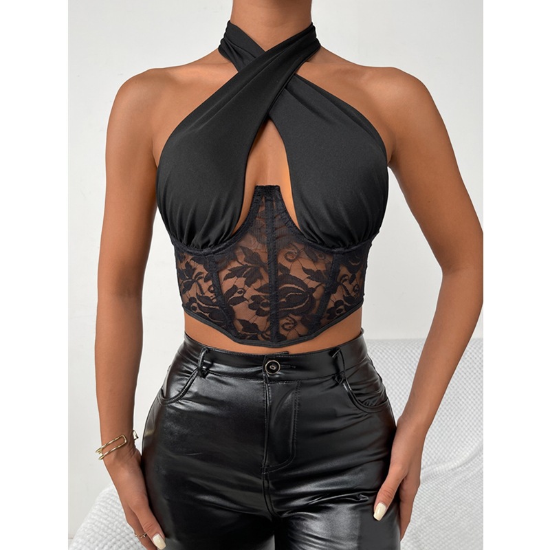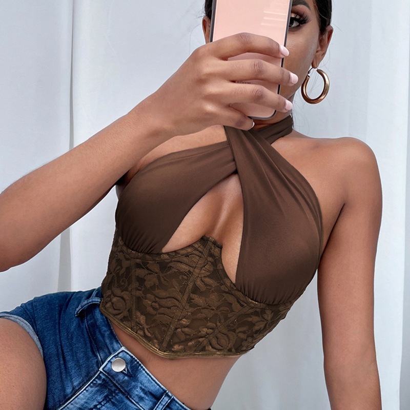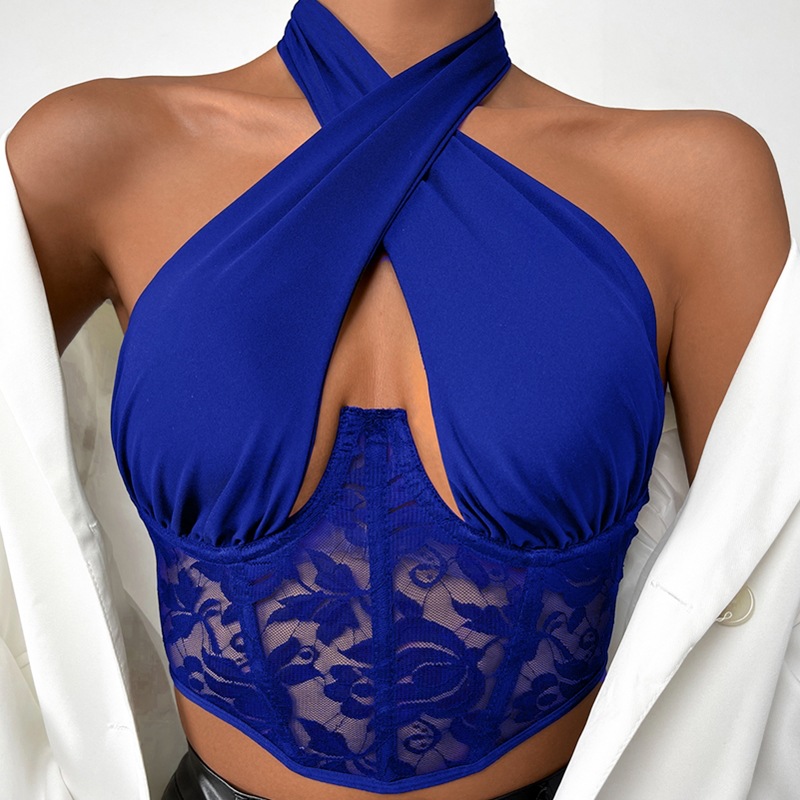 Criss Cross Summer Stitching Lace Halter Lace-up Wrapped Chest Steel Ring sexy Vest Boning Corset Boning Corset Corset Hollow Out Cutout Hollow Out Cutout Out
