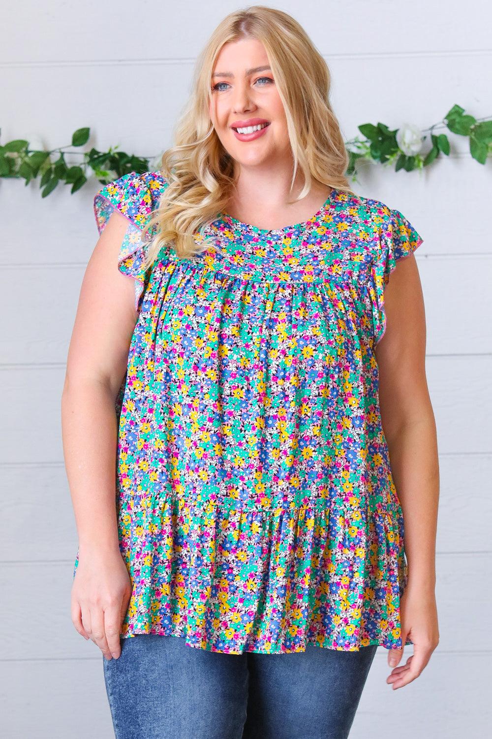 Make a statement with this emerald green and azure blue floral print tiered ruffle top with a back clasp keyhole. Designed with flutter sleeves and merrow stitching. this charming top with a linen feel is simply divine.