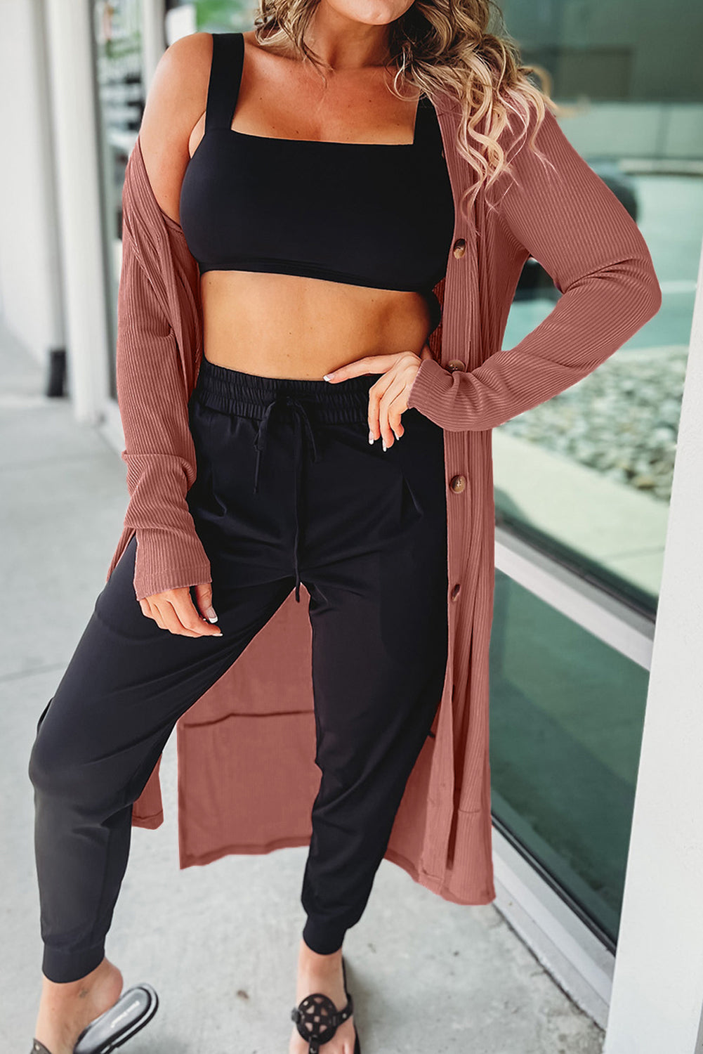 Flaxen Ribbed Button-Up Split Duster Cardigan