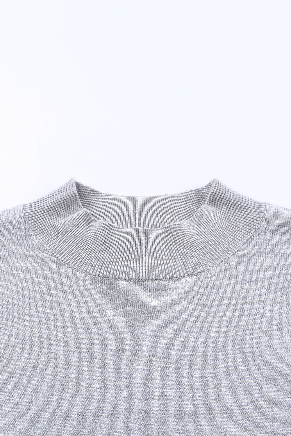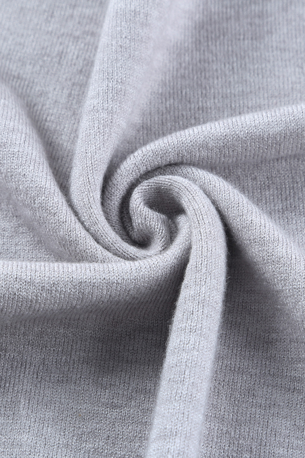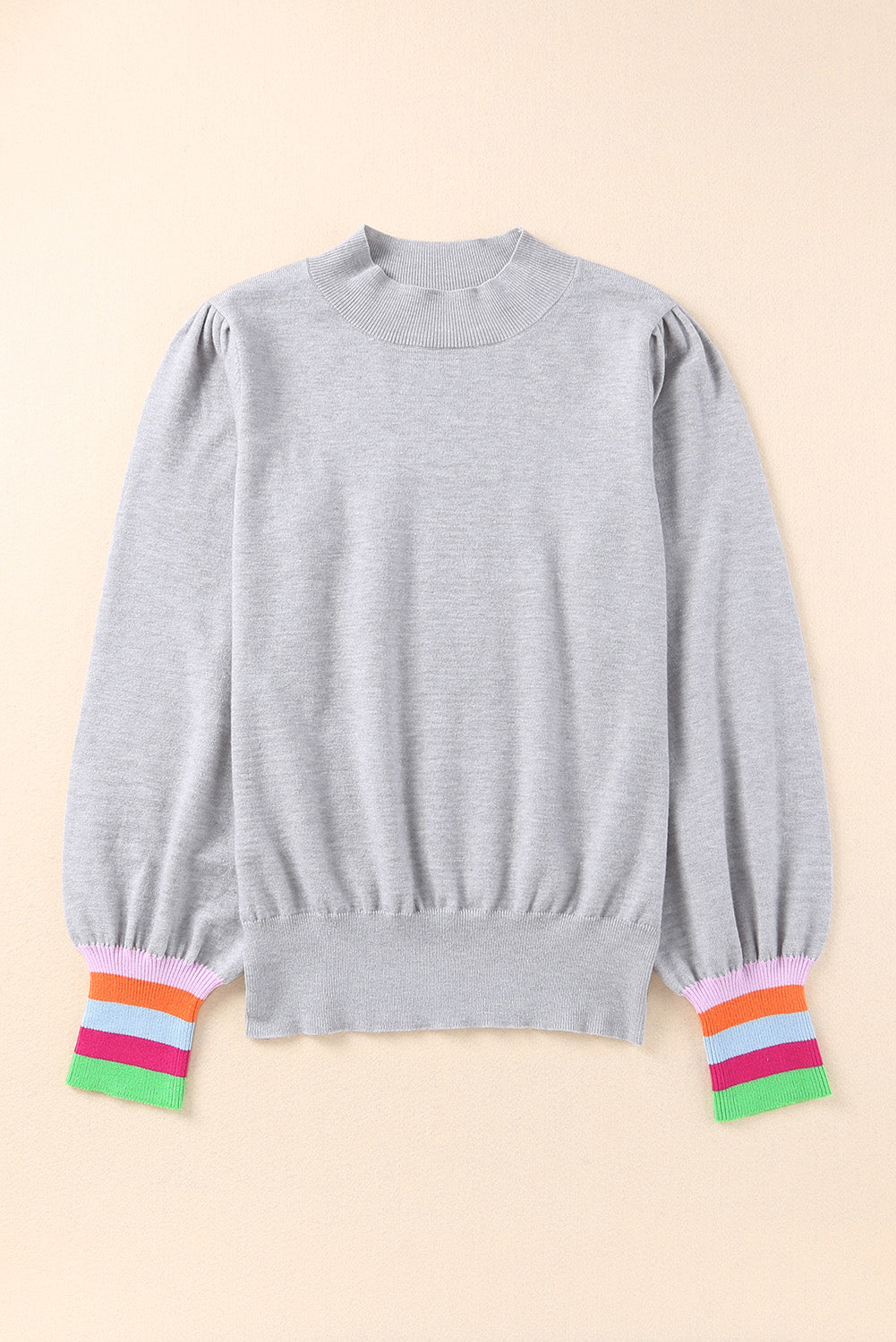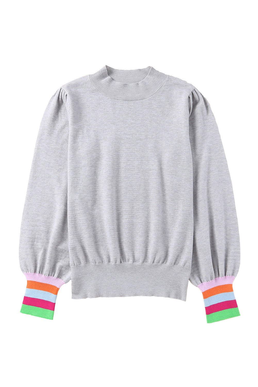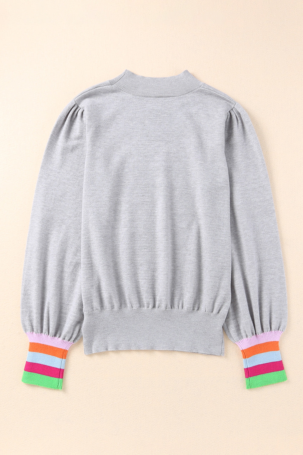 Gray Crew Neck Colorful Striped Cuffs Puff Sleeves Sweater