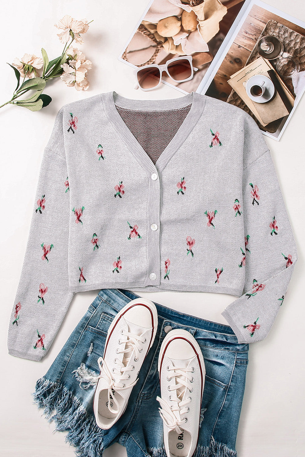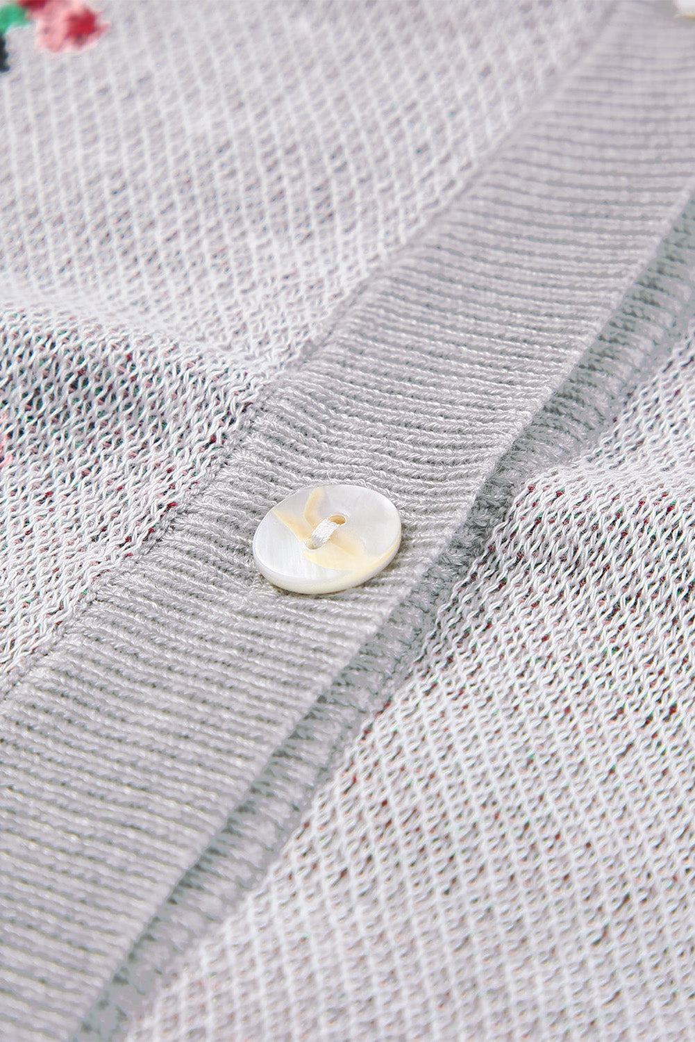 Gray Floral Cropped Sweater Cardigan