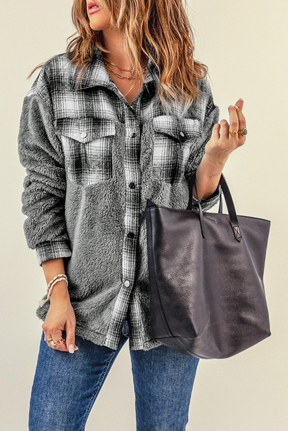 Gray Plaid Patchwork Buttoned Pocket Sherpa Jacket