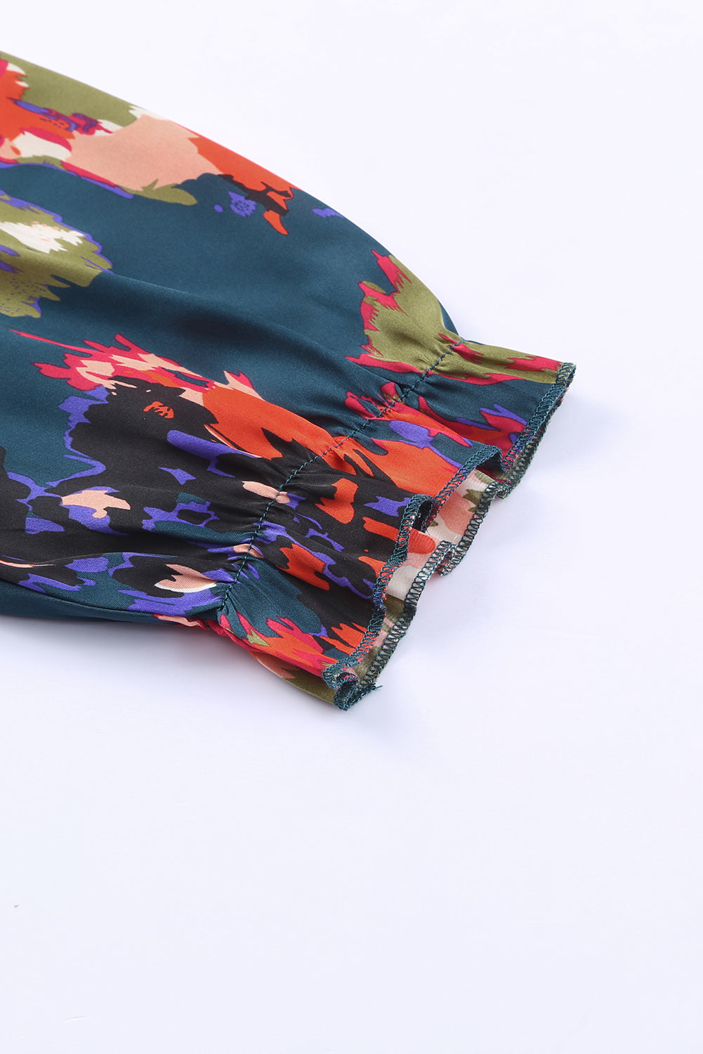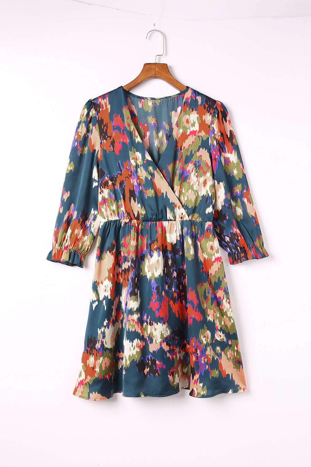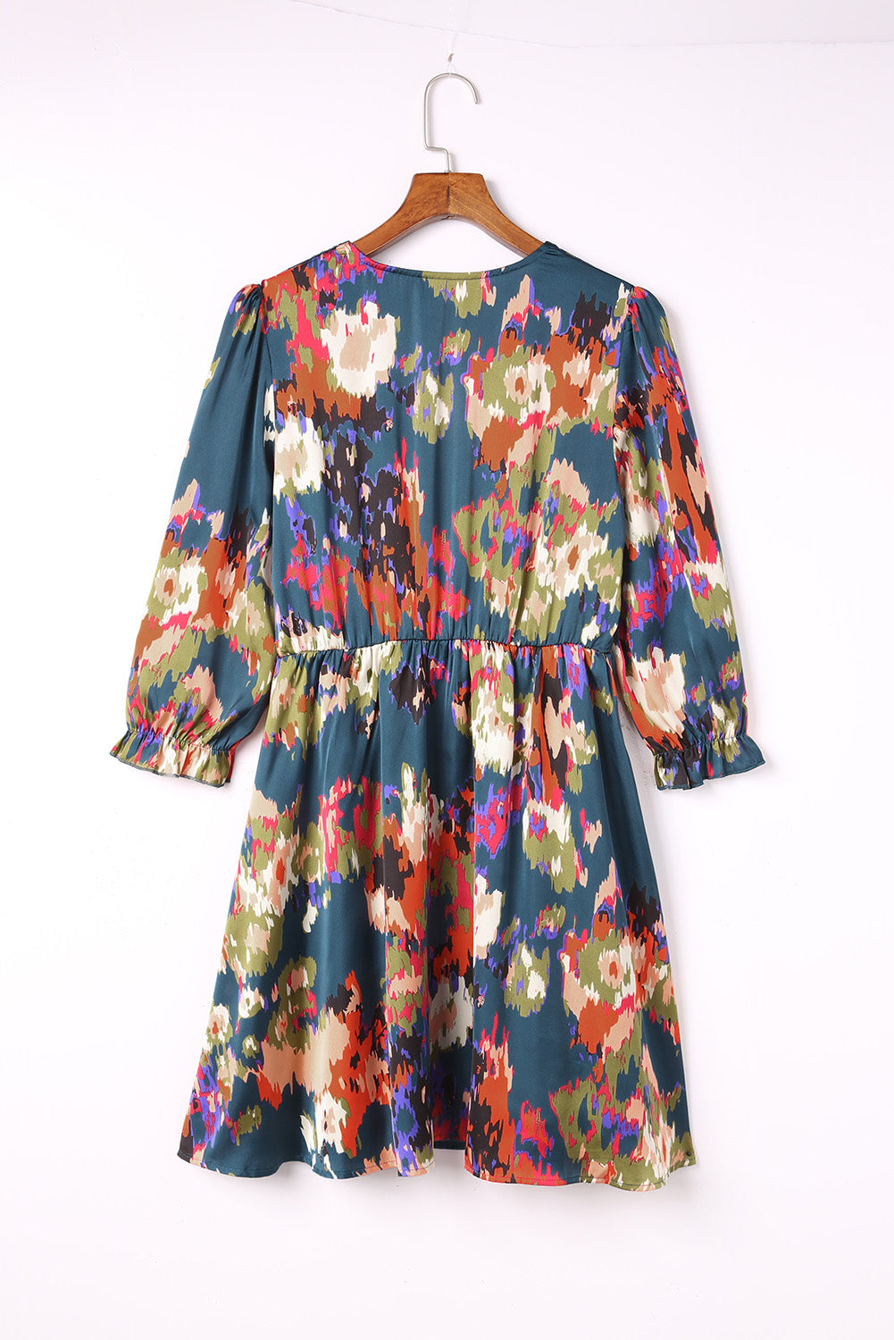 Green Abstract Print V Neck Puff Sleeve A-line Dress
