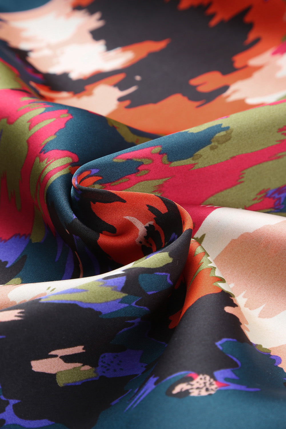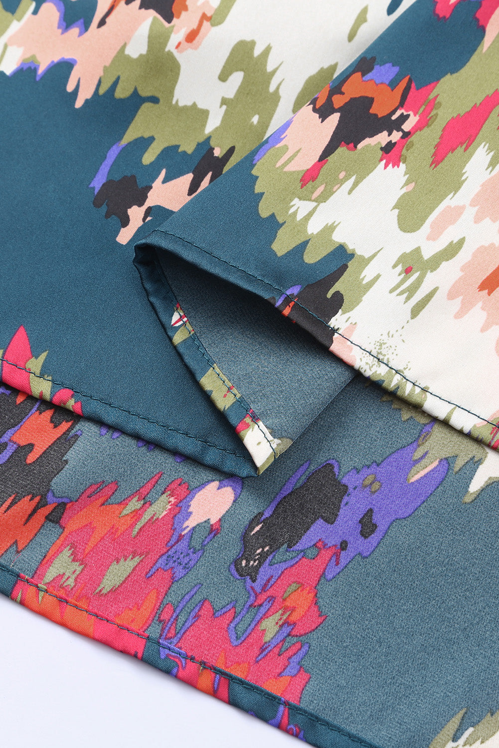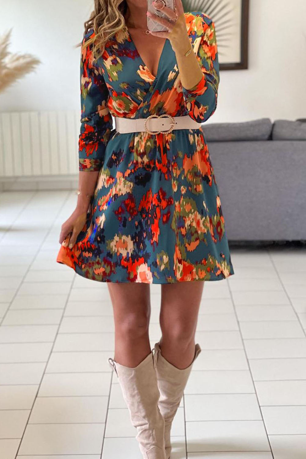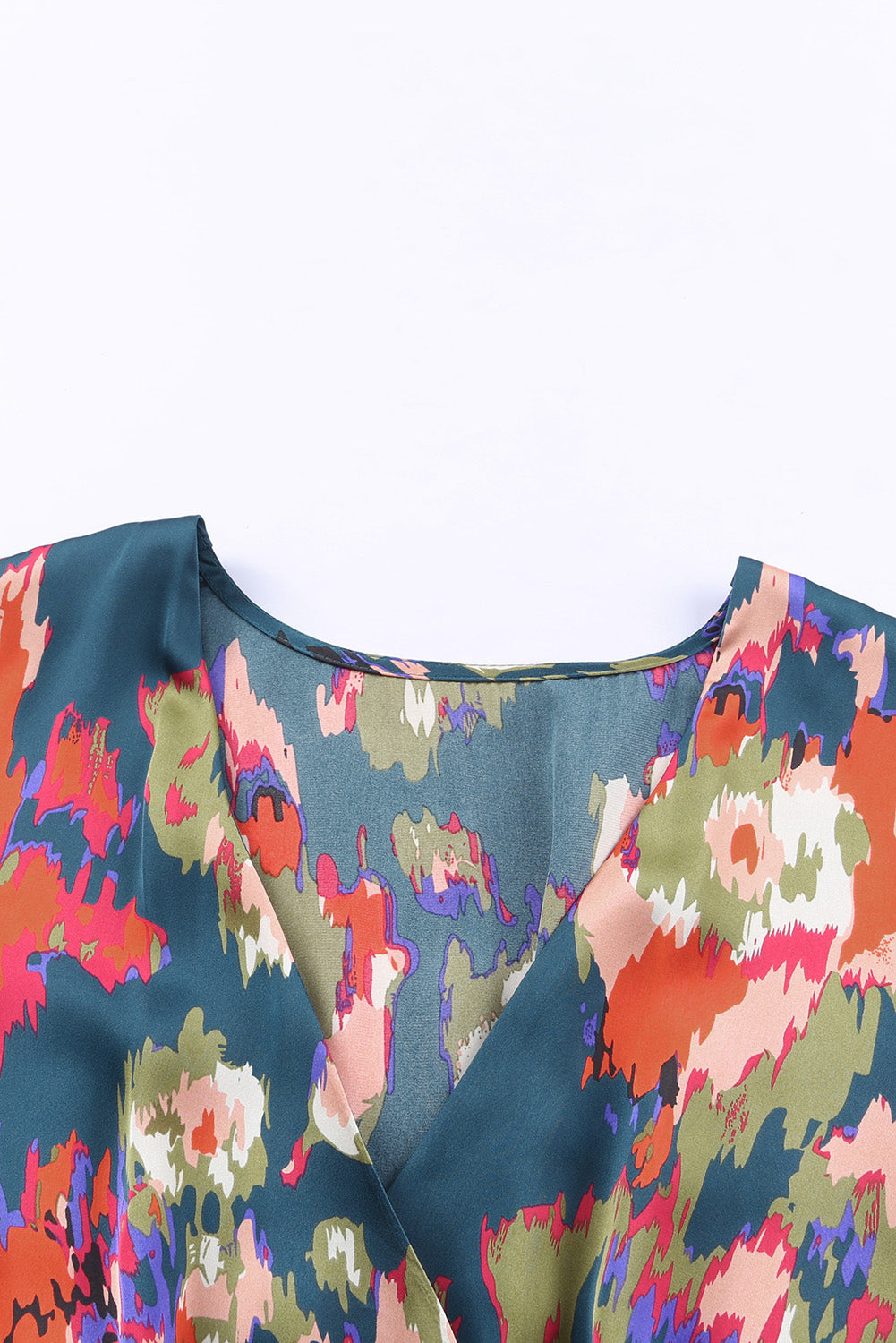Green Abstract Print V Neck Puff Sleeve A-line Dress