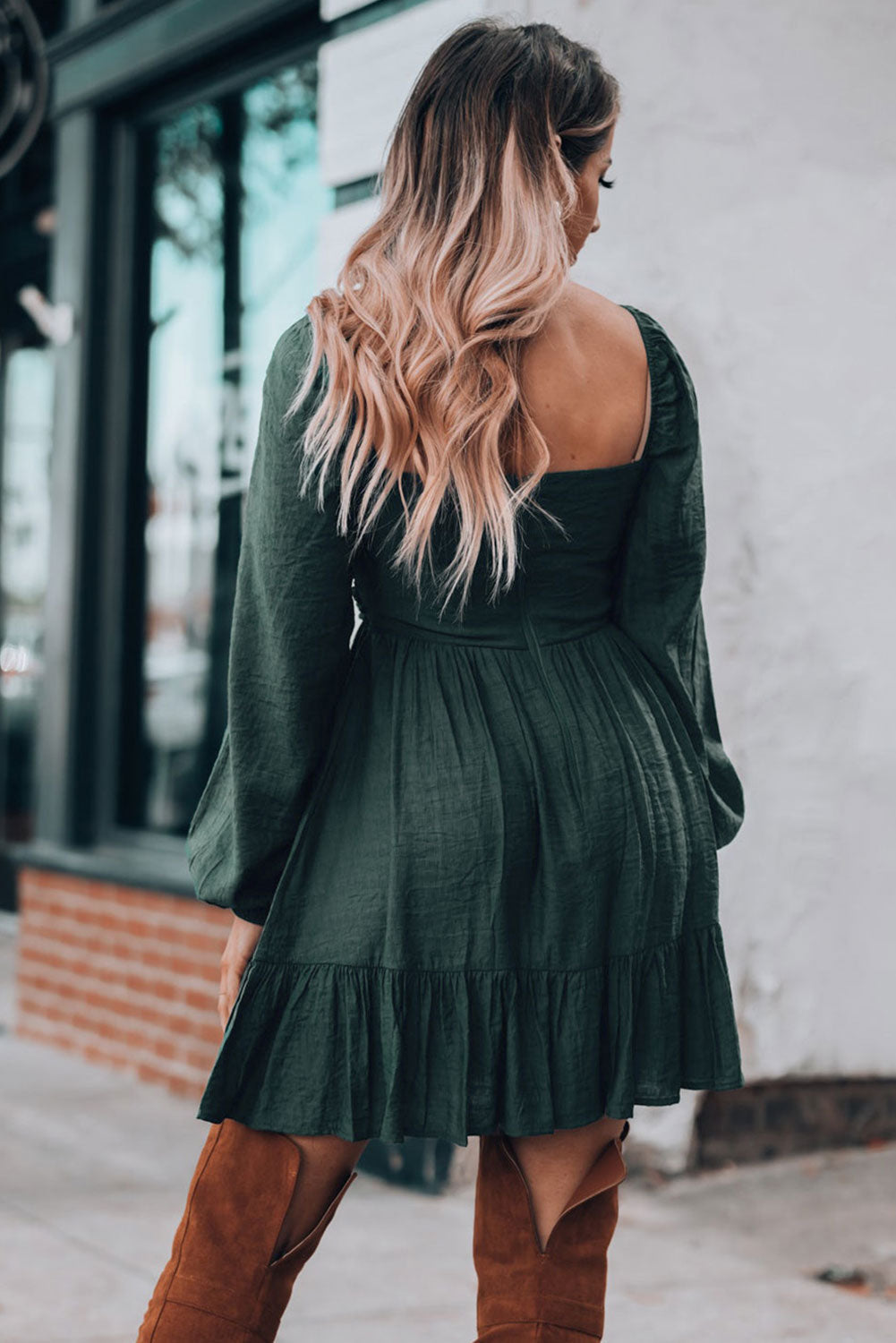 Green Ruched Square Neck Puff Sleeve Mini Dress