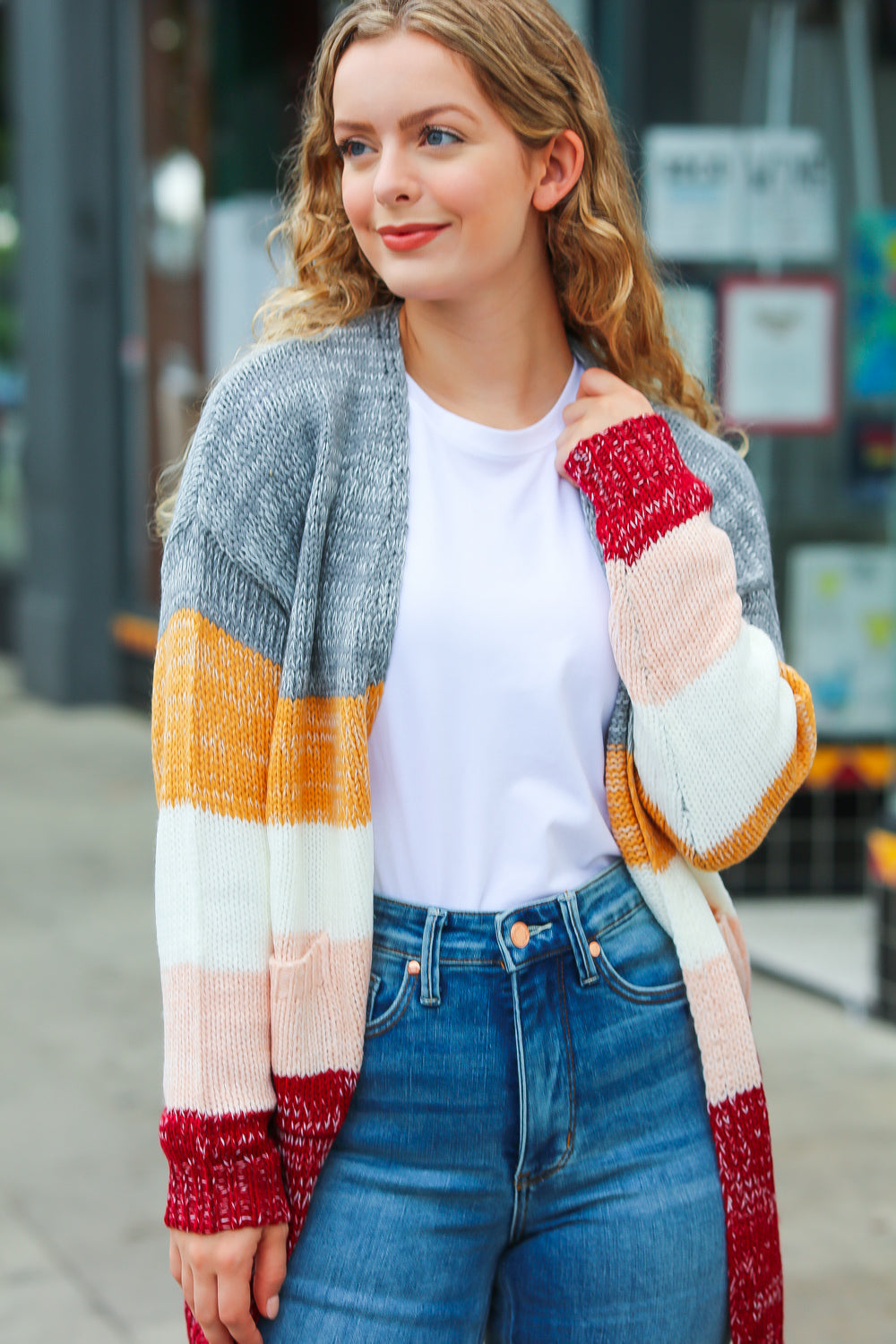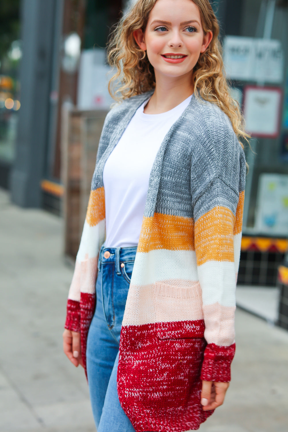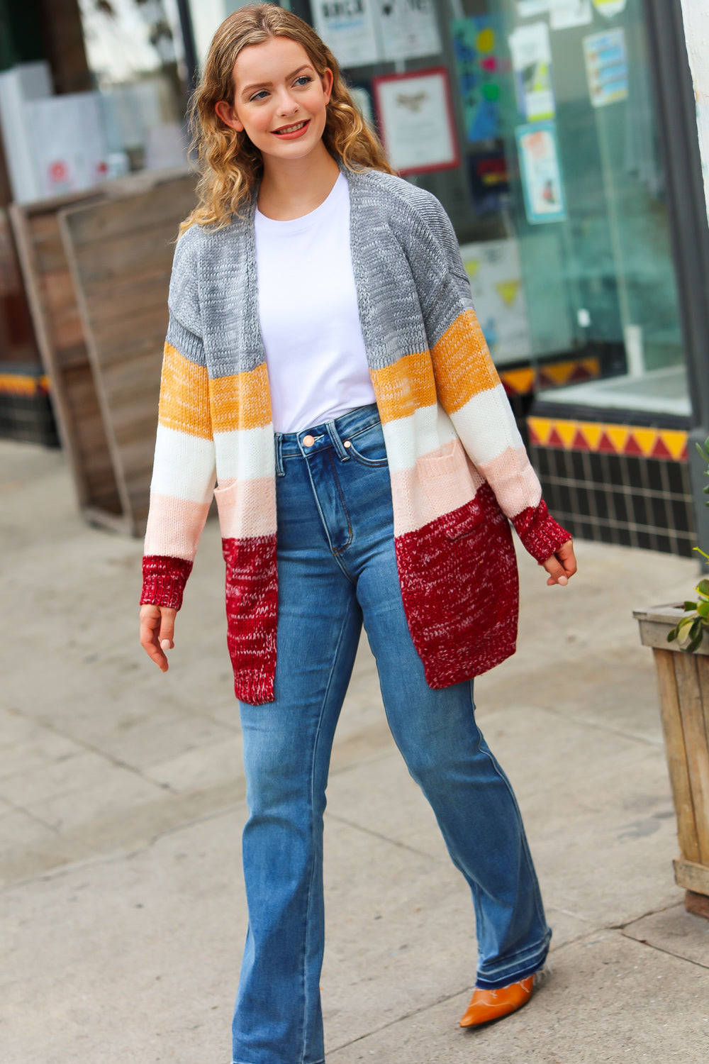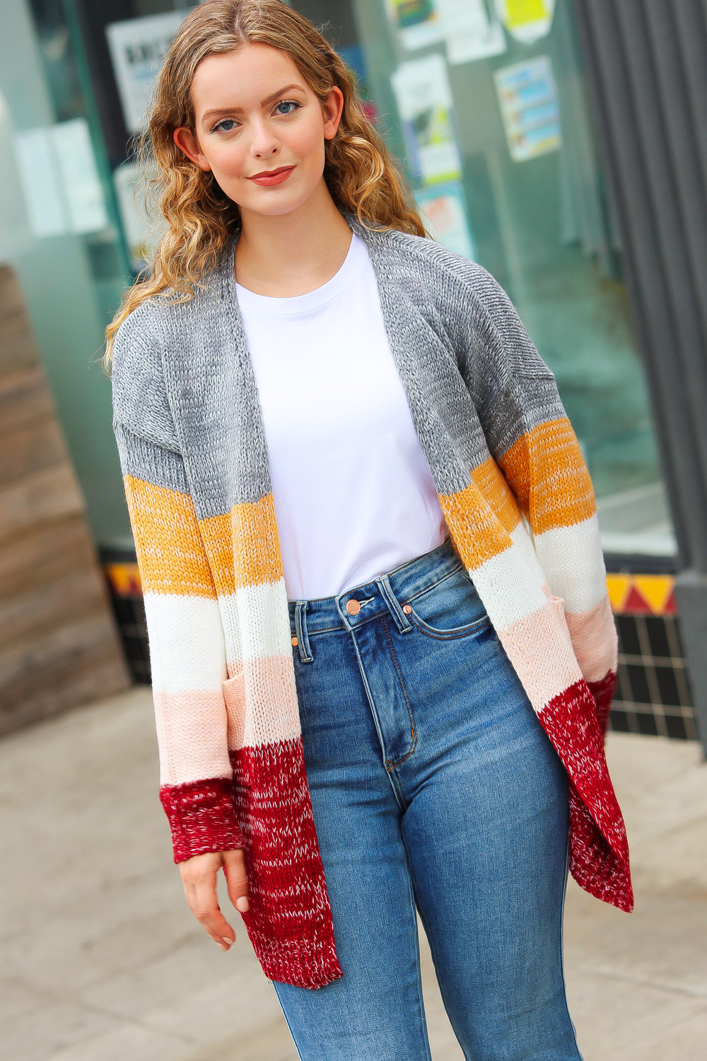 Step into fall with style with this stunning color block mid-weight open front cardigan made with loose knit fabric. Sleek and stylish. this long sleeve sweater cardigan features front pockets.