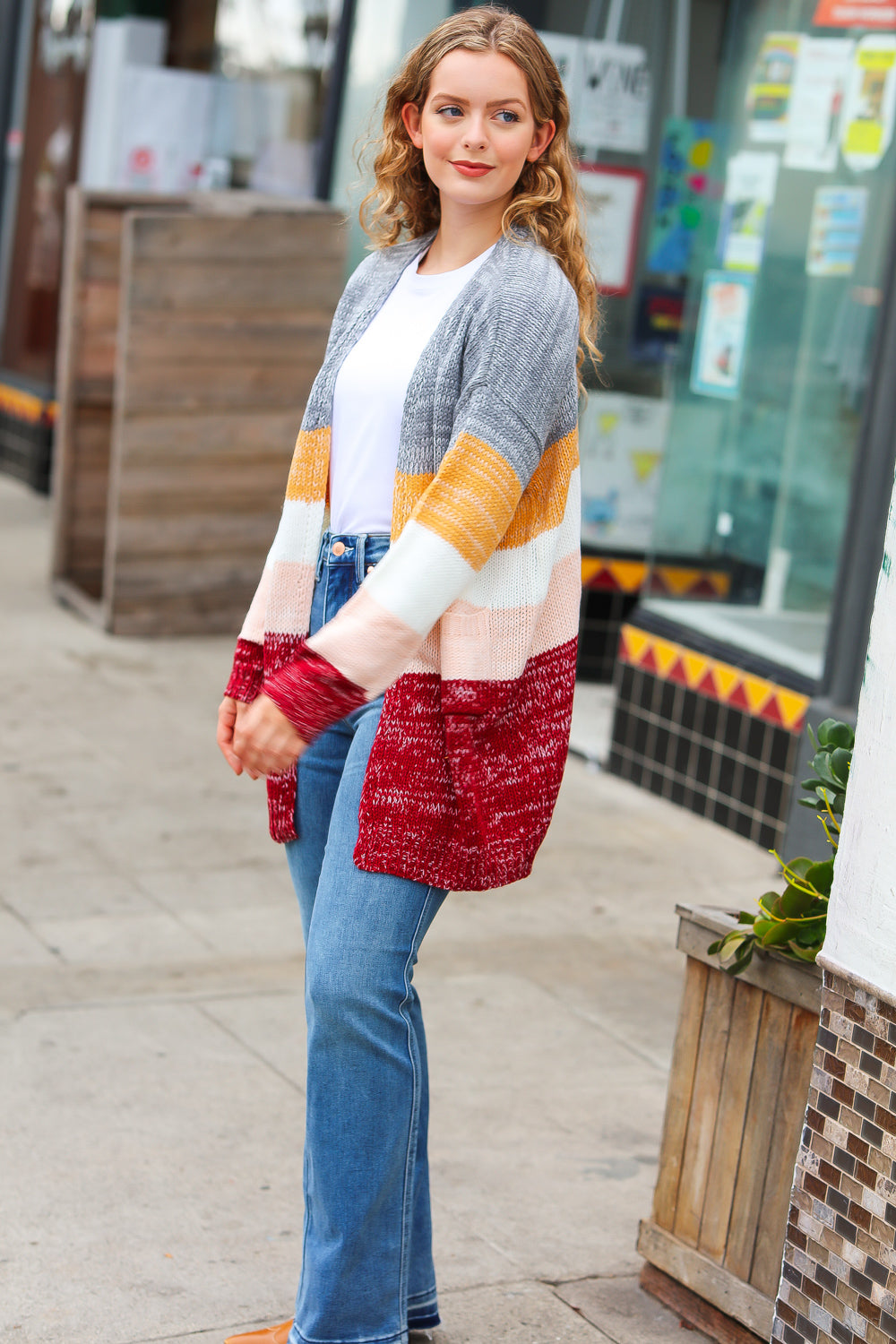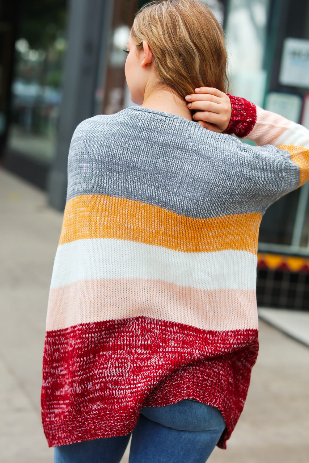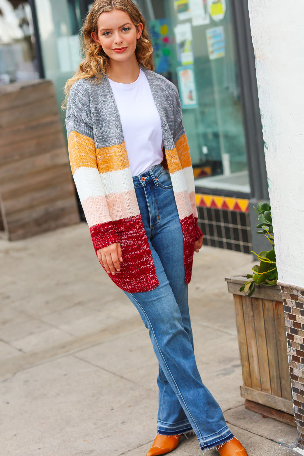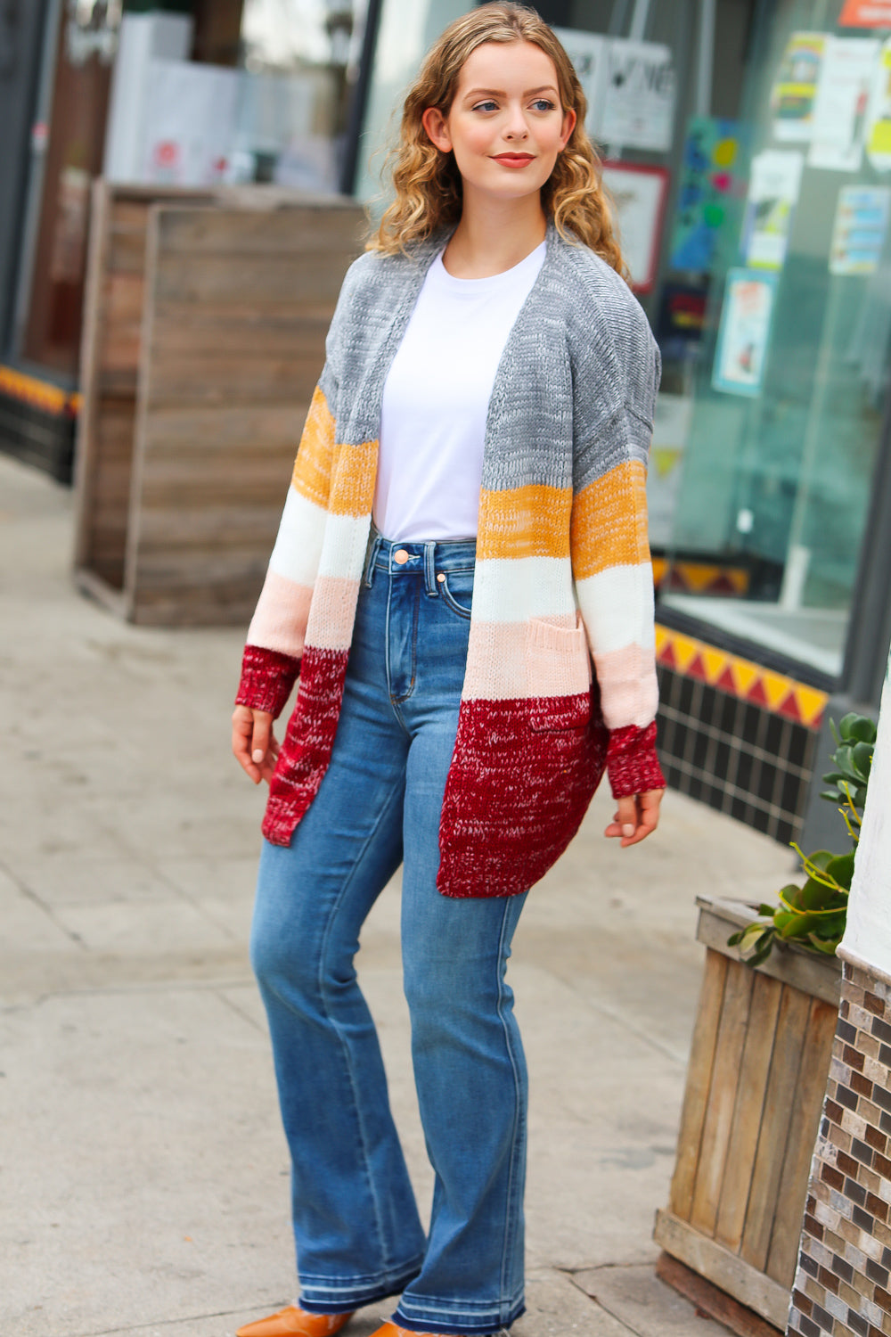 Step into fall with style with this stunning color block mid-weight open front cardigan made with loose knit fabric. Sleek and stylish. this long sleeve sweater cardigan features front pockets.
