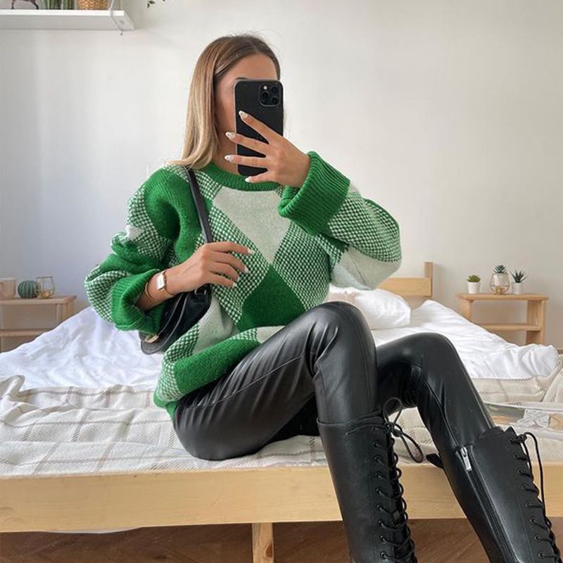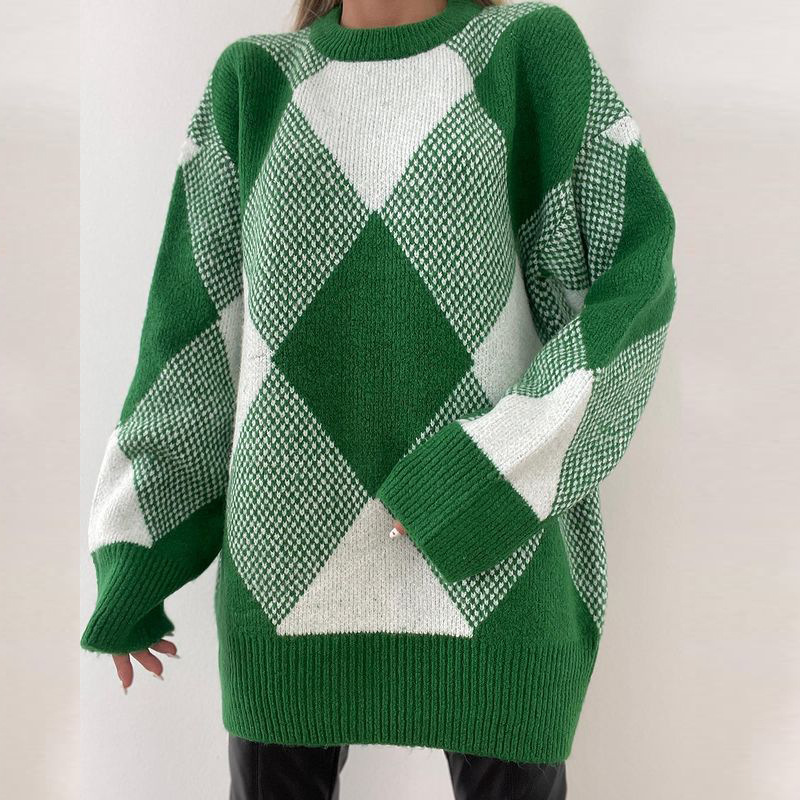 Half Turtleneck Pullover Sweater Loose Green Diamond Lattice Sweater