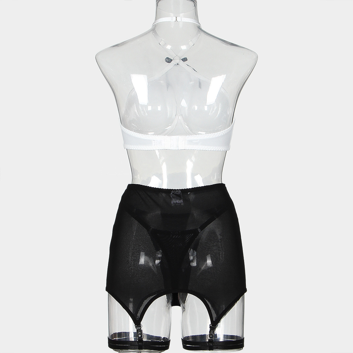 Halter Steel Ring Push up Sexy Lingerie Passion Sheer Mesh Short Skirt Sexy Four Piece Set