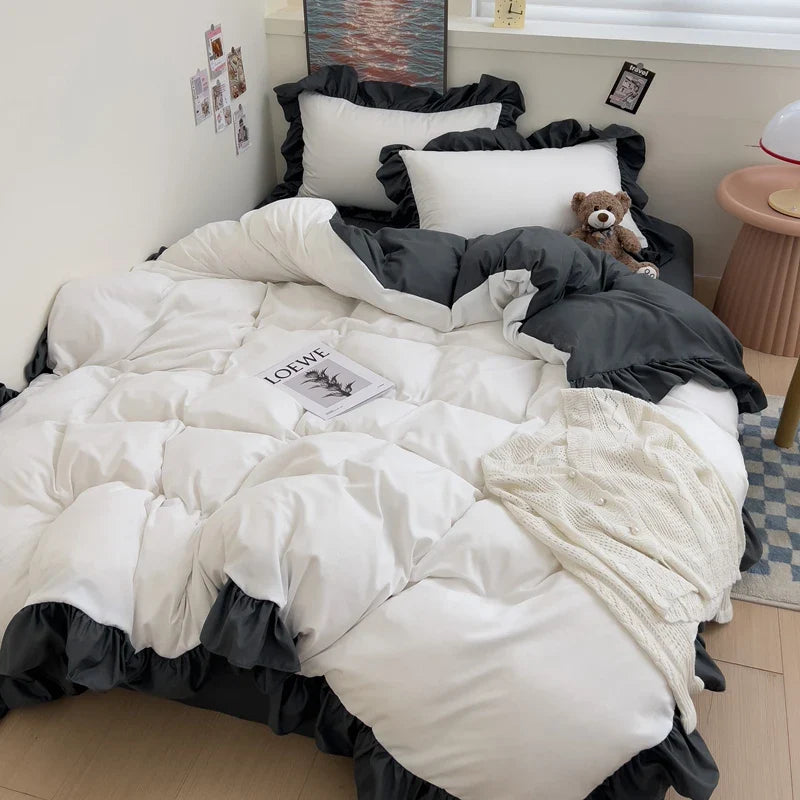 Ins Princess Bedding Set New Duvet Cover Fresh Blue Solid Color Floral Wrinkled Yann Bed Set Of Four Pieces Bed Sheets