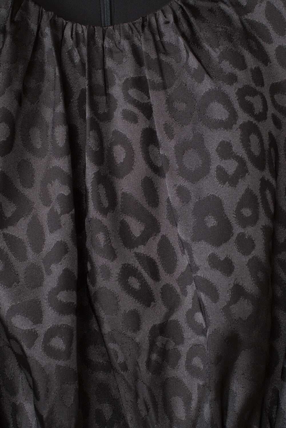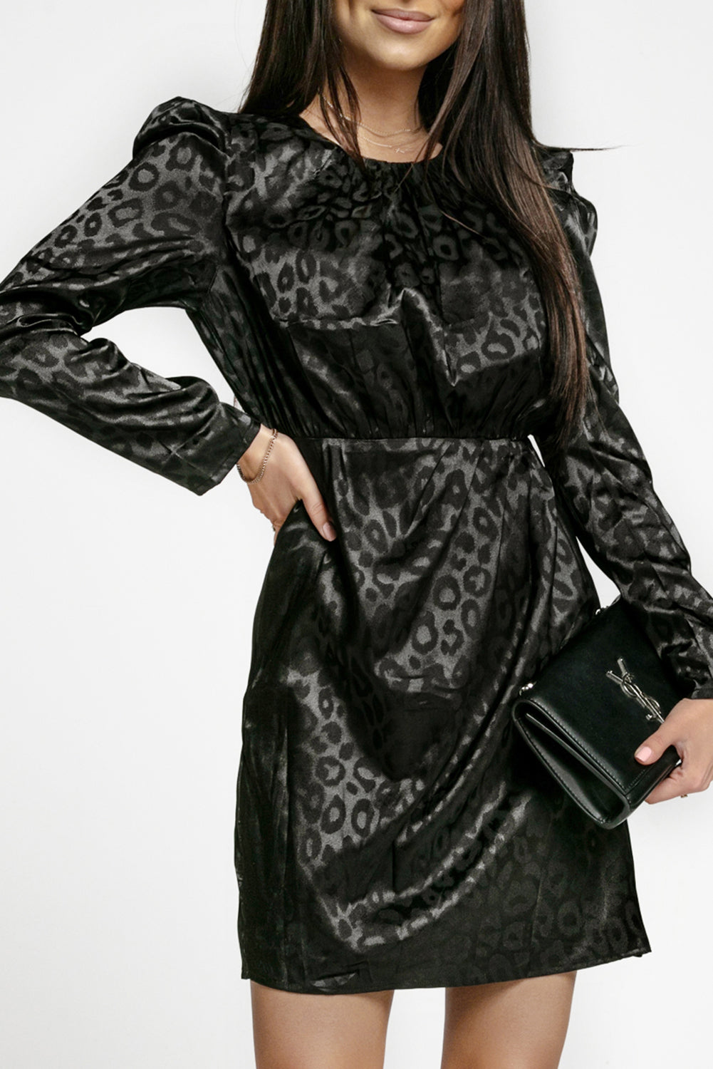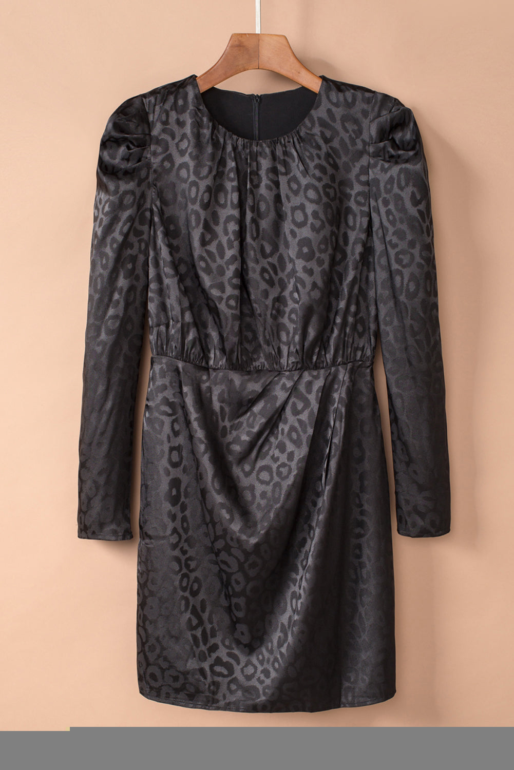 • Round neck. puff sleeves. ruched detail front and thigh-high length