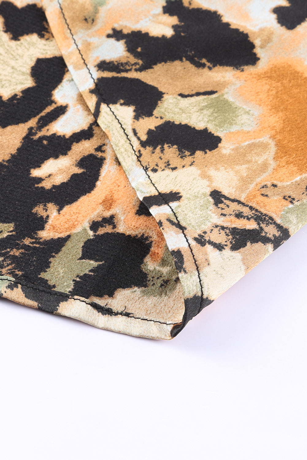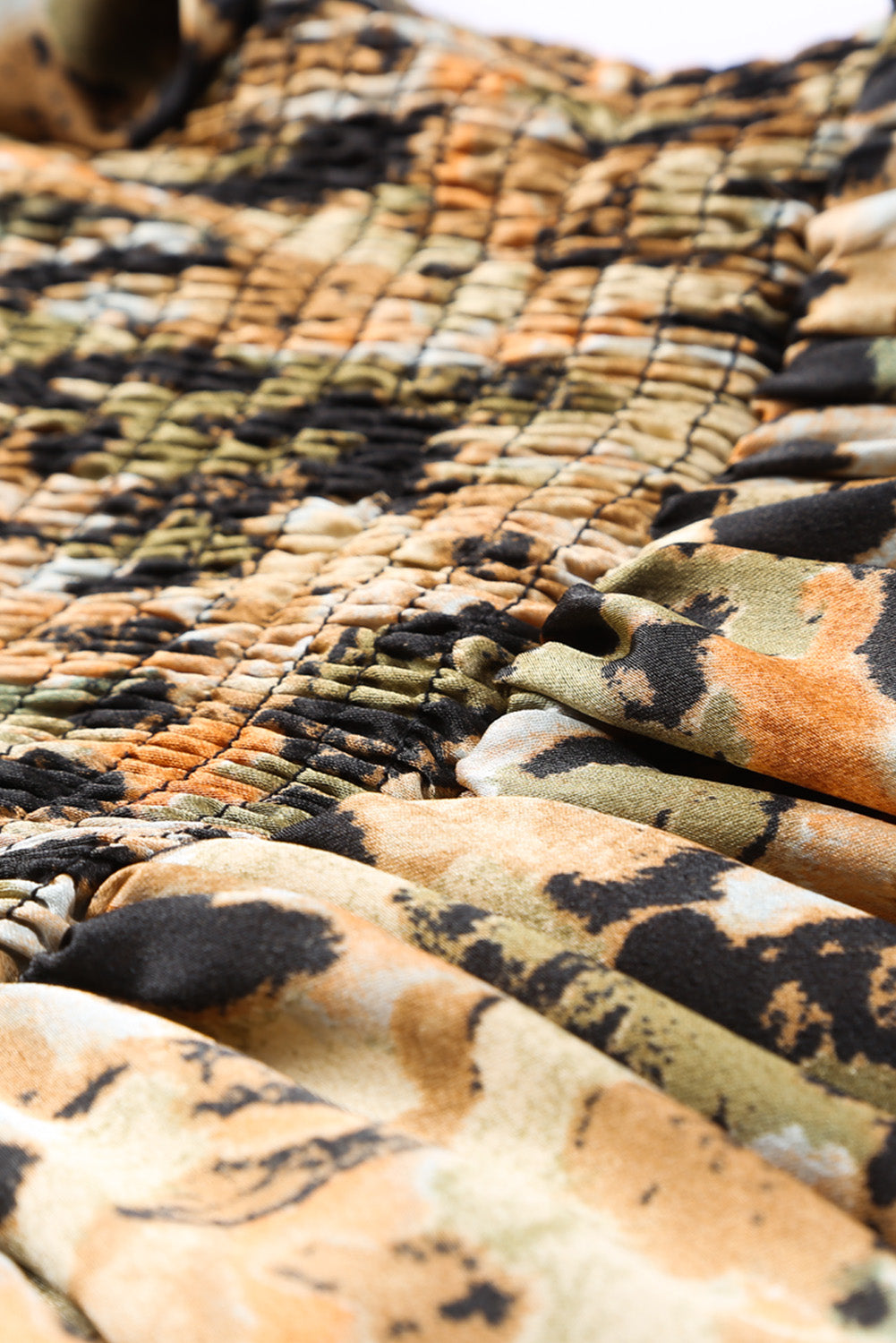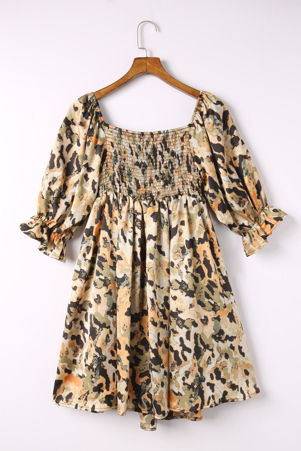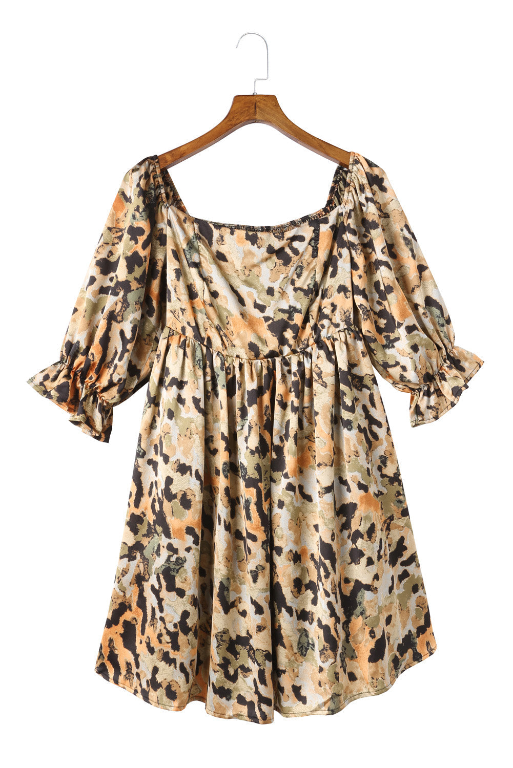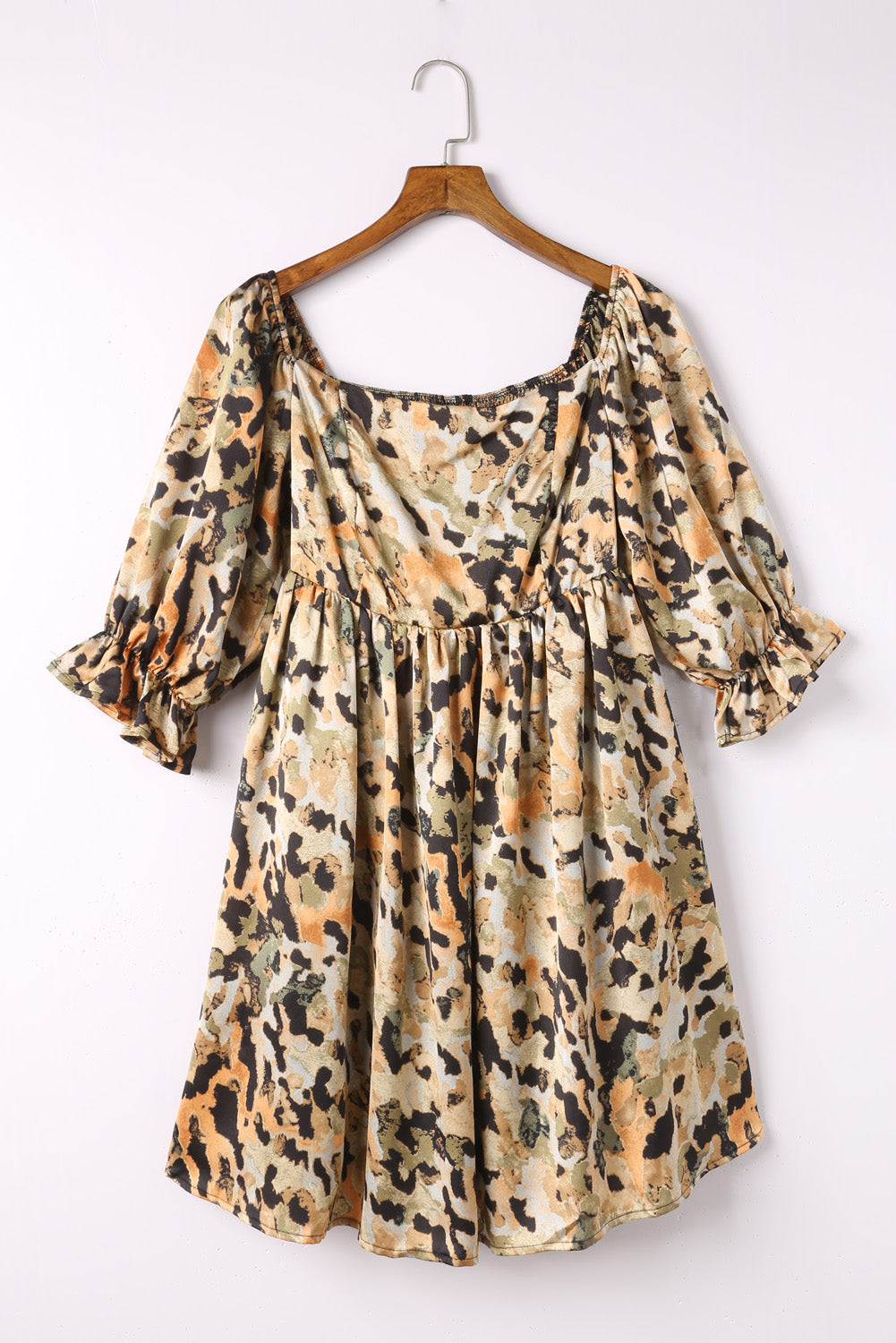 Multicolor Abstract Print Shirred Half Sleeve Square Neck Mini Dress