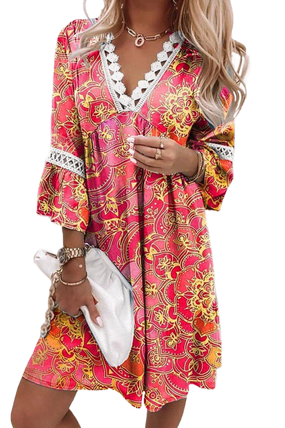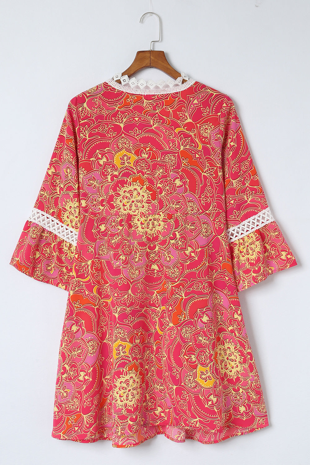Multicolor Crochet V Neck 3/4 Sleeves Ruffle Dress