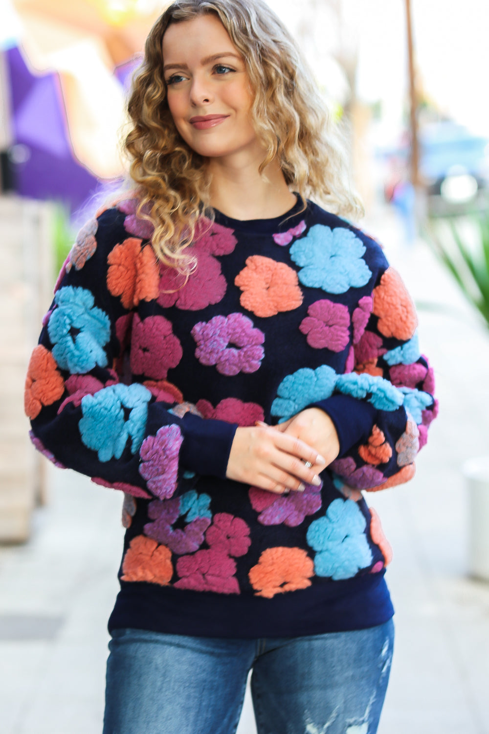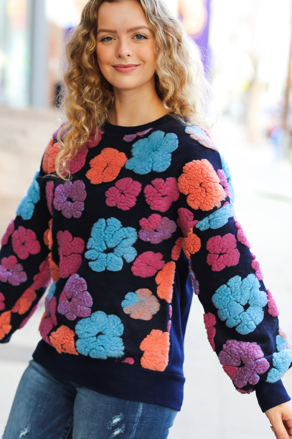 This unique embroidered sherpa flower knit pullover will keep you looking fun and feeling comfy all Amicgon long. The round neck and oversized look complete this top.