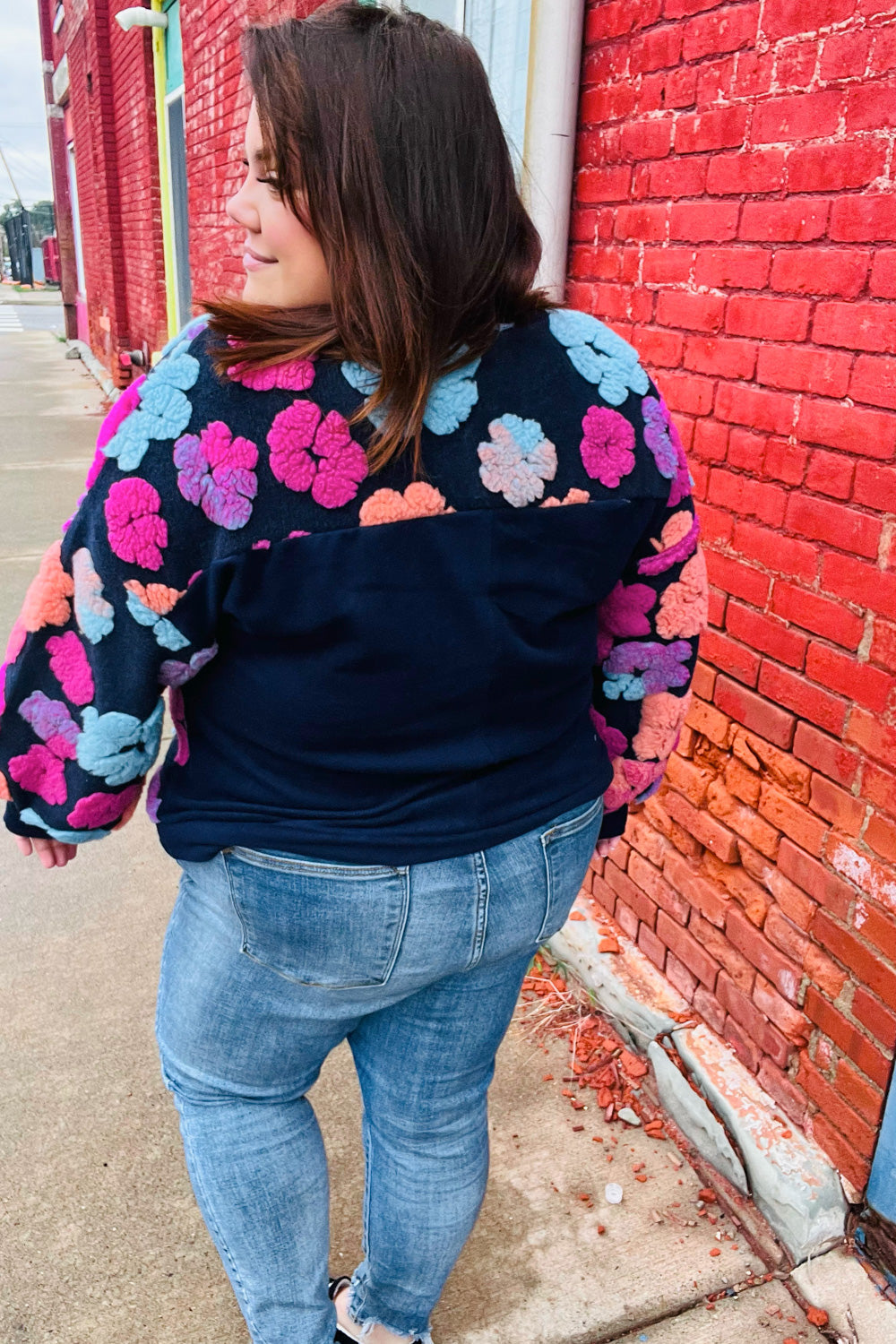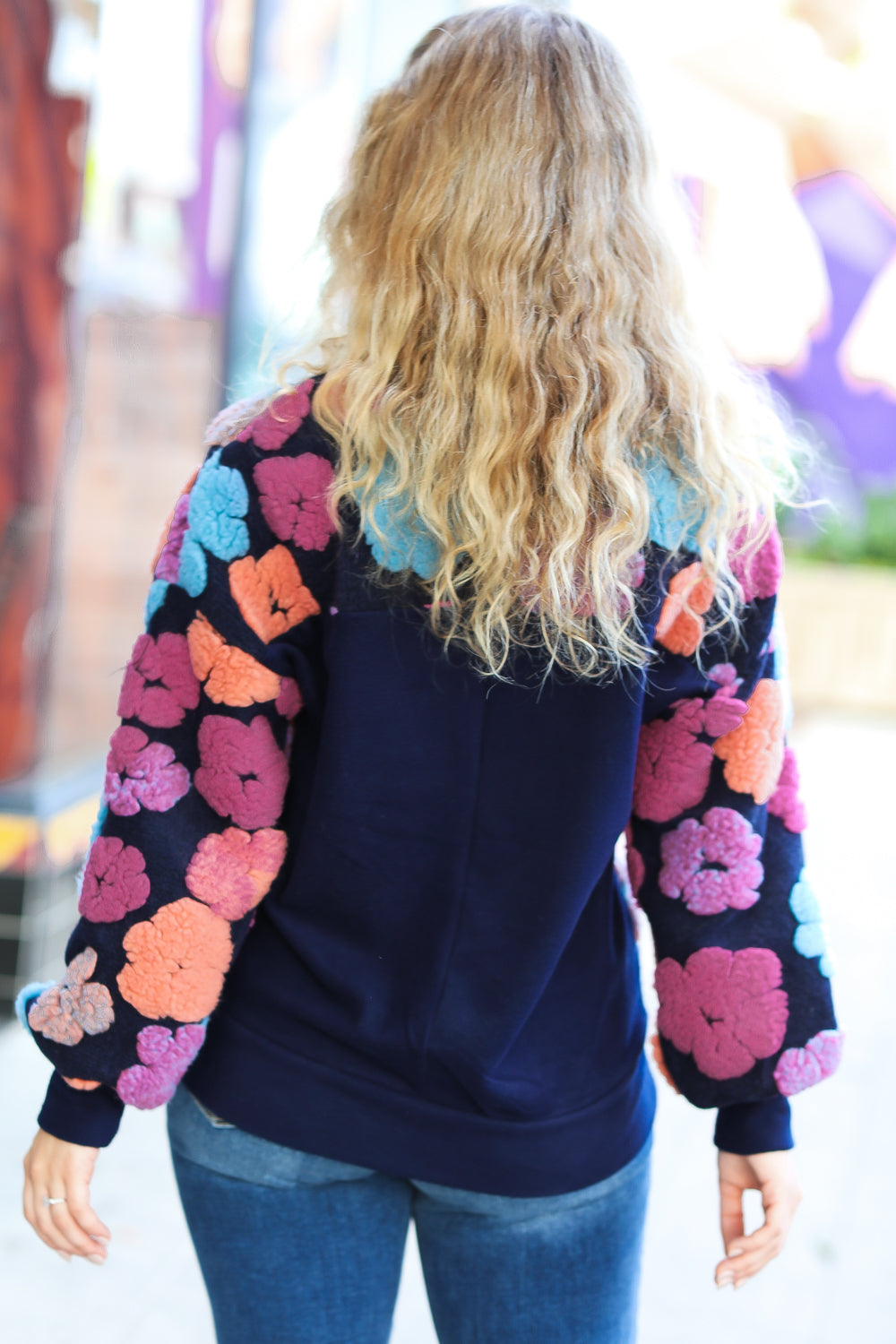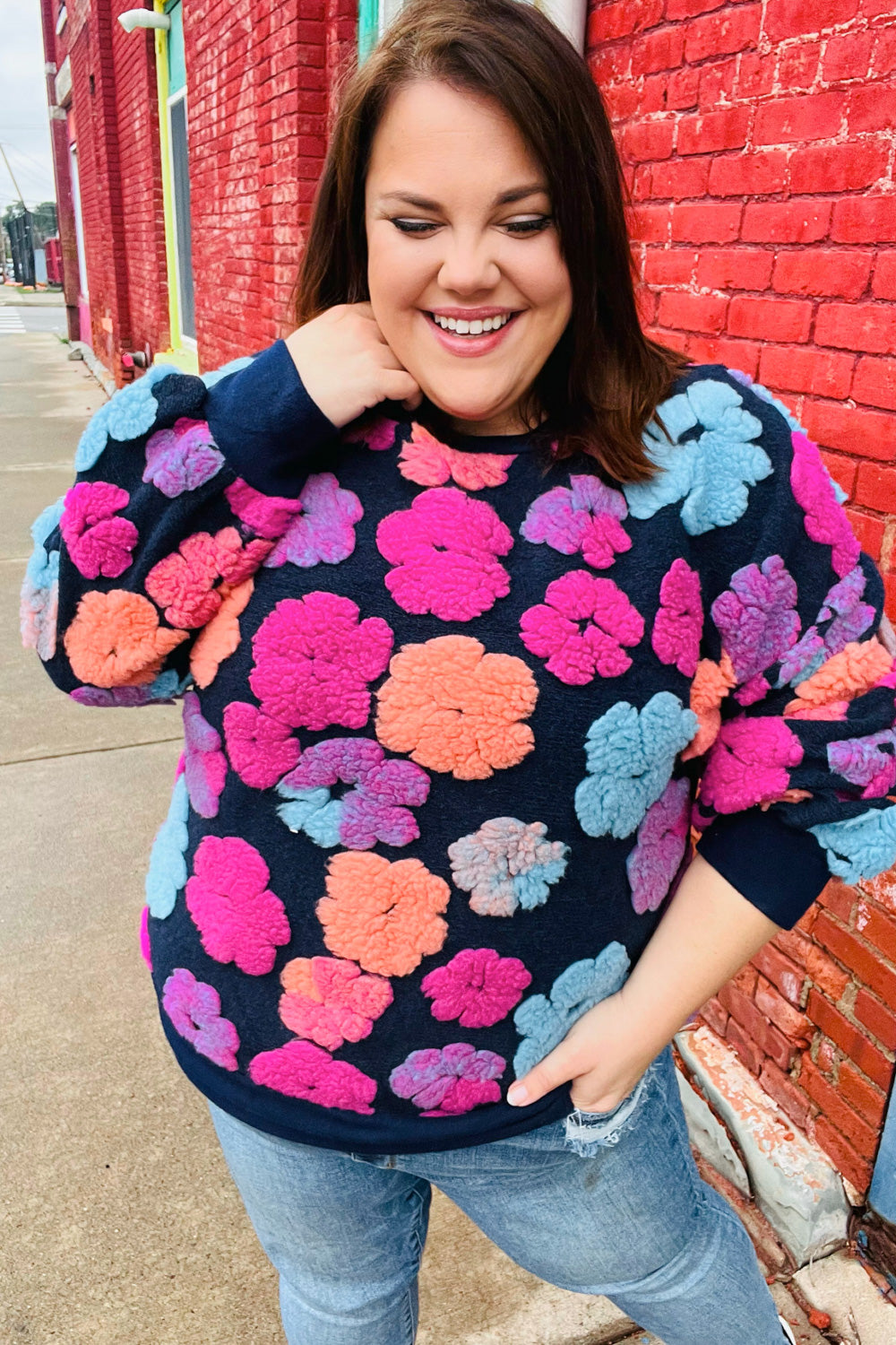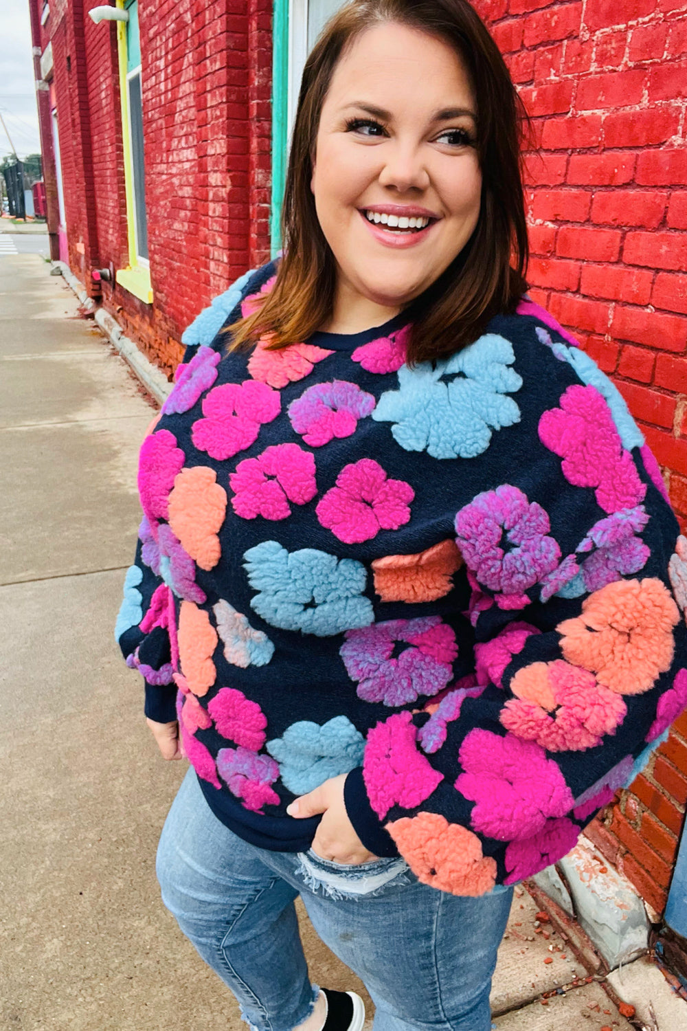 Feeling Joyful Navy & Fuchsia Embroidered Sherpa Flower Pullover