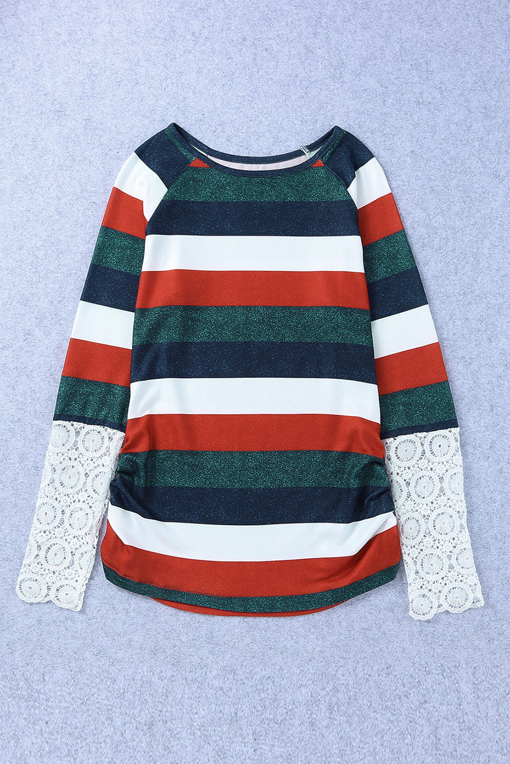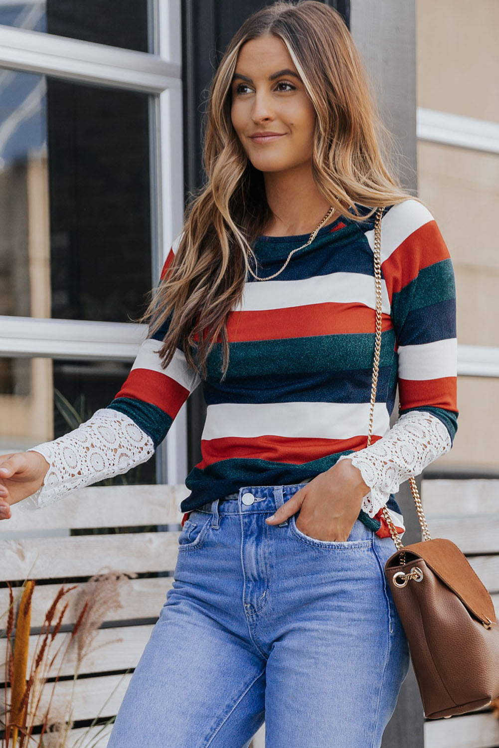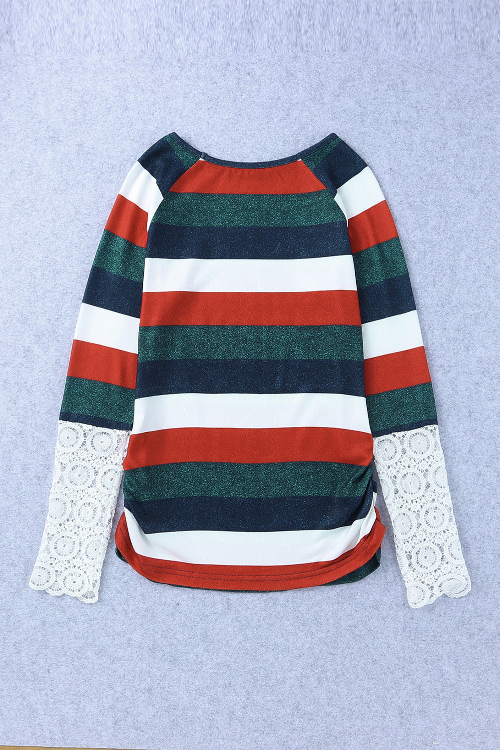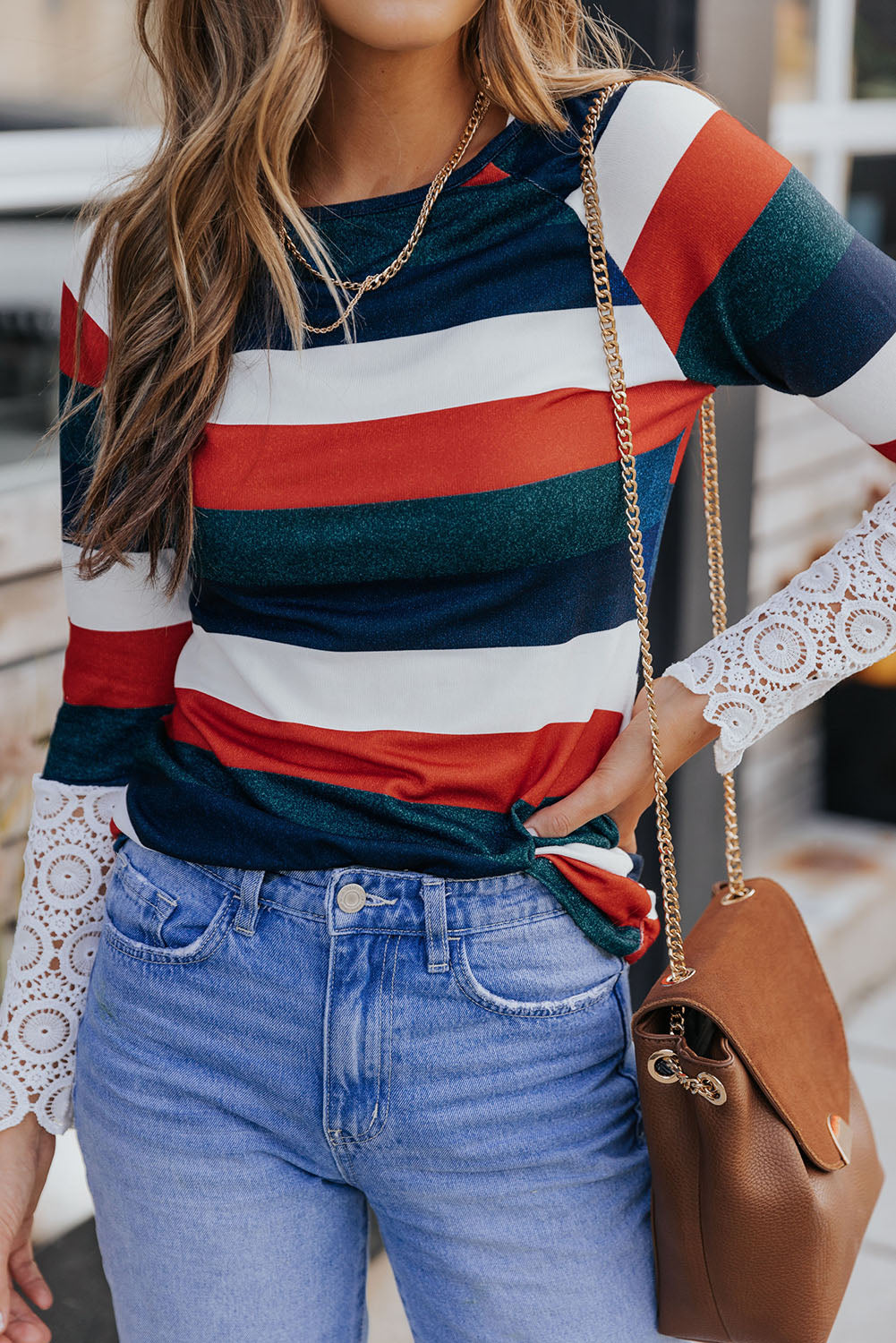 Orange Green Striped Lace Splicing Long Sleeve Top