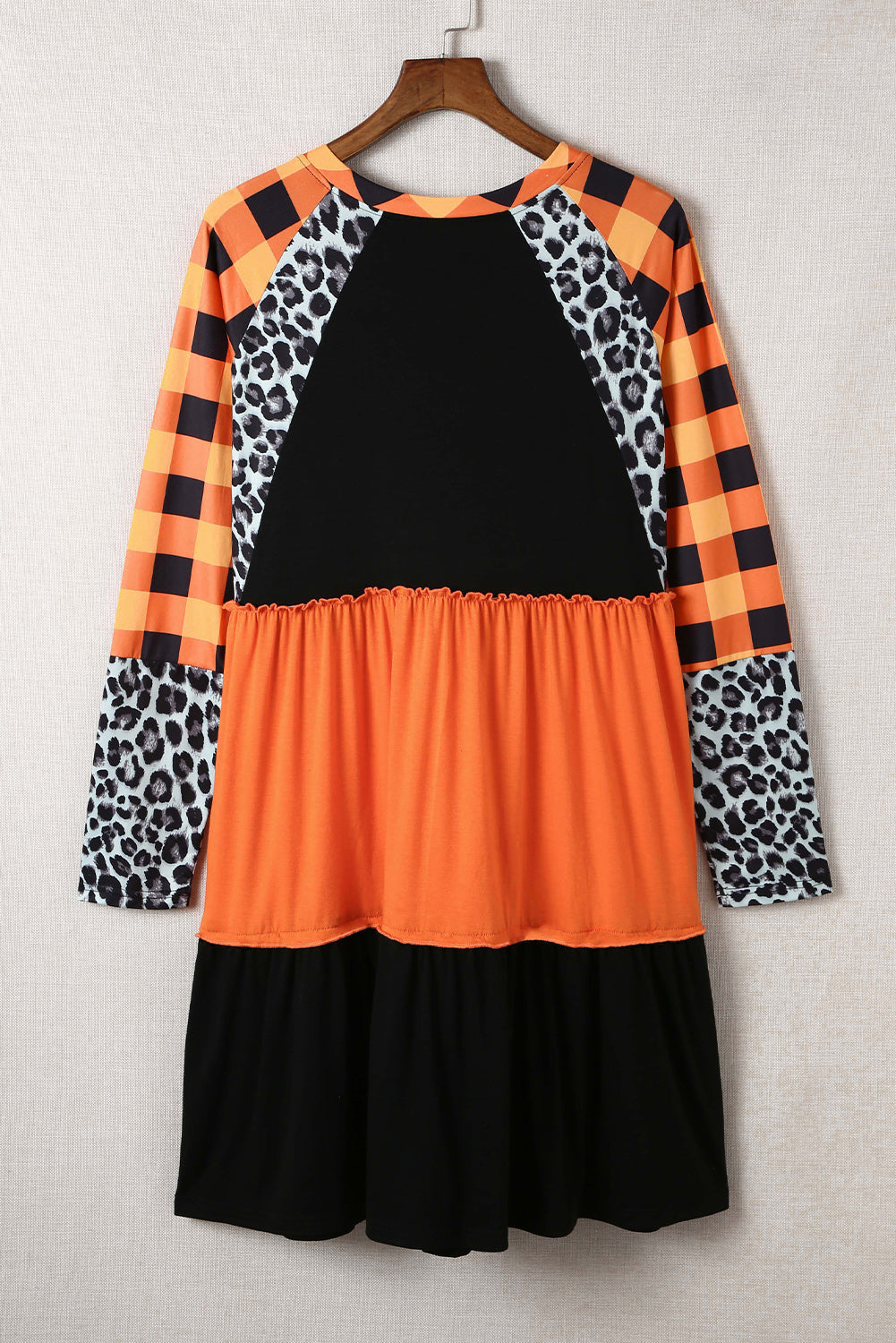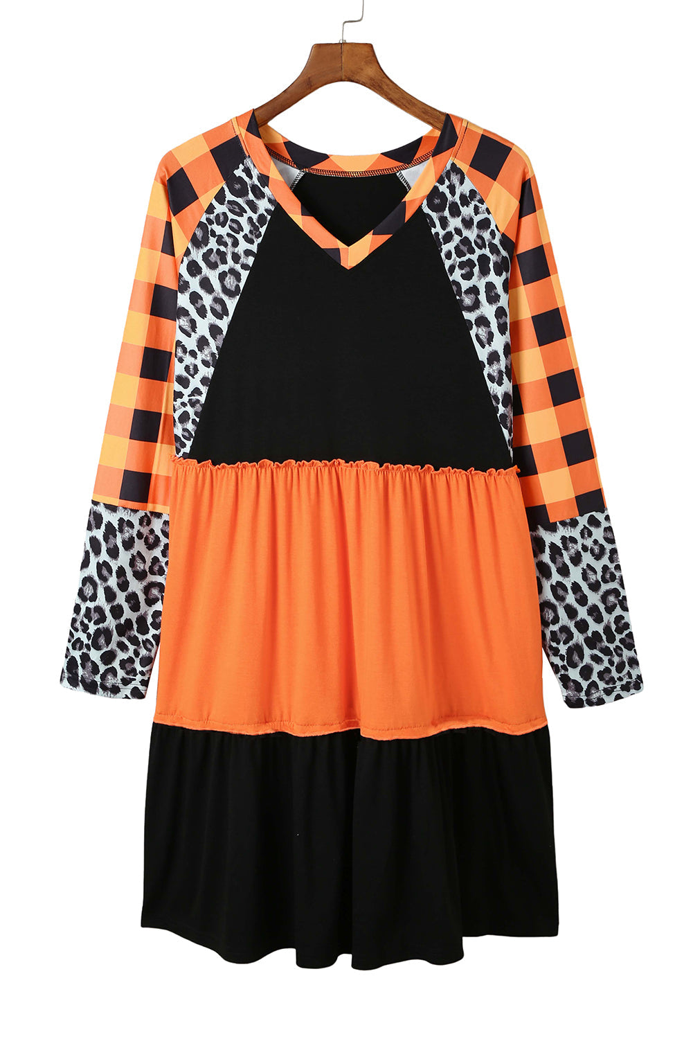 Orange Leopard Plaid Ruffled Long Sleeve Mini Dress