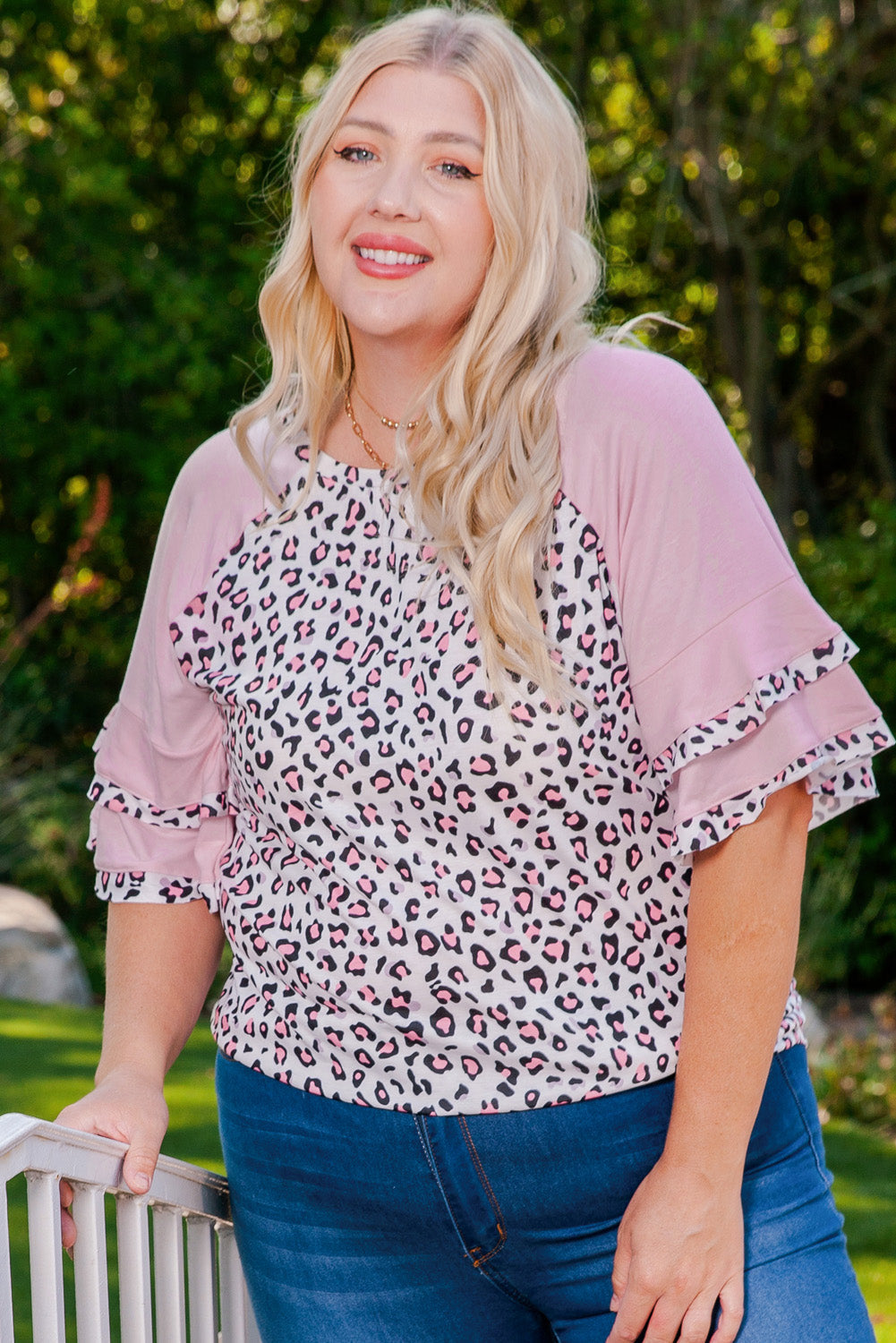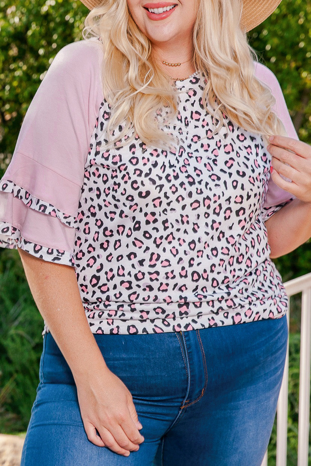 Pink Plus Size Ruffle Raglan Sleeve Leopard Top