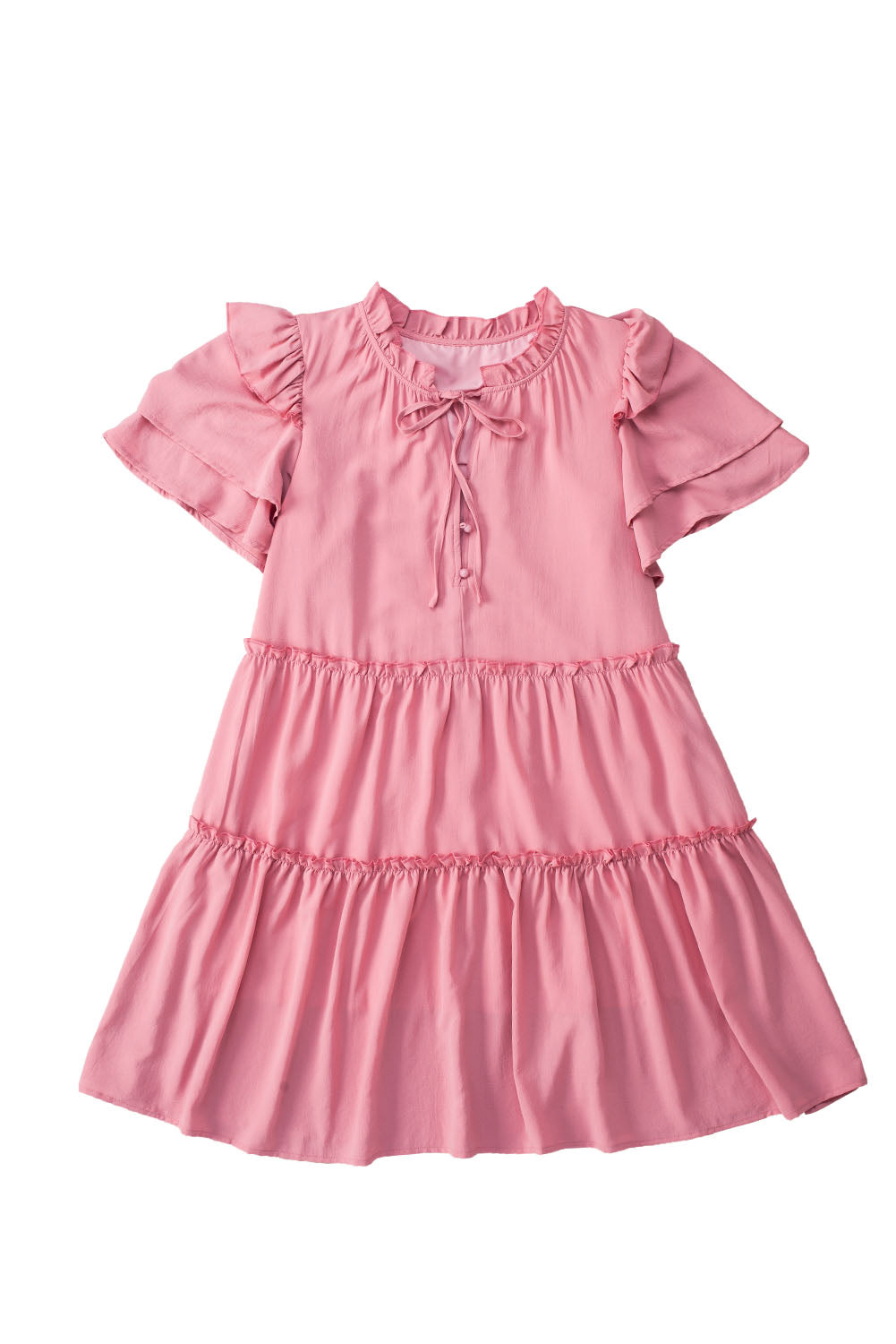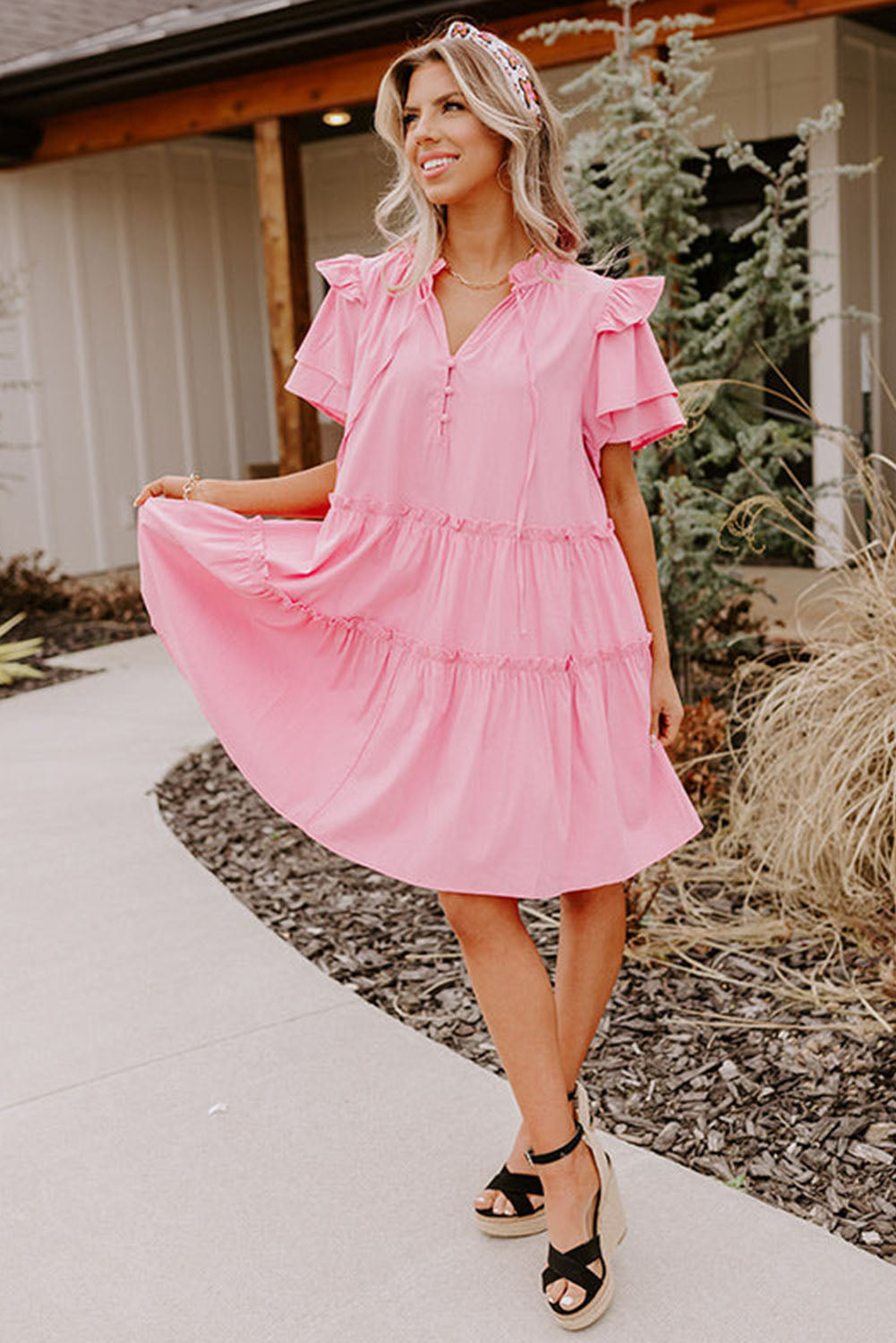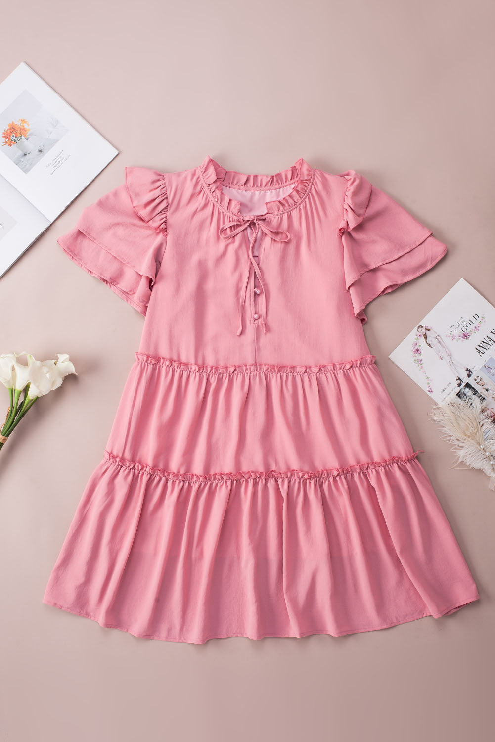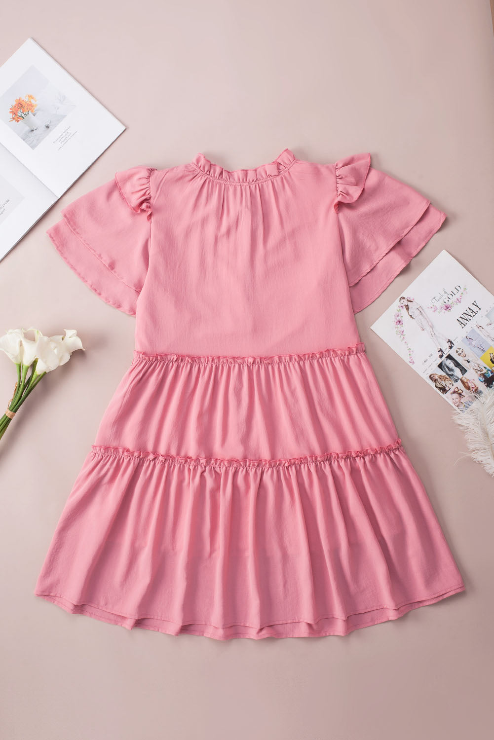 Pink V Neck Layered Ruffled Sleeves Mini Dress