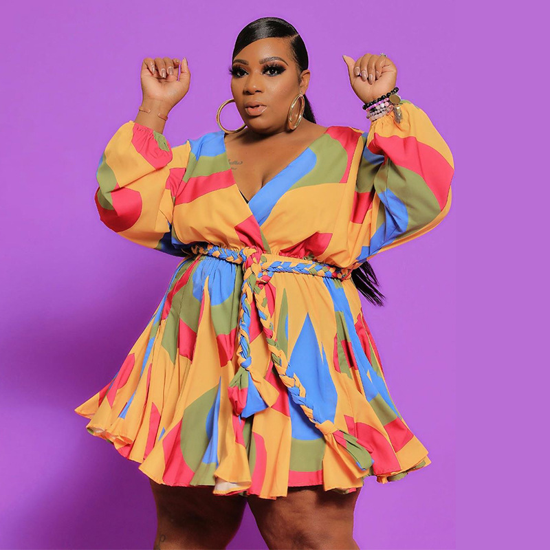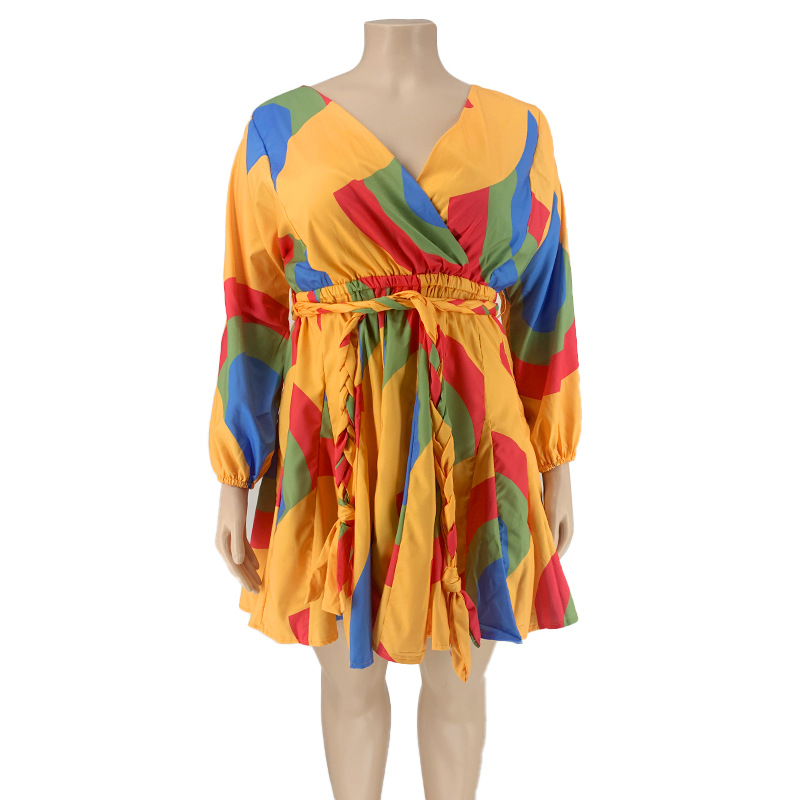 Plus Size Printed V-neck Sexy Woven Large Swing Dress with Belt Women Dress