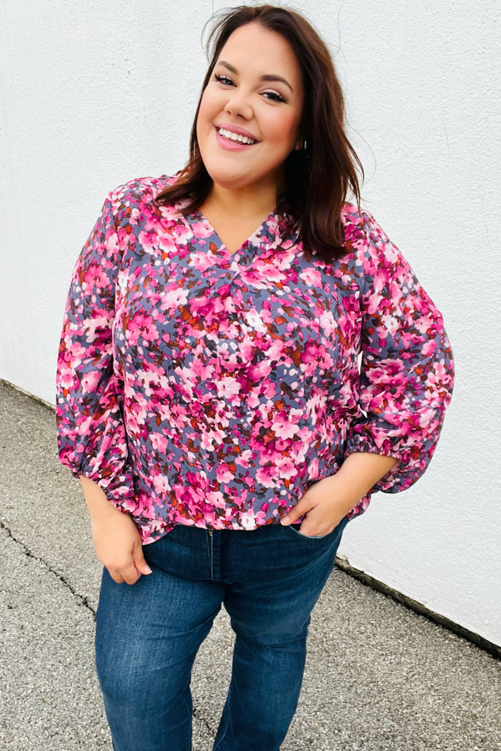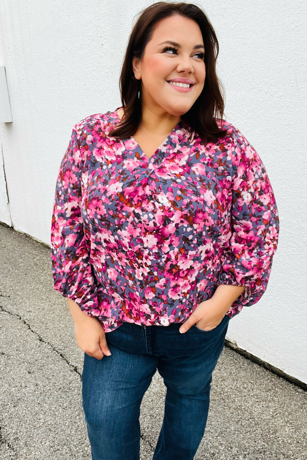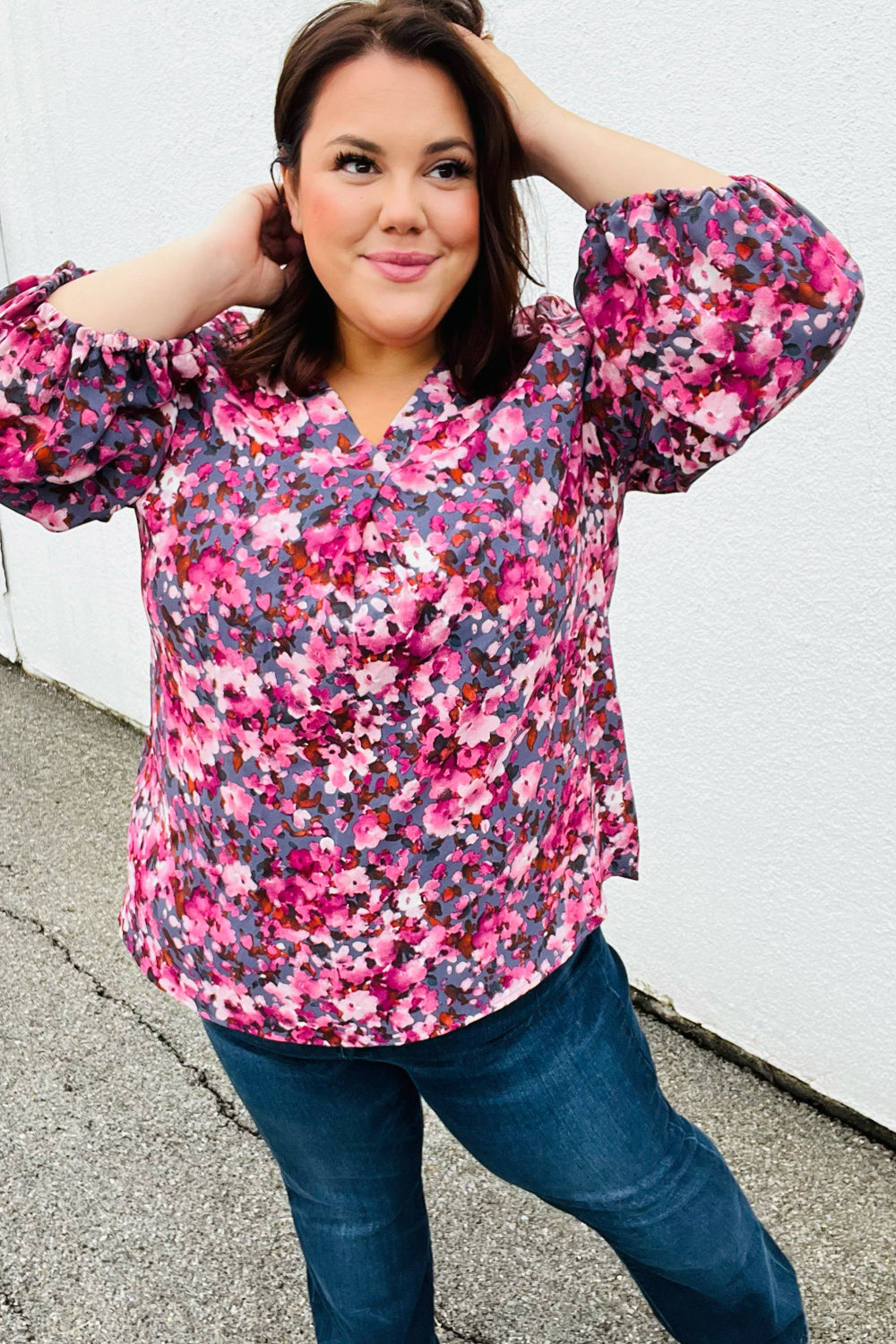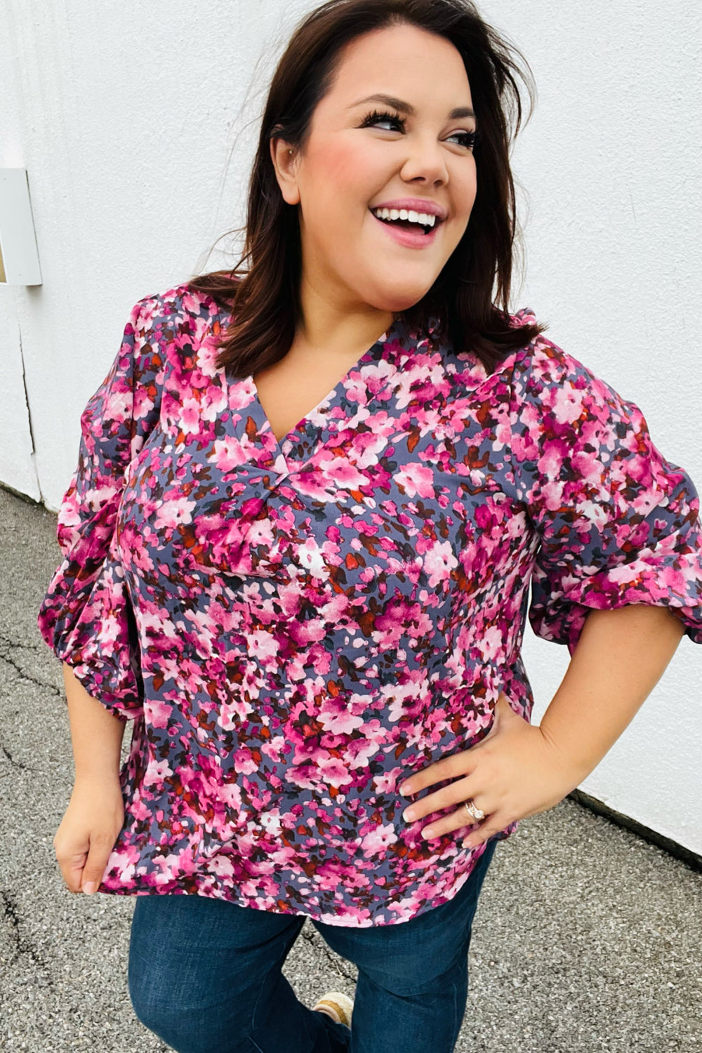 Donning a banded V neck and floral print. this woven top features flowy three quarter elastic bubble sleeves and a flattering silhouette. Wear with skinny jeans for a stunning contrast.