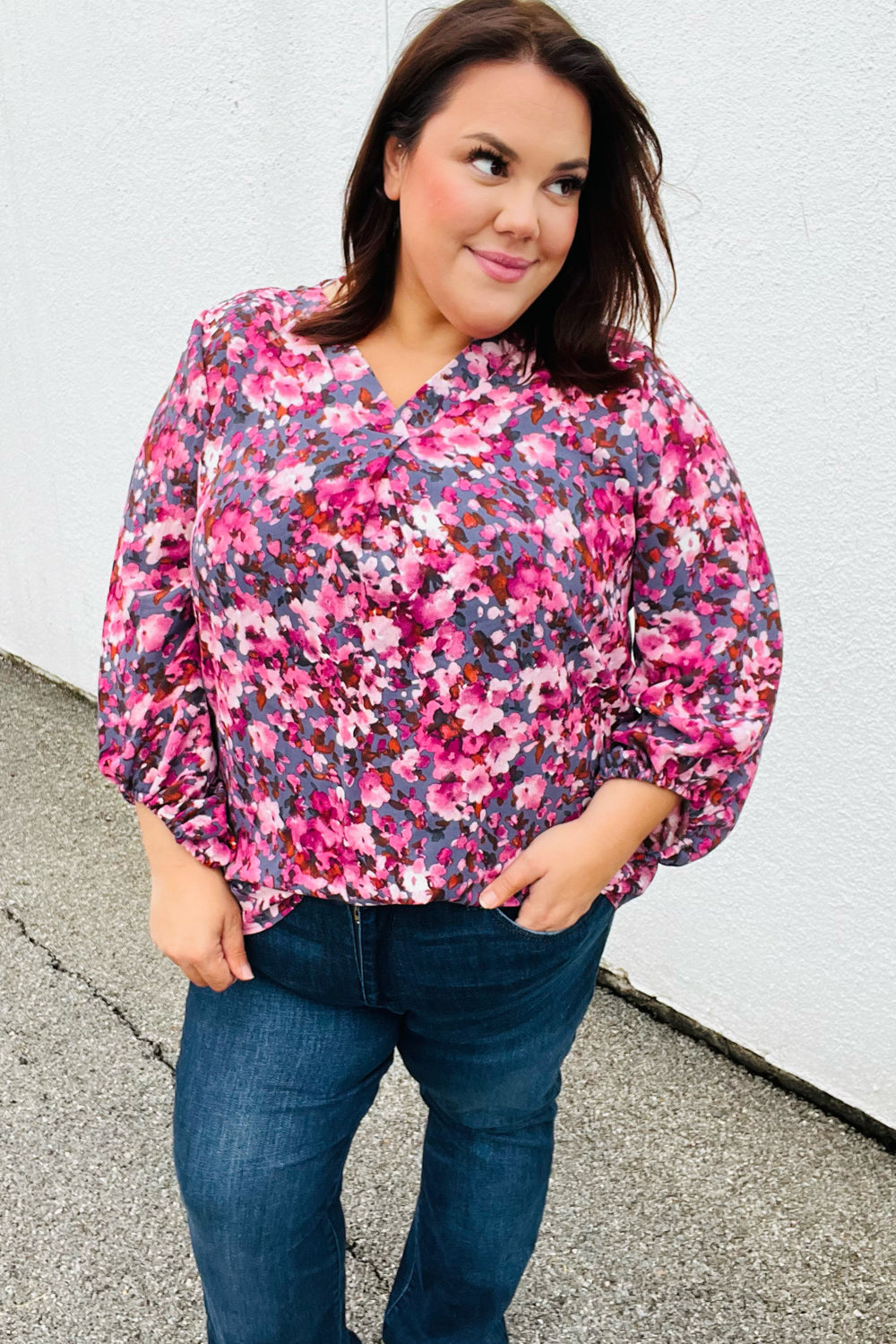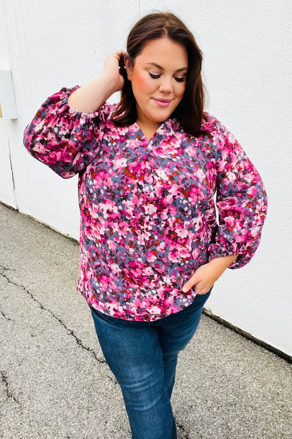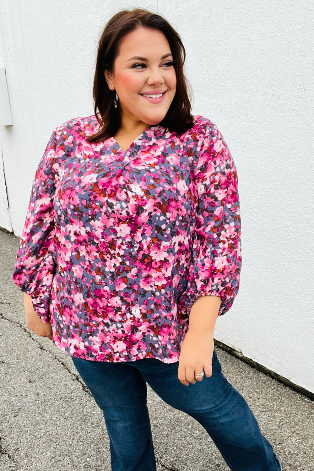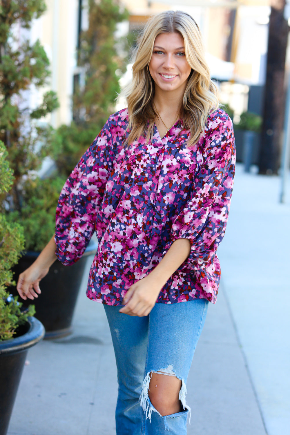 Donning a banded V neck and floral print. this woven top features flowy three quarter elastic bubble sleeves and a flattering silhouette. Wear with skinny jeans for a stunning contrast.