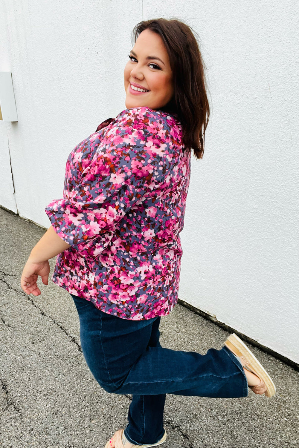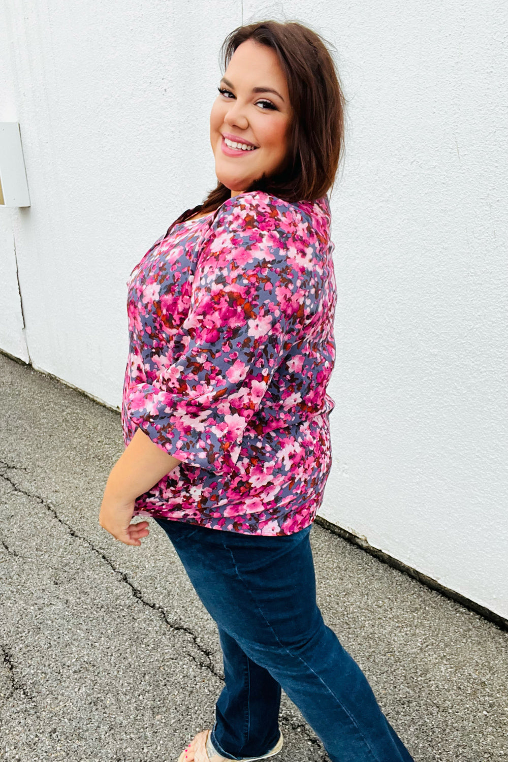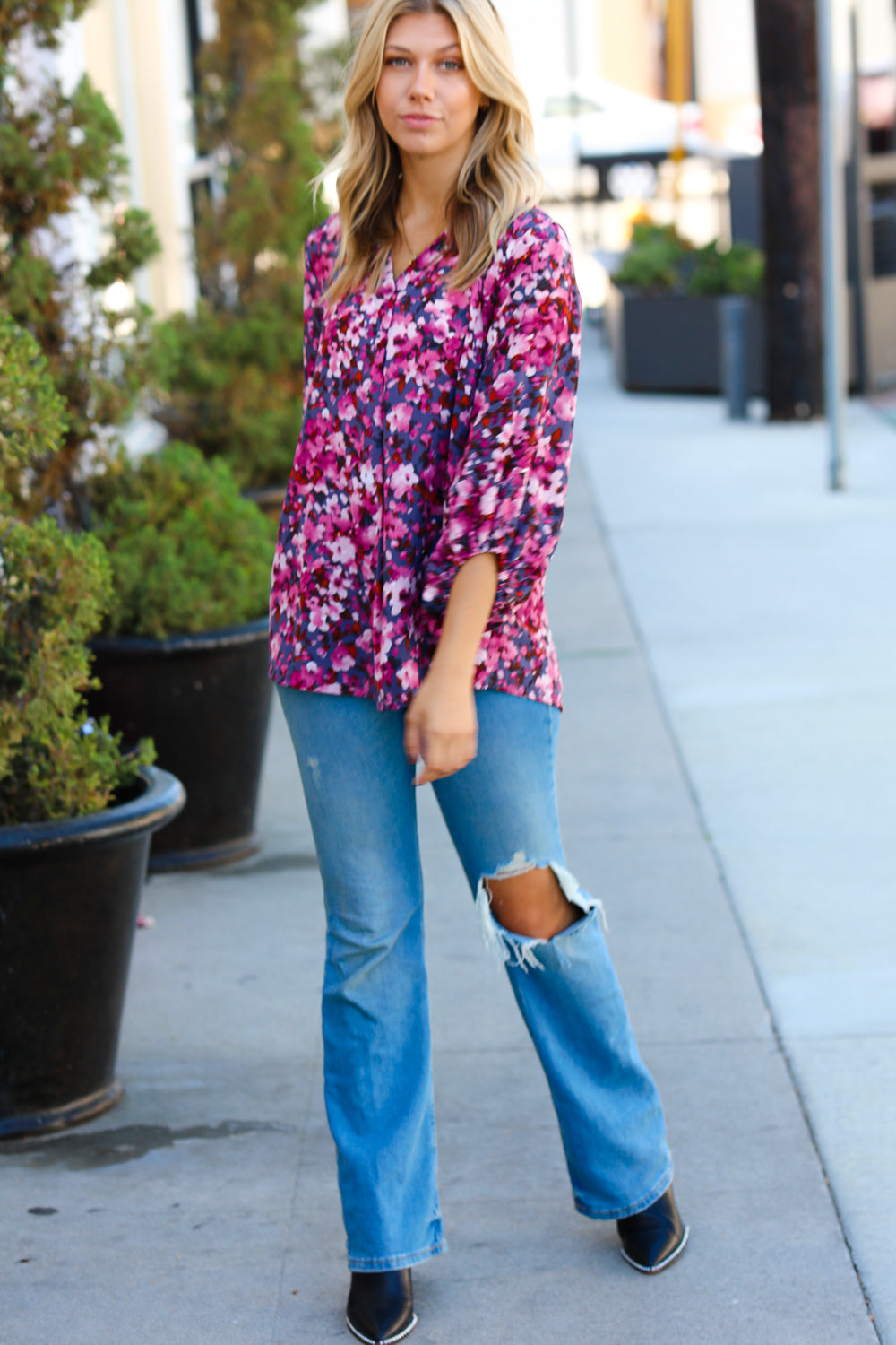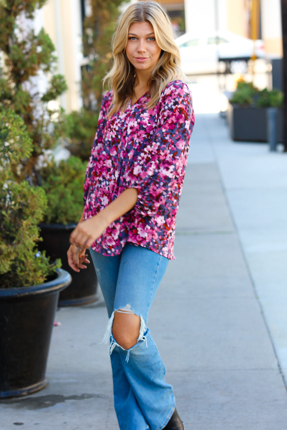Donning a banded V neck and floral print. this woven top features flowy three quarter elastic bubble sleeves and a flattering silhouette. Wear with skinny jeans for a stunning contrast.