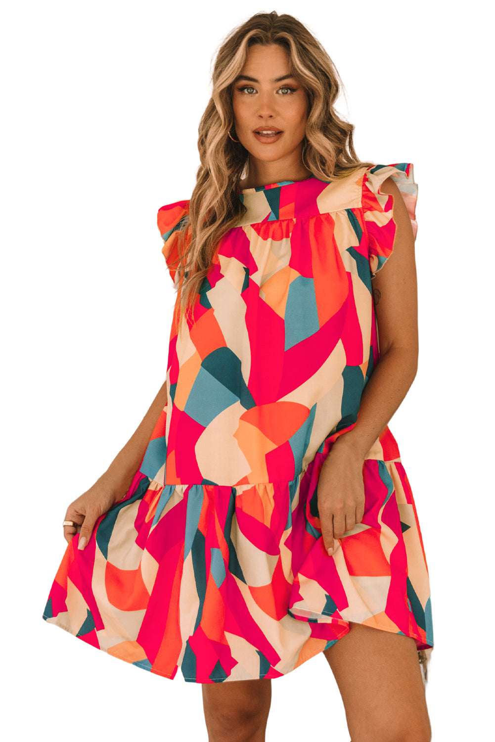 Red Abstract Geometric Print Flutter Sleeve Babydoll Dress