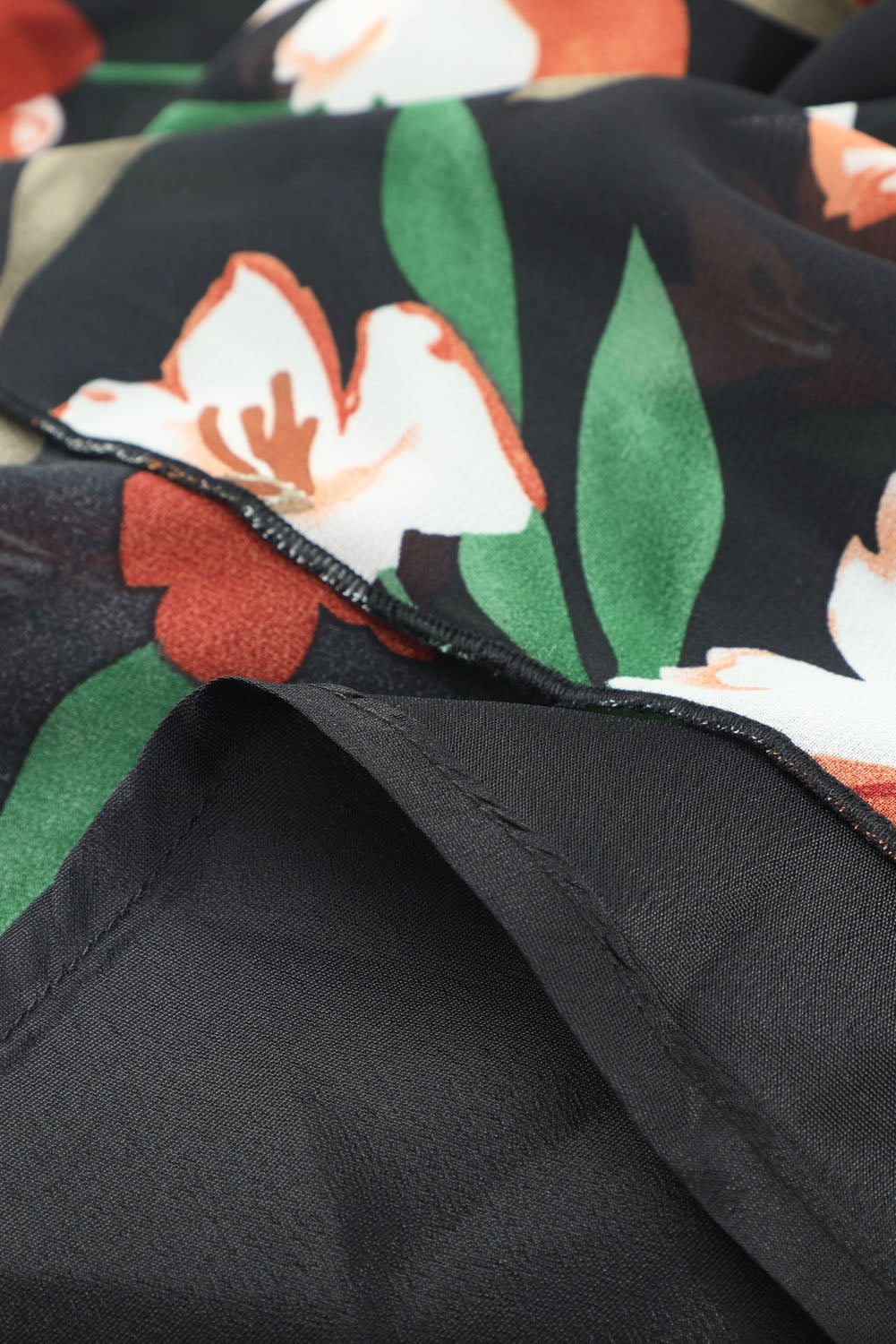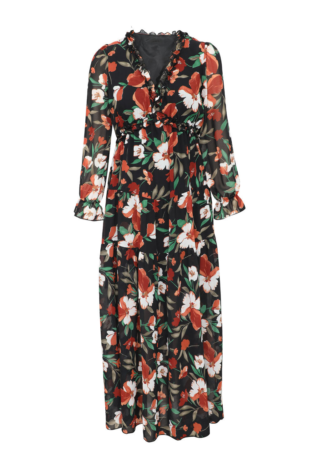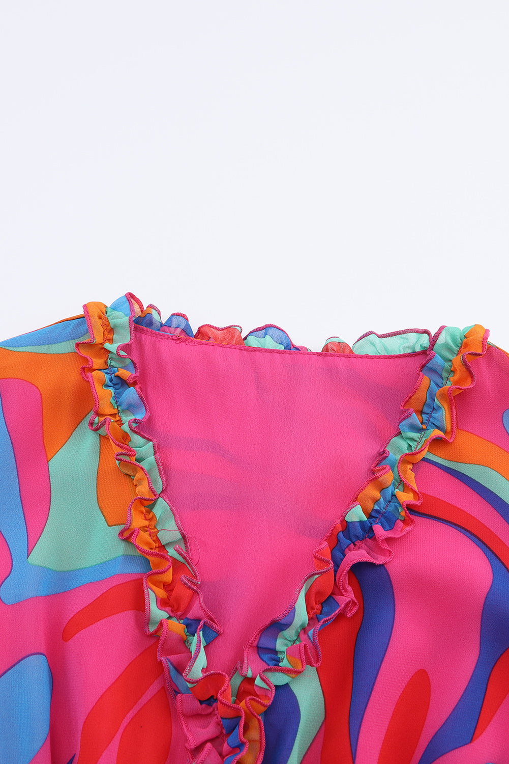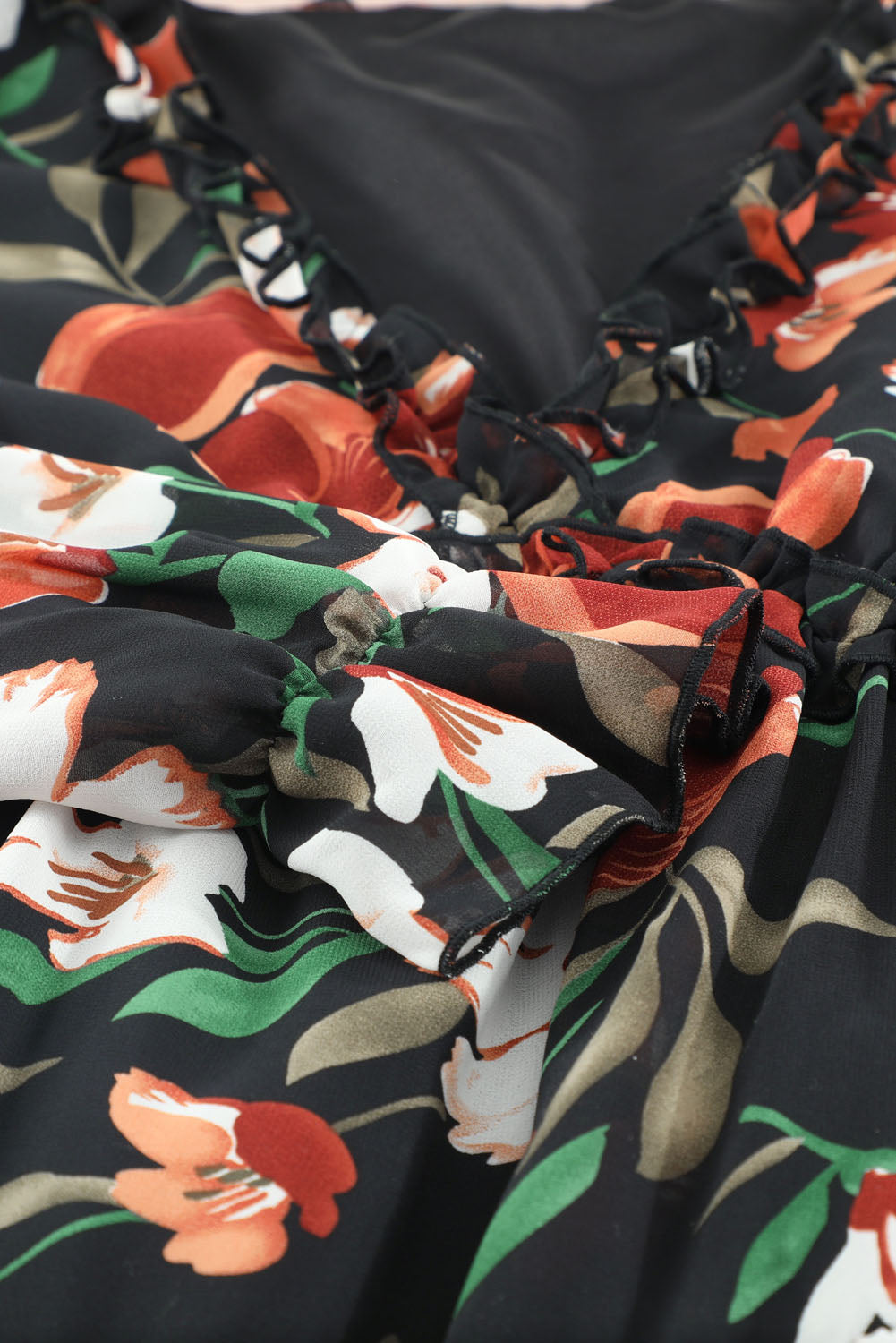 Red Boho Floral Print Frill V Neck Sleeveless Dress