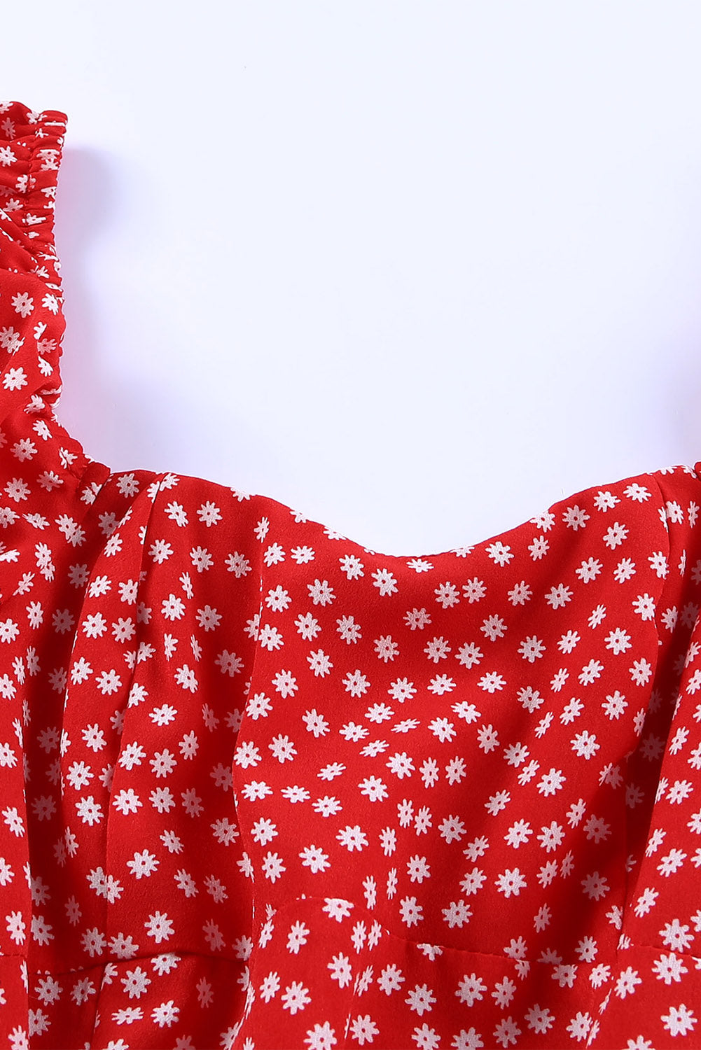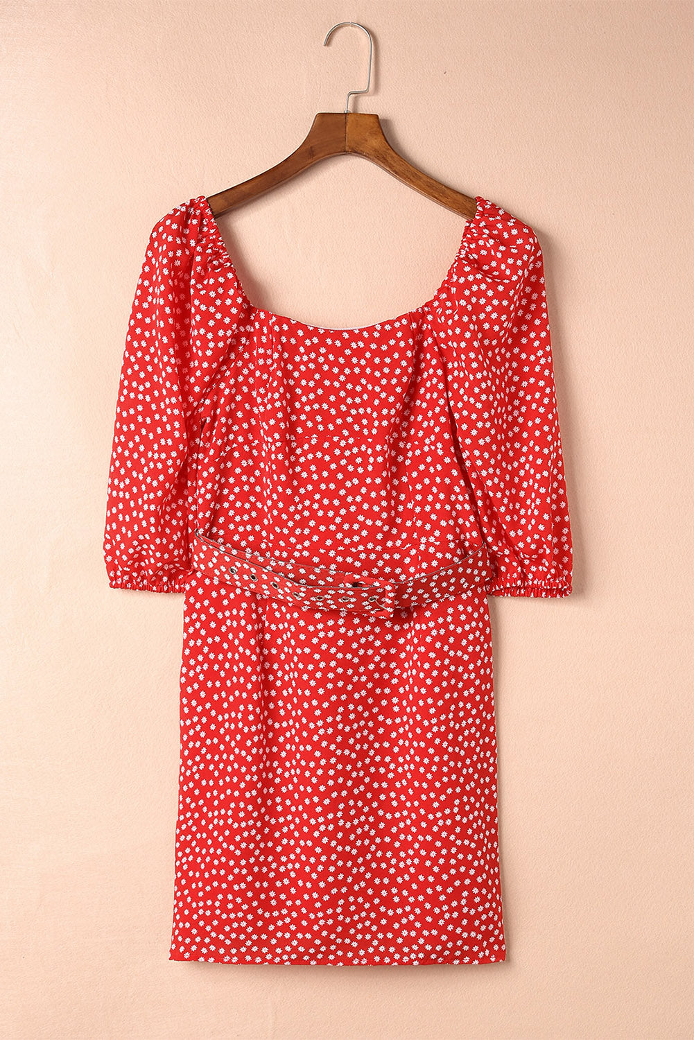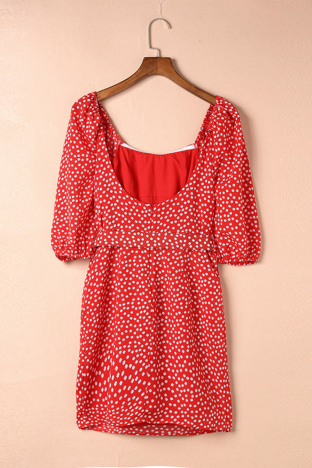 Red Daisy Print Square Neck Puff Sleeve Mini Dress