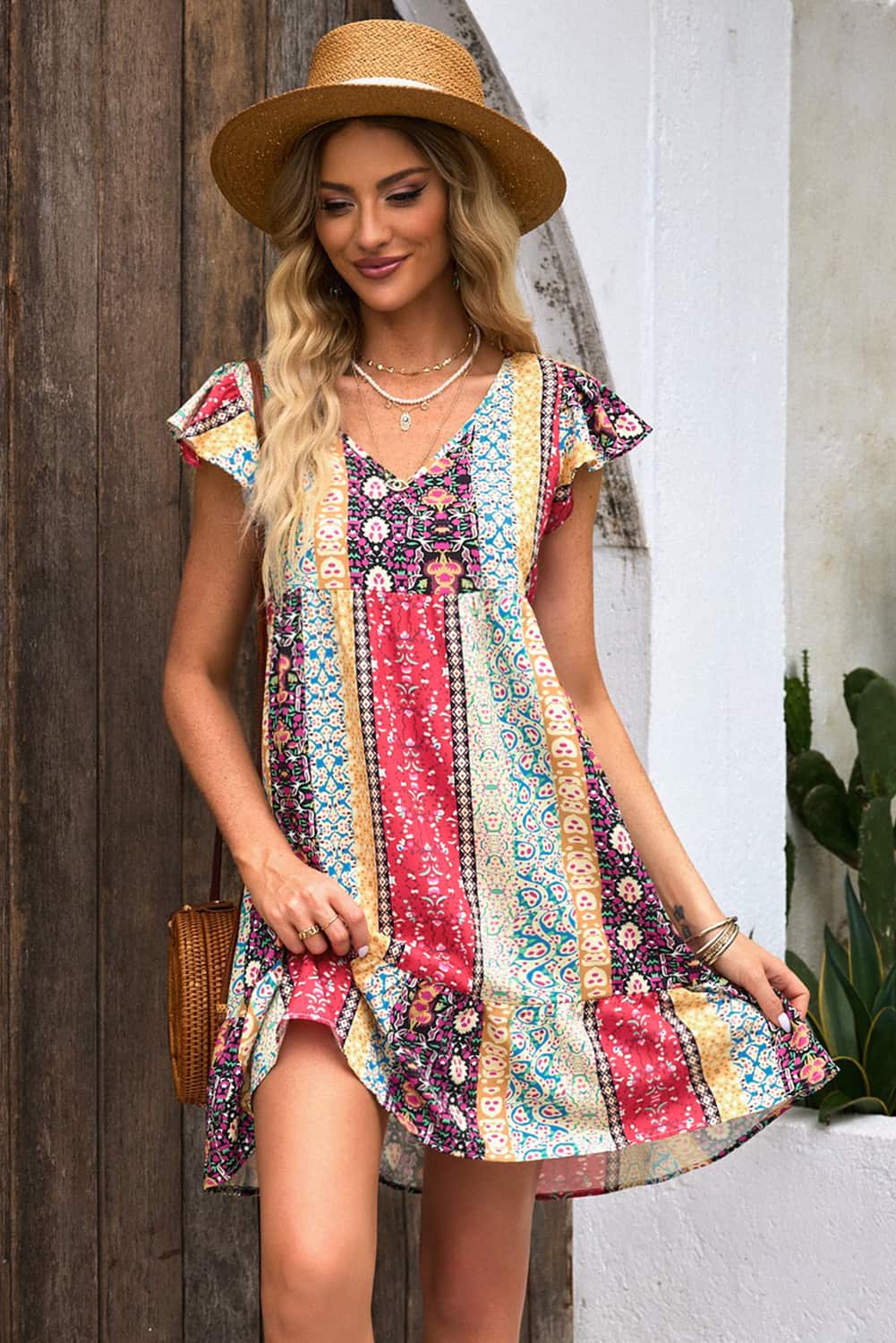 • Designed with a v-neckline. flutter sleeves and a mini length