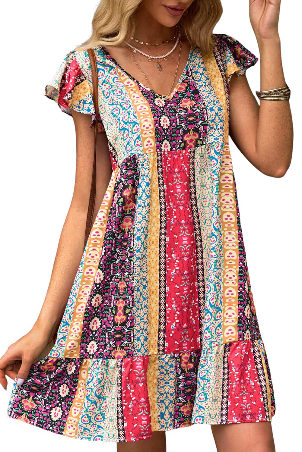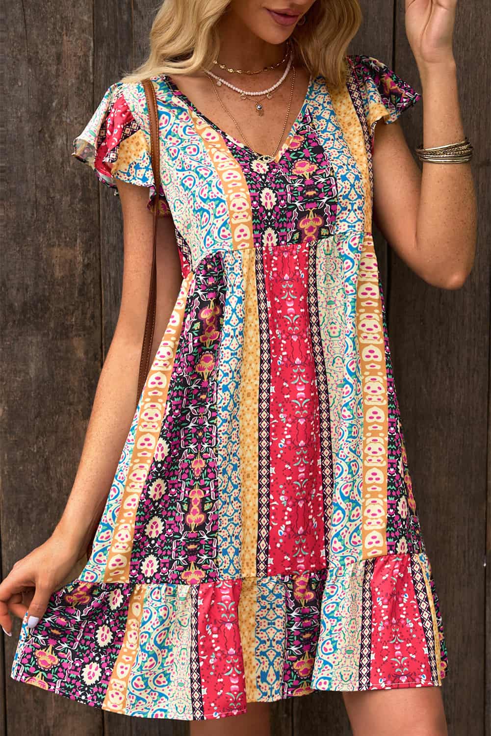 Red Floral Patchwork Print Flutter Sleeve Dress
