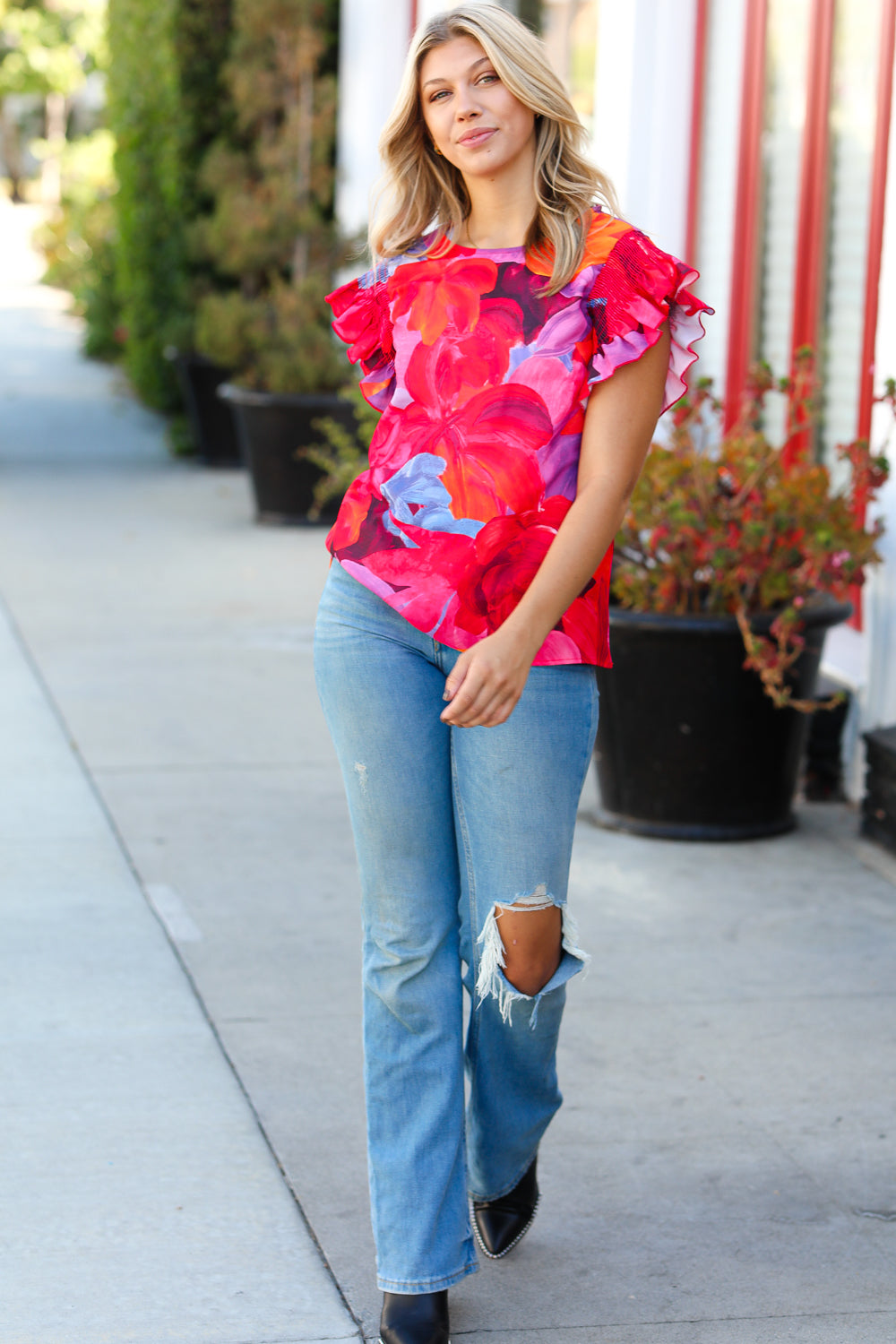 This stunning floral print chiffon top designed with smocked ruffle frill sleeves and a back neck button enclosure will catch glances everywhere you go!