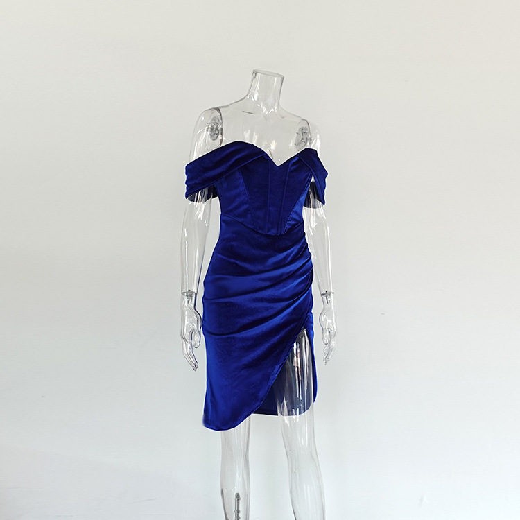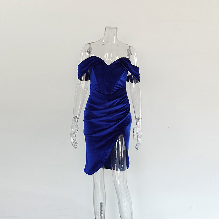 Retro off Shoulder Velvet Boning Corset Dress Irregular Asymmetric Slit Pleated Dress