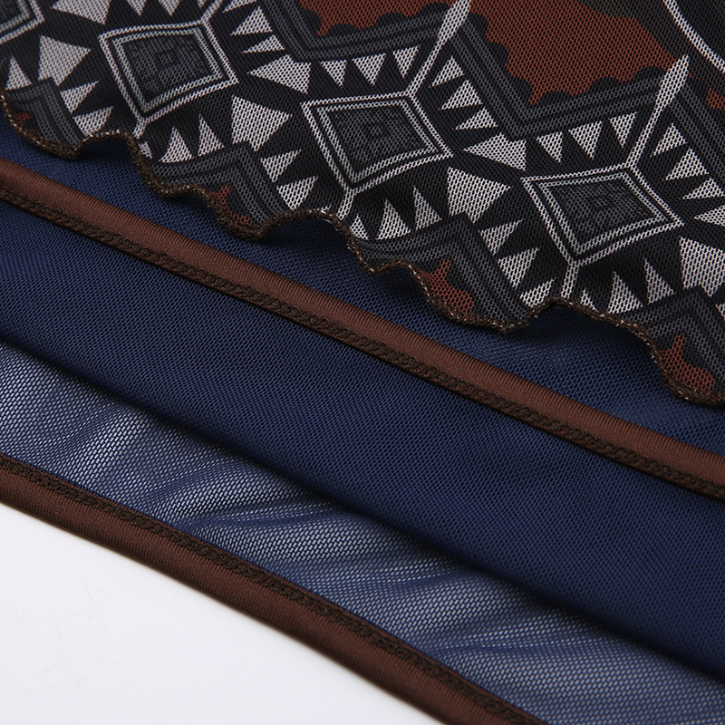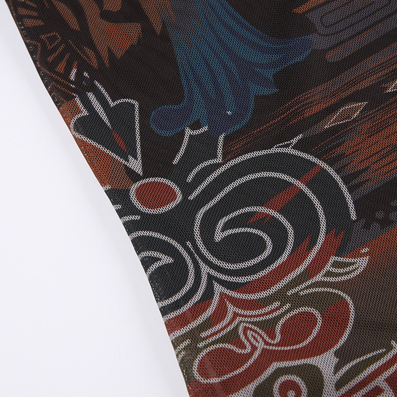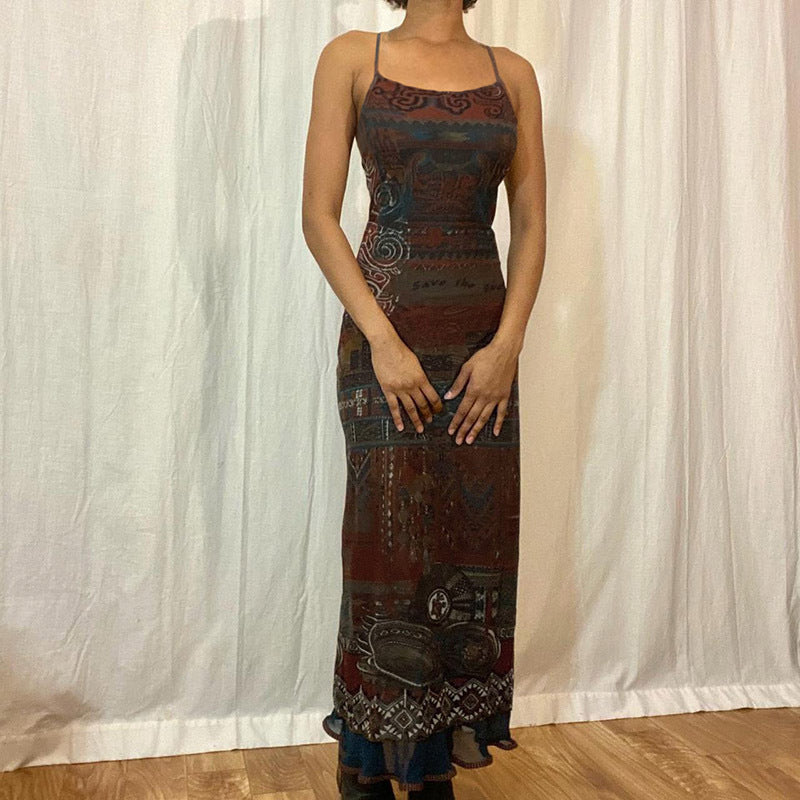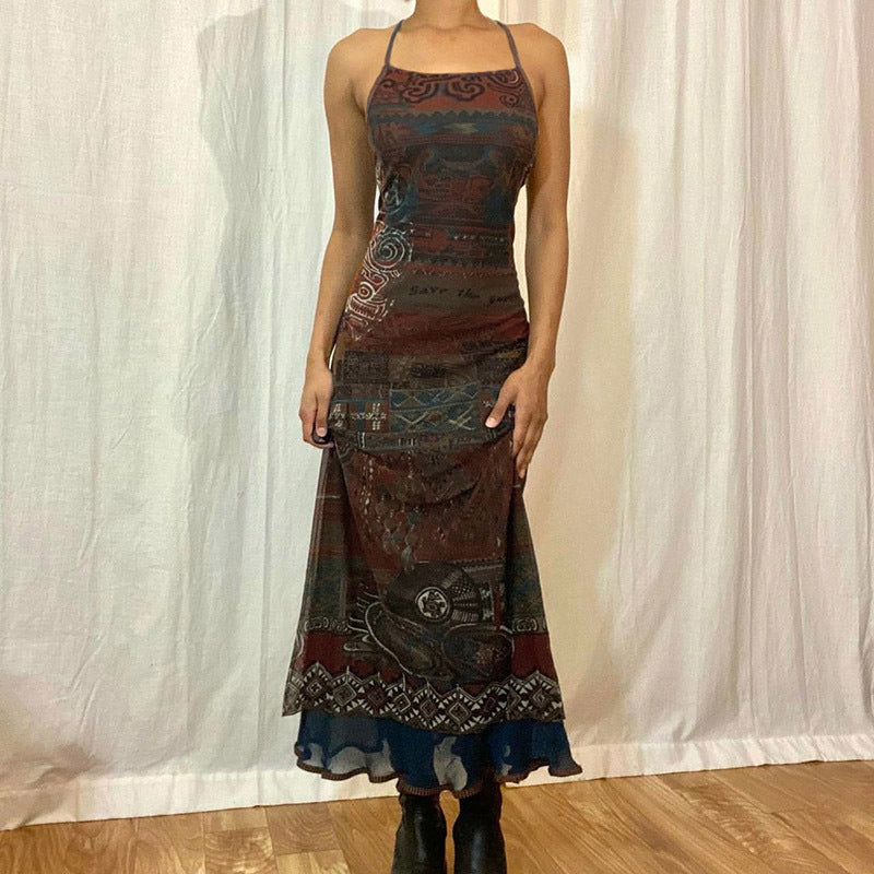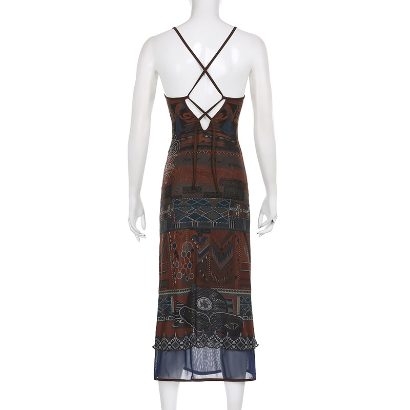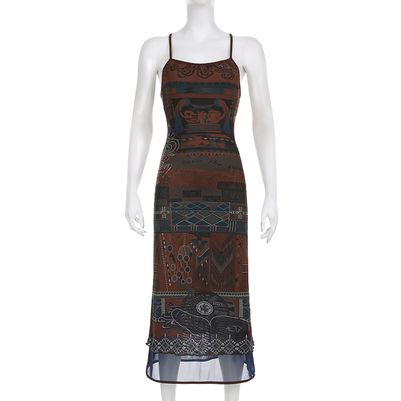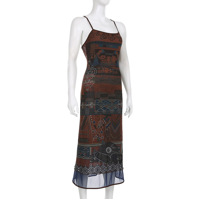 Retro Private Clothing Vacation Niche Printed Double Layer Mesh Backless Strap Dress Slim Fit Maxi Dress