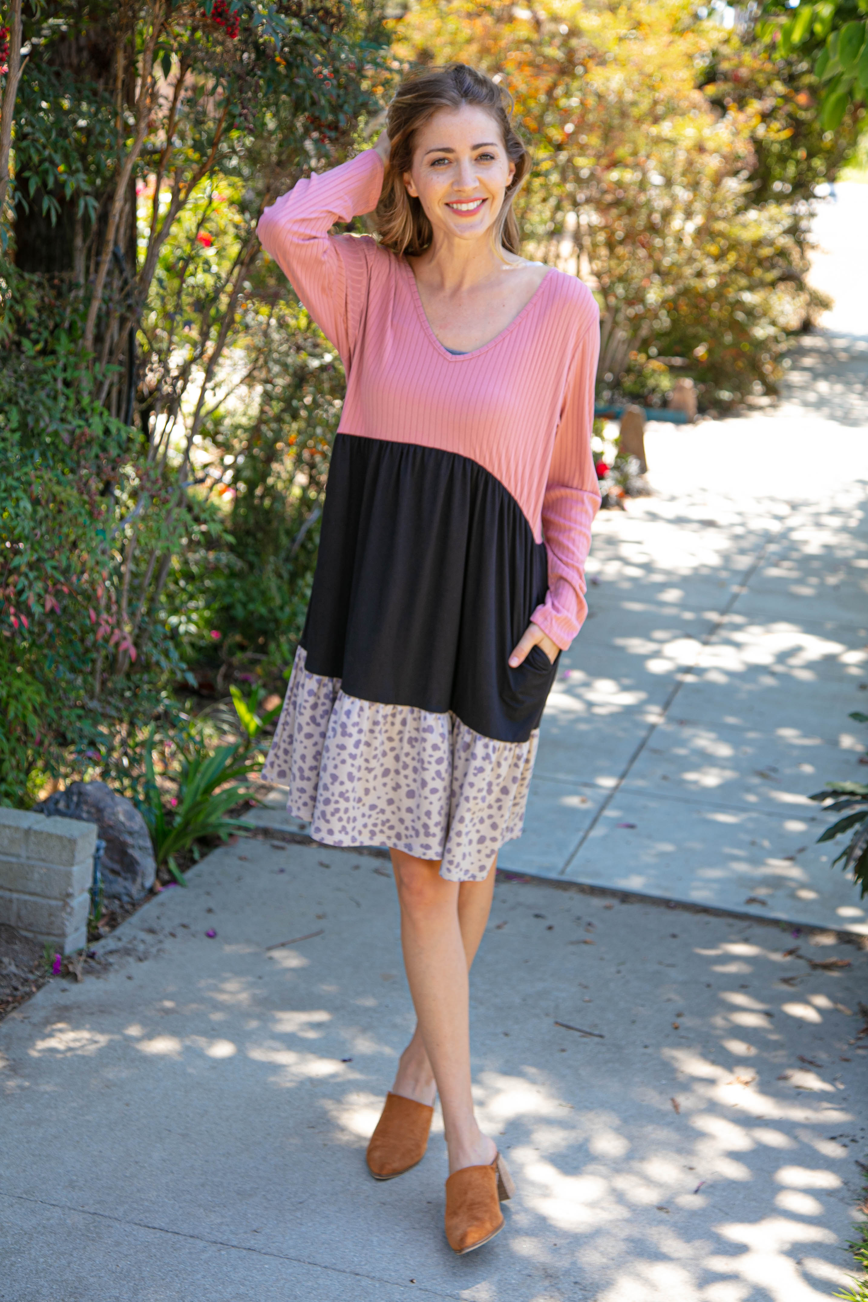 Update your fall dress ensemble with this V neck rib tiered leopard print color block knit dress for a versatile and timeless staple. Pare with leggings. boots or heels.